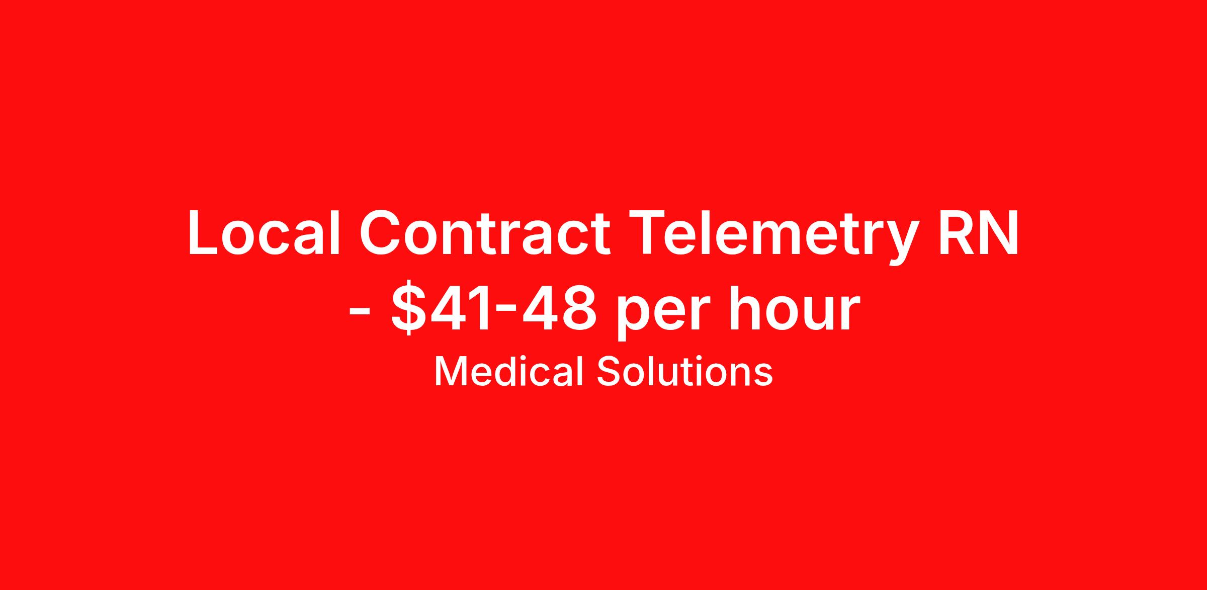 Medical Solutions is seeking a local contract nurse RN Telemetry for a local contract nursing job in Denver, Colorado. Job Description & Requirements Specialty: Telemetry Discipline: RN Duration: 13 weeks 36 hours per week Shift: 12 hours, nights Employment Type: Local Contract We’re seeking talented healthcare professionals whose adventure game is as strong as their clinical game. Those that want flexibility and high pay, we have the positions for you! Some of the industry-leading benefits enjoyed by Medical Solutions travel nurses and travel allied healthcare professionals include: Day One Medical, Dental, and Vision with low premiums Day One 401(k) with Company Contribution Personalized Compensation Packages Paid, Private, Fully Furnished, Pet-Friendly Housing Dedicated Recruiter and 24/7 Customer Care Line Per Diem Allowance and Paid Travel Licensure and Certification Reimbursement Free Liability Coverage Voluntary Benefits: Critical Illness, Hospital Indemnity, Accident, and Pet Insurance Equal Employment Opportunity And More! Estimated pay package based on bill rate at time job was posted. Bill rates can change frequently and without notice. Exact pay package may vary based on guaranteed hours, distance being traveled, and customizations available for travelers. Great Hospital in Colorado is looking for some help in their Med/Surg. Thirteen week contract, night shifts available. Please contact Medical Solutions at today to speak to a Career Consultant. Medical Solutions Job ID 1073904L. Posted job title: Telemetry About Medical Solutions At Medical Solutions, we’re people who care, helping people who care. No matter how you look at it, there’s a whole lot of care going on in our world and that’s just the way we like it. What do we do? Medical Solutions is one of the nation’s largest providers of total workforce solutions in the healthcare industry, connecting nurses and allied health clinicians with hospitals and healthcare systems across the country and around the corner. Through our family of brands, we also serve a segment of clients outside of the healthcare space. And we’re the very best at what we do. You’ll love our culture that’s filled with heart and soul. As a company and employer, we’re sincerely and unabashedly us. We lead as humans first and believe the unique qualities of each team member make us better together. We share a purpose for helping others and the drive to make a difference. And we offer endless opportunities for personal and professional growth, throughout your career. At Medical Solutions, you’ll find a great place to work and a career home. We’ve received Best Places to Work awards, landed top industry awards, and received accolades for the impact we’ve made in business and within our community. But the only way to really get to know us, is to join us. We think you’ll fit right in. Benefits Weekly pay Holiday Pay Guaranteed Hours Continuing Education 401k retirement plan Pet insurance Company provided housing options Cancelation protection Wellness and fitness programs Mileage reimbursement Referral bonus Employee assistance programs Medical benefits Dental benefits Vision benefits Benefits start day 1 License and certification reimbursement Life insurance Discount program