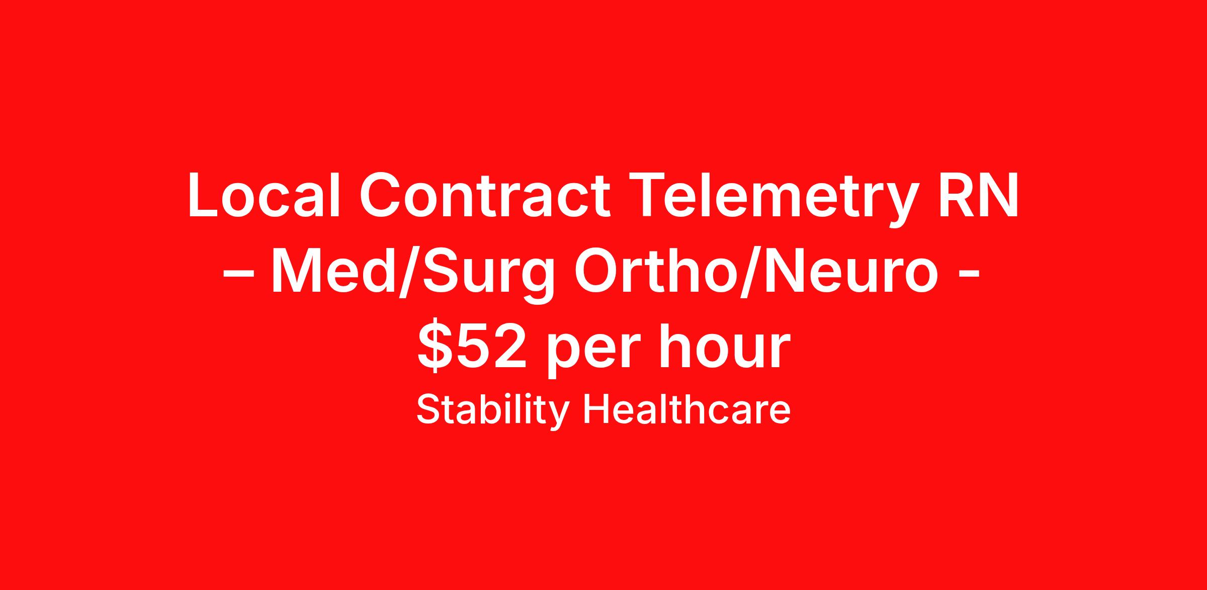 Stability Healthcare is seeking a local contract nurse RN Telemetry Med Surg for a local contract nursing job in Salem, Massachusetts. Job Description & Requirements Specialty: Telemetry Discipline: RN Start Date: 04/19/2026 Duration: 13 weeks 36 hours per week Shift: 12 hours, nights Employment Type: Local Contract Stability Healthcare is looking for a Telemetry RN contract position in Salem, MA. Telemetry nurses care for patients by using medical equipment to monitor blood pressure, heart rate, blood oxygen level, breathing rate, and other vital signs. Commonly, these patients have recently undergone surgery. *$600 travel bonus *Day 1 health insurance with United Healthcare *PTO plan start accruing on day 1, use during contract or cash out at the end! *Guaranteed stipend if facility calls you off *Extra hour bonus earn an additional hourly bonus for working over your weekly contracted hours Stability Job ID L-825531. Pay package is based on 12 hour shifts and 36 hours per week (subject to confirmation) with tax-free stipend amount to be determined. Posted job title: Telemetry About Stability Healthcare Stability Healthcare was founded in 2009, with the mission of becoming the best Travel Nursing Agency in California. We have been rated one of the top travel nursing agencies and offer our nurses the highest paying travel nursing jobs available. We have access to the best travel assignments from 1000’s of facilities. You can start the year off in sunny California, spend the Spring in the Colorado Rockies, enjoy the Summer in the Mid-West, experience the change of seasons in Boston and New York, and hit the beaches of Florida in the winter. Our Nurses work in the best hospitals and health systems in the country. Benefits Guaranteed Hours Benefits start day 1