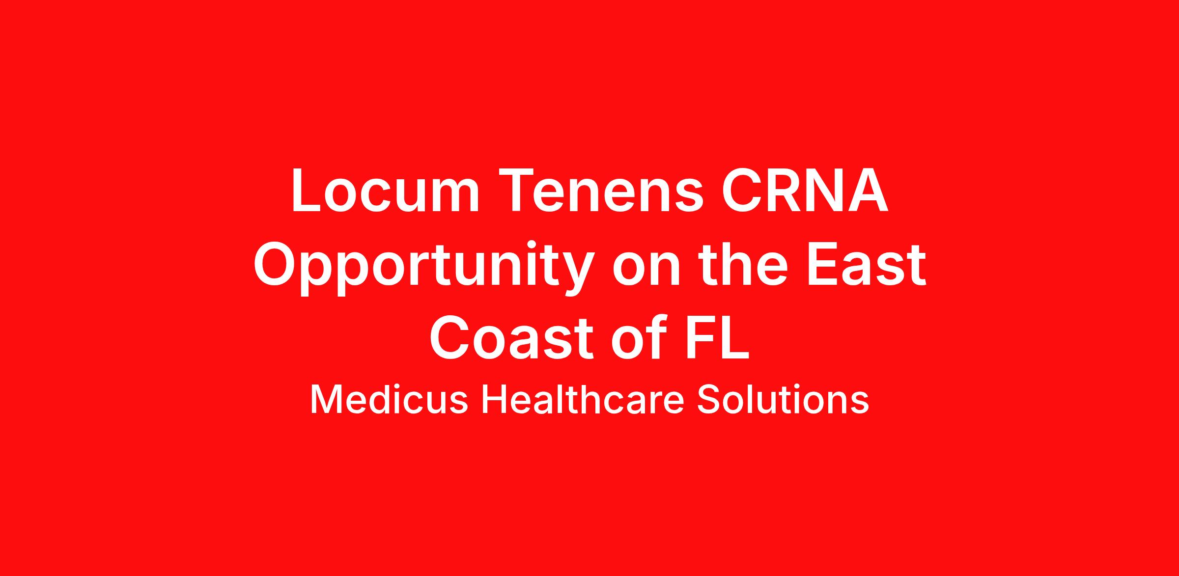 Opportunity Details A medical center on the East Coast of Florida has an opportunity for a skilled CRNA to assist their team. Opportunity Details: Level II Trauma Schedule: 4x 10-hour weekday shifts Bread & butter caseload Medically supervised Must be board-certified Paid travel & expenses During your time off, tour a legendary motorsports speedway, explore a historic lighthouse, and paddle along calm intracoastal waterways. If you are interested in learning more, please apply. CRNA - 72719 Benefits Work with a dedicated recruiter invested in your success. Gain access to leading hospitals and healthcare facilities nationwide. Maximize earnings with competitive pay rates. Have peace of mind with comprehensive malpractice coverage. Receive expert support from our in-house team for licensing and credentialing. Enjoy complimentary travel and lodging arranged by our dedicated travel team. Experience simplified assignment management and timesheet submittals via the Medicus Portal. Unlock exclusive perks by joining the My Medicus Loyalty Program after your first shift. About Medicus Medicus Healthcare Solutions is the 4th largest locum tenens staffing firm in the United States. We have been partnering with top talent in the healthcare industry since 2004. Our team will work with you to find the best opportunity that fits your profile as well as your professional goals, needs, and lifestyle preferences. Florida Ready to join the locum tenens lifestyle? Complete our quick job application to get started!