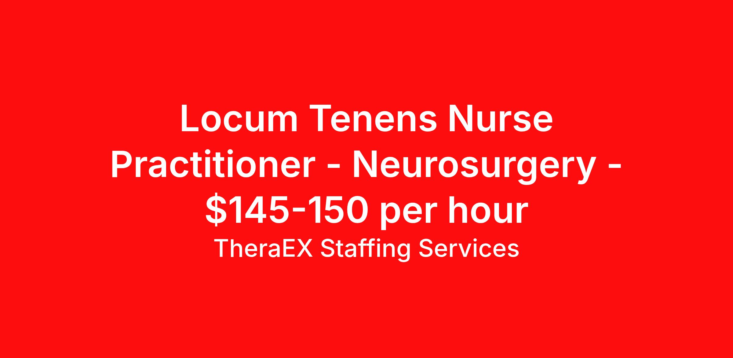TheraEX Staffing Services is seeking a Nurse Practitioner Neurosurgery for a locum tenens job in Redding, California. Job Description & Requirements Specialty: Neurosurgery Discipline: Nurse Practitioner Start Date: 03/22/2026 Duration: 1 weeks Shift: 10 hours, days Employment Type: Locum Tenens Locum Tenens NP/PA – Neuro Trauma / Critical Care Mercy Medical Center Redding | Redding, CA Level II Trauma Center Location: 2175 Rosaline Avenue, Redding, CA 96001 Coverage Type: Locum Tenens EMR: Cerner Care B Position Overview Mercy Medical Center Redding is seeking an experienced Nurse Practitioner or Physician Assistant for Neuro Trauma / Neuro Critical Care coverage. This role supports the neurosurgery service in a Level II Trauma Center , managing critically ill patients with brain, spine, and neck injuries. Candidates must have at least one year of neurosurgery, neurocritical care, or neurology experience . Note: Locum APPs on this service do not assist in surgery . Schedule & Coverage 10‑hour day shifts: 7:00 AM – 5:00 PM No call requirements Coverage Dates Needed: March 22 June 23–25 Clinical Responsibilities Round and evaluate all patients on the neurosurgery service Coordinate care with the neurosurgeon on call Write daily progress notes, consult notes, discharge summaries, and instructions Evaluate new consults Remove drains and perform bedside procedures as privileged Communicate changes in neurological status promptly Collaborate with nursing, case management, social work, and allied health teams Communicate care plans with patients and families Privileges & Procedures Low to Moderate Risk Procedures Laceration repair Peripheral IV access Fracture and dislocation reductions Dressing changes, suture removal, wound debridement Cervical spine clearance Advanced Neuro Procedures Manipulation and removal of EVDs, lumbar drains, subdural drains Removal of intracranial pressure monitors Ordering spinal braces High‑Risk Procedures (Not Required) Intubation, chest tubes, central lines, arterial lines, cardioversion Patient Volume 15–20 ICU patients per provider per day Compensation Hourly Rates $145 per hour Requirements Board Certified NP (ANCC/AANP) or PA (NCCPA) Active California license ACLS required ATLS preferred (not a dealbreaker with strong neuro experience) DEA required Clean malpractice history This opportunity is ideal for experienced APPs seeking high‑acuity neuro‑trauma exposure , day‑only shifts , and a collaborative neurosurgical environment in Northern California. About TheraEX Staffing Services TheraEx Staffing Services is a leading name in healthcare staffing solutions. We enroll talented professionals to provide temporary staff to fill the needs of healthcare facilities across the nation. Benefits Dental benefits Vision benefits 401k retirement plan Health Care FSA Life insurance Sick pay Holiday Pay Medical benefits