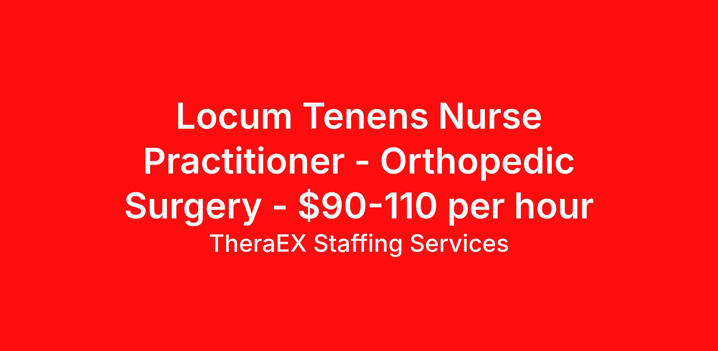 TheraEX Staffing Services is seeking a Nurse Practitioner Orthopedic Surgery for a locum tenens job in Eureka, California. Job Description & Requirements Specialty: Orthopedic Surgery Discipline: Nurse Practitioner Start Date: 06/17/2026 Duration: 26 weeks Shift: 9 hours Employment Type: Locum Tenens Title: Orthopedic Surgery NP/PA (Locum Tenens) Start Date: June 18, 2026 Duration: Ongoing Job Overview We are seeking experienced Nurse Practitioners or Physician Assistants to provide full-time orthopedic APP coverage in both clinic and OR settings. This role includes scheduled clinical hours and call responsibilities. Schedule Mon–Thu: Clinic (8am–5pm) OR (7:30am start; may extend to 3–5pm) Friday: Clinic/OR/Admin (7:30am–5pm) Call: 5–7 days/month 24hr weekend call when scheduled Night Call: 5pm–8am Responsibilities Assist in orthopedic surgeries (trauma-focused preferred) Provide outpatient and inpatient care Manage pre/post-operative patients Participate in call rotation Requirements Active California NP or PA license Active CA DEA BLS certification (required) Minimum 2 years recent orthopedic clinical experience Comfortable in OR clinic settings Case logs required (for surgical experience) Credentialing Estimated timeframe: ~90 days Privileges required prior to start Practice Details Setting: Inpatient & Outpatient Patients per shift: 20–22 EMR: Epic About TheraEX Staffing Services TheraEx Staffing Services is a leading name in healthcare staffing solutions. We enroll talented professionals to provide temporary staff to fill the needs of healthcare facilities across the nation. Benefits Dental benefits Vision benefits 401k retirement plan Health Care FSA Life insurance Sick pay Holiday Pay Medical benefits