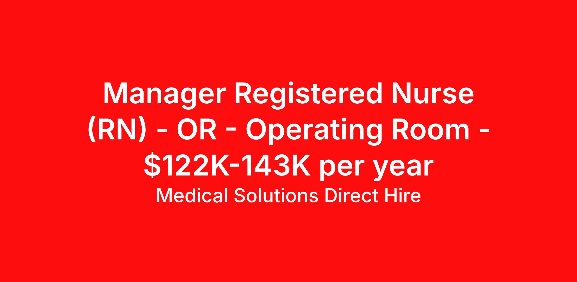 Medical Solutions Direct Hire is seeking a Registered Nurse (RN) OR - Operating Room Manager for a nursing job in Burbank, Illinois. Job Description & Requirements Specialty: OR - Operating Room Discipline: RN Duration: Ongoing 40 hours per week Shift: 8 hours, days Employment Type: Staff Registered Nurse (RN) Manager – General Surgery Location: Evergreen Park, IL Schedule: Full‑time, Days (Mon–Fri, 6:30a–2:30p) On‑Call: 24/7 response required for emergent departmental needs, including weekends & holidays Sign‑On Bonus: $20,000 Compensation: $58.61–$68.95/hour (Salaried; based on experience, skills, and internal equity) Overview A leading healthcare system in the Evergreen Park area is seeking an experienced Registered Nurse Manager to oversee operations within its General Surgery department. This leader will ensure high‑quality patient care, operational excellence, and compliance with organizational and regulatory standards. This role is ideal for an RN with strong OR experience who thrives in a fast‑paced surgical environment and is ready to step into a key leadership position. Key Responsibilities Oversee daily operations of the General Surgery department, ensuring safe, high‑quality patient care Plan, schedule, and evaluate departmental workflows and staffing Lead and support clinical teams, fostering collaboration and professional growth Ensure compliance with organizational policies, accreditation standards, and regulatory requirements Manage departmental budgets, capital resources, and productivity targets Assist in developing and implementing new services aligned with annual business plans Provide 24/7 on‑call leadership support for emergent needs Required Qualifications Bachelor’s Degree in Nursing (BSN) Active Registered Nurse (RN) license in the state of Illinois 3–5 years of progressively responsible clinical or healthcare leadership experience Strong interpersonal, communication, and team‑building skills Operating Room (OR) experience required, both SCRUB and CIRCULATE required Why Join This Team Competitive salary with a $20K sign‑on bonus Comprehensive benefits package Mission‑driven, supportive culture Opportunity to lead a high‑impact surgical department Contact: Matthew Charles About Medical Solutions Direct Hire At Medical Solutions, we’re people who care, helping people who care. No matter how you look at it, there’s a whole lot of care going on in our world and that’s just the way we like it. What do we do? Medical Solutions is one of the nation’s largest providers of total workforce solutions in the healthcare industry, connecting nurses and allied health clinicians with hospitals and healthcare systems across the country and around the corner. Through our family of brands, we also serve a segment of clients outside of the healthcare space. And we’re the very best at what we do. You’ll love our culture that’s filled with heart and soul. As a company and employer, we’re sincerely and unabashedly us. We lead as humans first and believe the unique qualities of each team member make us better together. We share a purpose for helping others and the drive to make a difference. And we offer endless opportunities for personal and professional growth, throughout your career. At Medical Solutions, you’ll find a great place to work and a career home. We’ve received Best Places to Work awards, landed top industry awards, and received accolades for the impact we’ve made in business and within our community. But the only way to really get to know us, is to join us. We think you’ll fit right in.