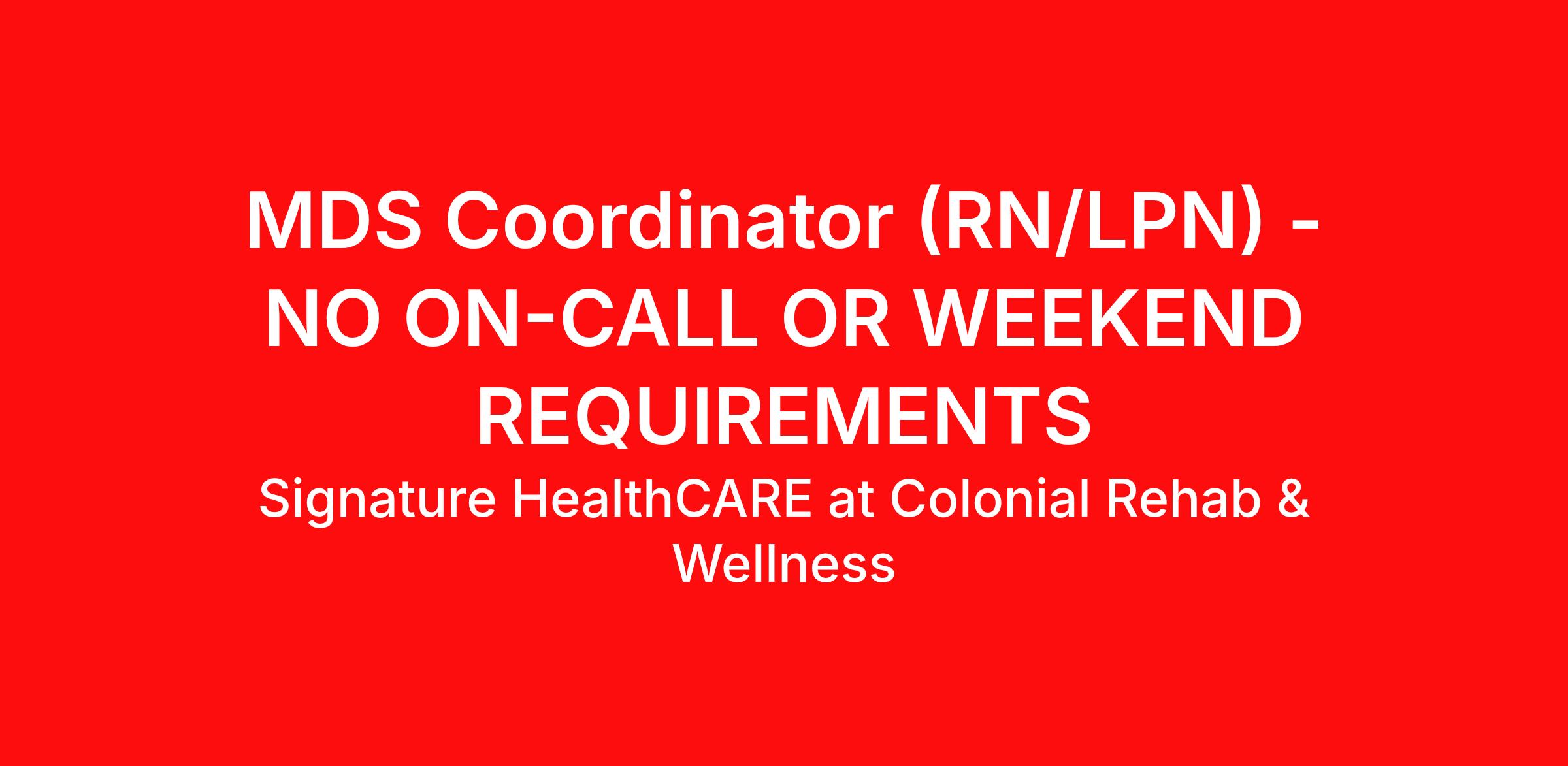 About Us : Signature HealthCARE at Colonial Rehab & Wellness Center is a 69-bed facility that offers a wide array of services from short-term rehabilitation to traditional long-term care. It is our mission as a family-based organization to revolutionize the healthcare industry through a culture of resident centered healthcare services, personalized spirituality, and real quality of life initiatives. About Signature : Signature HealthCARE is a family-based healthcare company offering integrated services across multiple states. Our continuum of care includes skilled nursing, rehabilitation, assisted and memory care, and home-based services supported by innovative technologies like telehealth and Care.ai-enabled solutions. We are committed to advancing person-directed care and quality outcomes. Many of our facilities continue to receive high performance ratings and accreditations. As an award-winning organization recognized over the years by national outlets such as U.S. News & World Report , we take pride in fostering compassionate care environments and being an employer of choice in the healthcare industry. Overview : The ideal MDS Candidate is very detailed orientated, organized, self-motivated, while still being bedside for resident assessment and meeting with families. Knowledgeable of nursing and medical practices and procedures, as well as laws, regulations, and guidelines that pertain to long-term care. How you Will make a Difference: Collect information to complete the MDS using the medical record, bedside assessment, and staff, resident and/or family interviews. Participate in Daily PPS meetings, weekly Medicare meetings, and month end meetings to assure federal billing requirements are met. Review Plan of Care at least quarterly and with each Comprehensive Assessment to assure changes during the quarter are included and updated. Provide ongoing education of the RAI process to all interdisciplinary team members, direct and indirect caregivers, business office, etc. with all changes and as appropriate. What you Need to make a Difference: Registered Nurse with required current state licensure. Minimum three (3) years of clinical experience in a health care setting; long-term care setting preferred. Minimum one (1) year of MDS experience. Our exceptional Benefits Package and Signature Perks include the following and more! (if applicable): Medical, Dental and Vision – Voluntary Life/Disability 401(K) and Roth 401(K) Tuition Forgiveness/Education Reimbursement Pay Advance and Next Day Pay! Paid Time Off (PTO) Our Signature Inspire Foundation offers stakeholder emergency assistance and comprehensive scholarship opportunities Reward & Recognition Program (HEART) Vital Links At Signature HealthCARE, our team members are permitted – no, encouraged – to employ their talents and abilities to solve problems. Our culture is built on three distinct pillars: Learning, Spirituality and Intra-preneurship. Each pillar has its own staff and initiatives, ensuring that our unique culture permeates the entire organization. Come see what the revolution is all about! Signature HealthCARE is an Equal Opportunity-Affirmative Action Employer – Minority / Female / Disability / Veteran and other protected categories Hashtag : LI-MH1 Indeed Hashtag : INDO