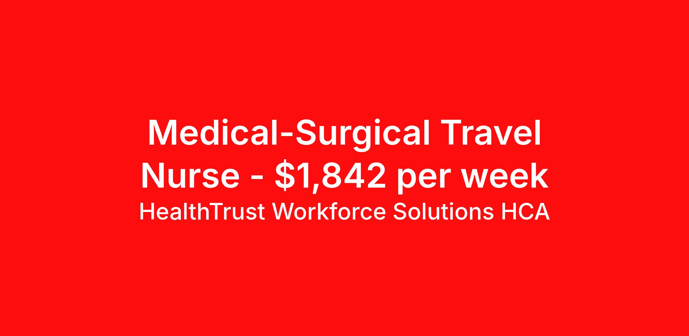 HealthTrust Workforce Solutions HCA is seeking a travel nurse RN Med Surg for a travel nursing job in Augusta, Georgia. Job Description & Requirements Specialty: Med Surg Discipline: RN Start Date: 03/23/2026 Duration: 13 weeks 36 hours per week Shift: 12 hours, nights Employment Type: Travel Entrust Your Career to HealthTrust! At HealthTrust, we believe that healthcare is not defined by the four walls in which it is practiced; it’s defined by its people. We pride ourselves on crafting opportunities that expand skill sets, broaden career horizons, provide economic stability, and cultivate personal growth. HealthTrust Offers: Competitive Pay Packages Guaranteed hours Weekly direct deposit options 401k with Company Match Earn up to $750 for referrals Free Private Furnished Housing or Tax-Free Subsidy To get started, you will need: RN's a minimum of 1 year in specialty Allied 6 months of experience An adventurous spirit and fierce dedication Degree in corresponding specialty as required Appropriate certifications and licensure as needed for the specific position HealthTrust Benefits: Opportunities for a lifetime: When you become a part of the HCA family, you will have exclusive access to more opportunities than any other healthcare system in the nation. At HWS, we help open the door to a lifetime of lasting career opportunities. A culture of care: Our clinicians have made HWS an industry leader for over 25 years. We are passionate about our mission that, above all else, we are committed to the care and improvement of human life. Career Development: As a wholly owned subsidiary of HCA Healthcare, HWS is a preferred partner to thousands of top-performing hospitals. We provide our healthcare professionals with first-priority access to more than 200,000 jobs nationwide. We are uniquely positioned to offer you exclusive and direct access to HCA Healthcare’s vast network of facilities. Let us open the door to nationwide opportunities that fit your lifestyle! We are an equal opportunity employer and value diversity at our company. We do not discriminate on the basis of race, religion, color, national origin, gender, sexual orientation, age, marital status, veteran status, or disability status. Job Requirements Certifications : BLS (Required) HealthTrust Workforce Solutions HCA Job ID 989671. Posted job title: Travel Nurse - Medical-Surgical About HealthTrust Workforce Solutions HCA At HealthTrust Workforce Solutions, healthcare is not just about the four walls of a facility but about the people who provide and receive care. Our focus is on empowering healthcare professionals to deliver exceptional patient experiences by providing them with the necessary skills, tools, and support. We partner with healthcare facilities nationwide to ensure that the right professionals are in the right roles. We prioritize our clinicians by giving them a voice and access to opportunities to fulfill their mission of improving lives by providing quality patient care. We are committed to our core values of Trust, Innovation, Adaptability, Courage, and Accountability. We are dedicated to positively impacting the healthcare industry by providing first-priority access to more than 200,000 jobs nationwide to our healthcare professionals. Join us and be part of the HealthTrust family, where you can make a difference every day. We embrace our changing environment, and we maintain a culture that has a rich tradition of transforming itself to meet the challenges of the future. MISSION STATEMENT While putting great people in the right roles is essential, our mission is far greater. We want our clinicians to be part of the HealthTrust family, where healthcare professionals have a voice and are empowered with the right tools and opportunities to fulfill their personal mission of improving lives. Plus, as a preferred partner to thousands of top-performing hospitals, we provide our healthcare professionals with first-priority access to more than 200,000 jobs nationwide. Benefits Dental benefits Vision benefits Referral bonus Continuing Education Life insurance