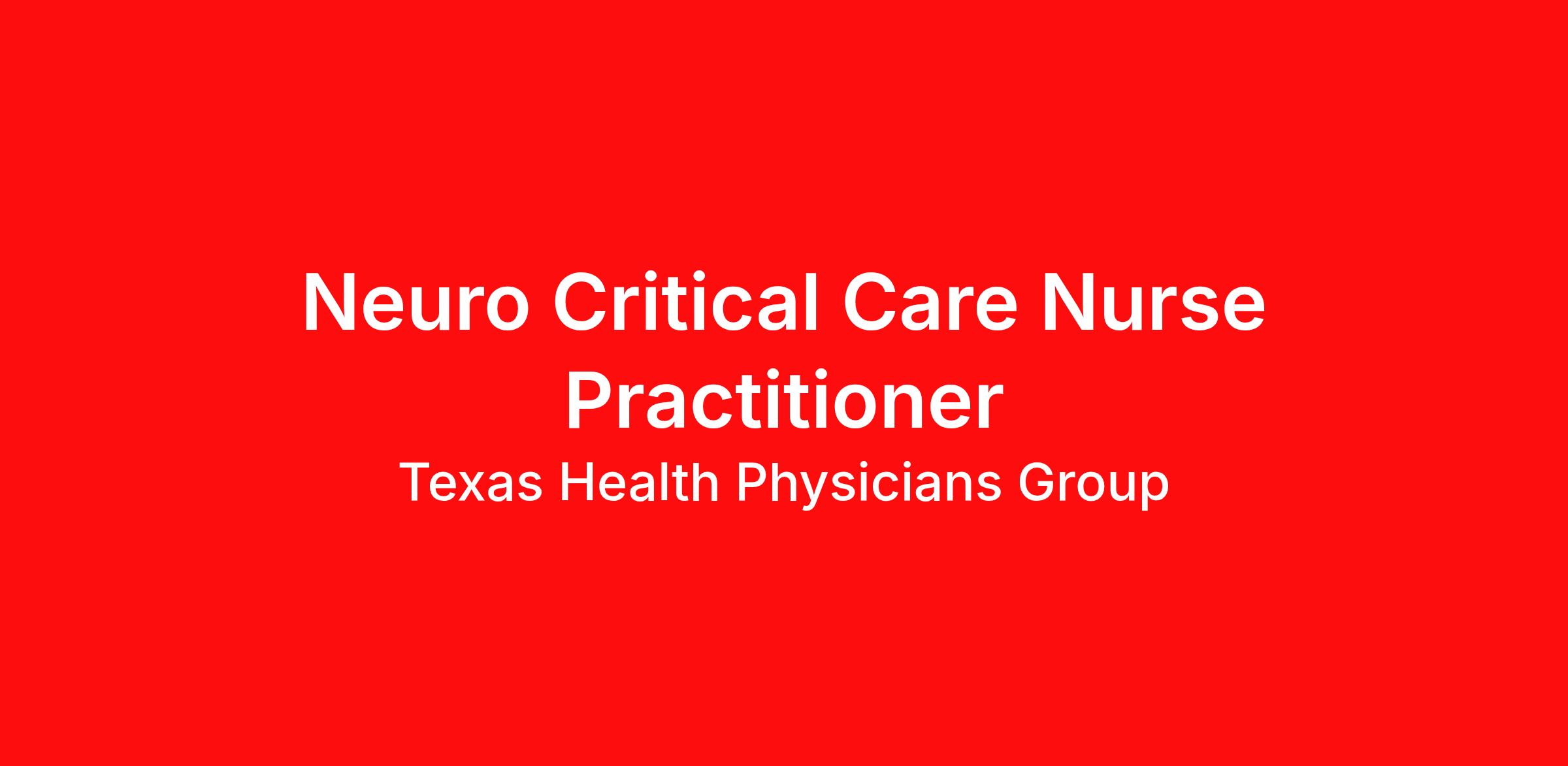 Texas Health Physicians Group is pleased to announce an opening for an Acute Care Nurse Practitioner experienced or interested in Neurocritical Care . Great opportunity to work with a multidisciplinary team of providers offering comprehensive and advanced treatment for a variety of neurological and neurosurgical conditions. Position Details: Full time; nighttime schedule: 7pm-7am, 7 days on, 7 days off Evaluating and managing patients in the Neurosurgical ICU and Step-down units. Electronic Medical Records. Competitive Salary, plus comprehensive benefits package including CME Malpractice and 401K Assist caring for a variety of neurological disorders Provide expert neurological care and innovative techniques to find the best solution for each patient with diverse disorders that attack the brain or spine Requirements Needed to Apply : Active Texas license Acute Care Nurse Practitioner Board Certification Experience in critical care area such as ICU and CCU Degree in NP studies from an approved NP program Interest and experience as a Neurocritical Care NP is highly encouraged to apply