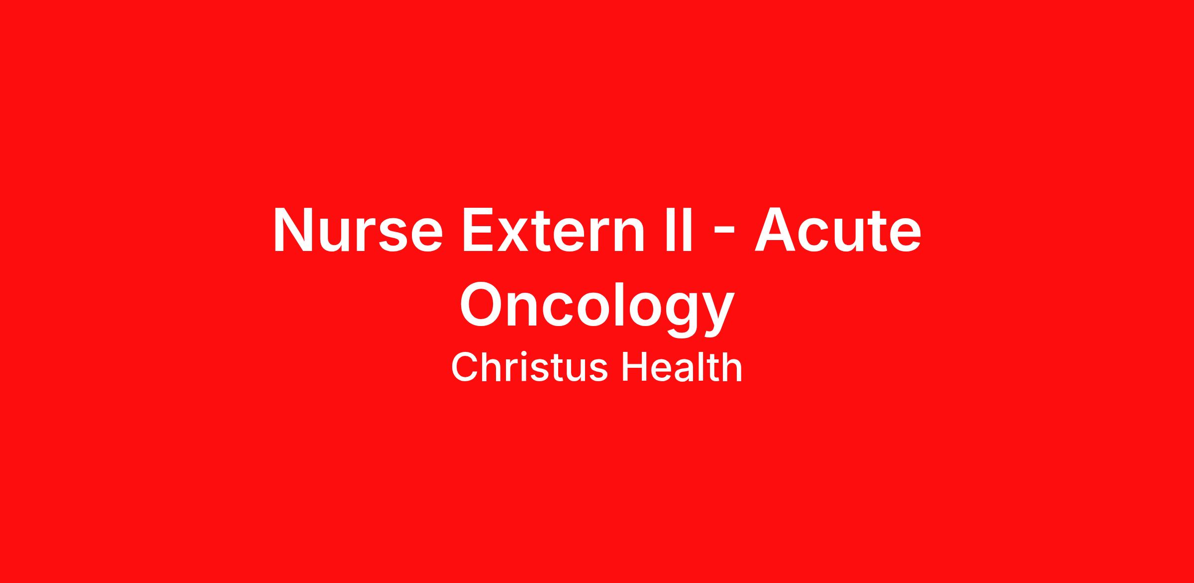 Description Summary: Under the supervision and/or direction of the Registered Nurse, the Nurse Extern II performs various direct patient care activities in accordance with the Nursing Department policies and procedures. The Nurse Extern II can assist with the care of hospitalized patients. The Nurse Extern II may be assigned other functions in accordance with hospital/department policies, procedures, and protocols. Responsibilities: Life-threatening situations are readily identified and reported to the R.N. Initiates and assists with basic life support when needed. Observes/reports unusual symptoms to the nurse, i.e., abnormal V/S; IV site redness, edema; suspicious areas of skin breakdown accurately and promptly. Reports patient/family-related problems, i.e., patient’s dissatisfaction/refusal of nursing care routines; departure from activity advancements or restrictions. Demonstrates a working knowledge of the aseptic/sterile technique. Follows universal precautions. Records information accurately and promptly. Reports change in patient’s condition and/or vital signs. Assists with laboratory specimens, i.e., collection or delivery. Complies with timekeeping system. Accrues no unexcused absences, and no more than three unscheduled absences. Uses supplies and equipment appropriately documents use in the medical record and records charges appropriately. Participates in 80% of prescribed in-service programs and departmental meetings. When unable to attend (20% max) follow up to obtain information discussed. Follows hospital and/or unit policy for dress and personal hygiene. Follows necessary safety precautions, hospital policies, and departmental policies. Attends infection control and safety programs. Follows hospital policies and/or departmental rules. Follows the CHRISTUS Health Guidelines related to the Health Insurance Portability and Accountability Act (HIPAA), designed to prevent or detect unauthorized disclosure of Protected Health Information (PHI). Associate timely completes all required educational requirements. Requirements: Education/Skills Nurse Extern II - students in RN school in clinicals Currently enrolled in a nursing program to obtain either an associate degree or bachelor’s degree to become a registered nurse Must have completed their first hospital clinical rotation and be in good standing in the nursing program Proficient in basic nursing tasks ExperienceSix (6) months of experience in patient care preferred Licenses, Registrations, or CertificationsAHA BLS required within 2 weeks of employment Provides updated transcript at beginning of semester Work Schedule: MULTIPLE SHIFTS AVAILABLE Work Type: Per Diem As Needed