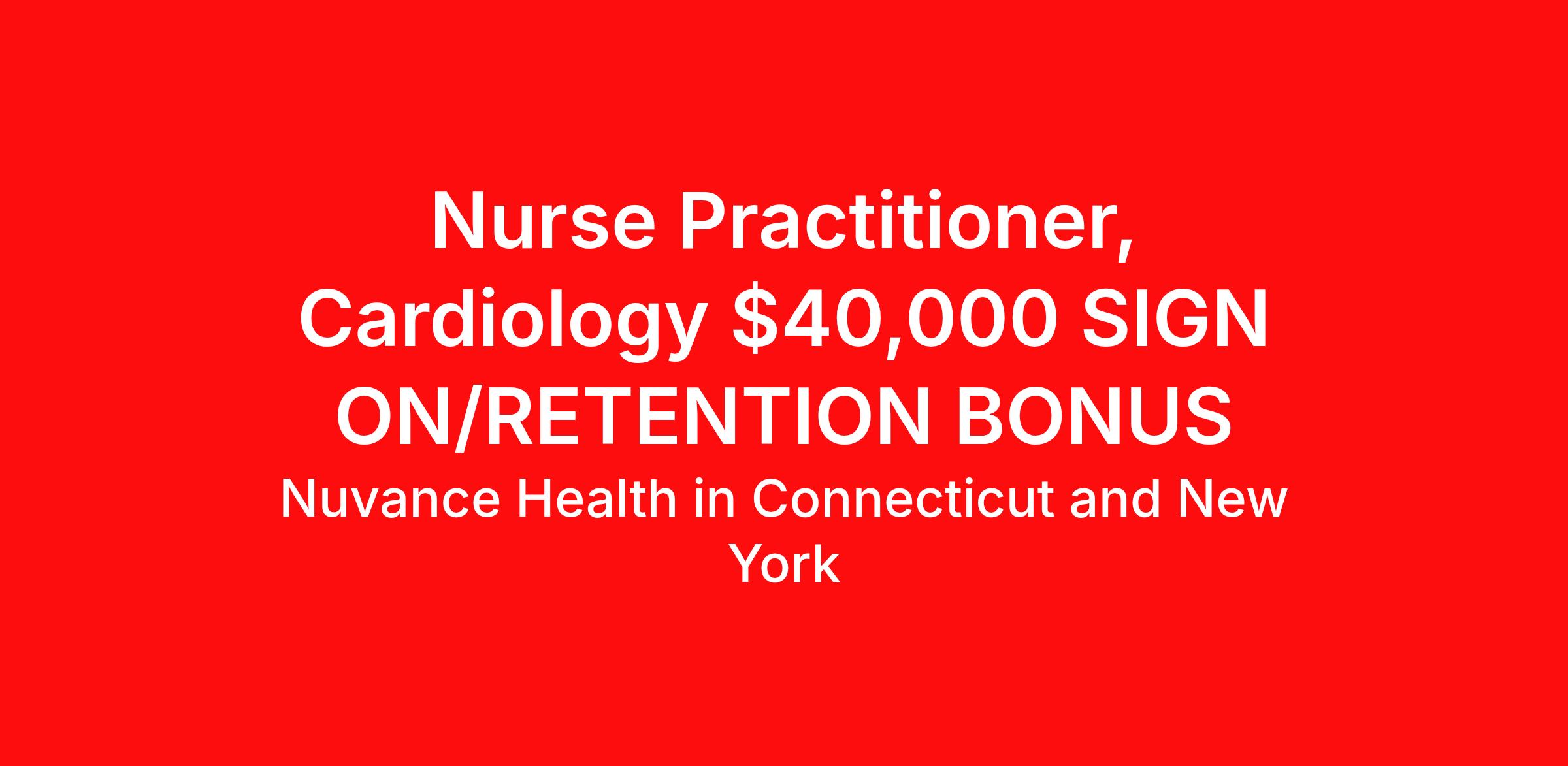 Nurse Practitioner, Cardiology- Full Time, Poughkeepsie, New York (75 minutes from NYC)?Nights Shift $10,000 SIGN ON BONUS The Heart Center is seeking a Full Time board certified Nurse Practitioner to join its established and growing Cardiology Practice (Hudson Valley Cardiovascular Practice, PC). This inpatient position is based at Vassar Brothers Medical Center. This is an excellent employed opportunity at a large community hospital in a beautiful suburban location in the Mid-Hudson Valley region of New York. Job Highlights: Provide care for a high volume, fast paced inpatient Cardiology service in collaboration with an outstanding team of cardiologists Provide coverage for urgent and emergent matters Conduct rounds Perform consultations, admissions and discharges Supervise stress tests Active clinical research program Ample one-on-one teaching from Cardiology attendings 3 – 13 hour shifts per week (night shifts) Collegial group and balanced work/life schedule Highly competitive compensation, comprehensive benefits and generous allowance for CMEs and dues Qualifications: NYS License and Board Certification Cardiology and critical care experience preferred New grads will be considered with relevant experience Located on the banks of the scenic Hudson River, Vassar Brothers Medical Center has a brand new 696,000-square-foot, eight-level inpatient pavilion with 264 private medical/surgical patient rooms and 30 critical care rooms. Vassar provides the leading acute and critical emergency care in the region, including a Level II Trauma Service and Interventional Neuroradiology. Vassar has established centers of excellence in cardiac services, cancer care and women and children's health services. Vassar is consistently ranked as one of the strongest cardiac programs in the United States and one of the Top 100 Heart Hospitals by Modern HealthCare Magazine. Our employed Medical Group, Nuvance Health Medical Practice, includes 1000 physicians and advanced practice providers, serving a geographically broad region throughout Western Connecticut and eastern New York. The Hudson Valley boasts an excellent quality of life. From hiking, biking, and boating, to cafes, art galleries, and local farmers markets, this beautiful suburban location offers endless ways to spend your leisure time. Excellent housing and outstanding schools can be found throughout the region. The Mid-Hudson Valley is also home to many fine colleges and universities, including Vassar College, Bard College, Marist College, SUNY New Paltz, and the Culinary Institute of America. Only 75 minutes north of New York City, the area offers easy commuter access to the city via Metro North and Amtrak rail lines. Our vibrant cities and picturesque villages interweave culture, history and recreation in one of the country's most livable locations. About Northwell Health:? Northwell Health cares for over two million people annually in the New York metro area and beyond. We have: • 28 hospitals and 18,600 aligned physicians? • Over 104,000 employees? • Robust research, academic, and clinical programs? • A culture that values collaboration, innovation, and physician leadership? For more information, please reach out to Stephanie Ramirez, Recruiter with Nuvance Health, at Stephanie.Ramirez @nuvancehealth.org We are a Section 501(c)(3) tax-exempt organization and therefore eligible employees may qualify for forgiveness of certain federal student loans under the Public Service Loan Forgiveness Program. Salary Range: $150,000- $190,000 annually commensurate or relative to experience