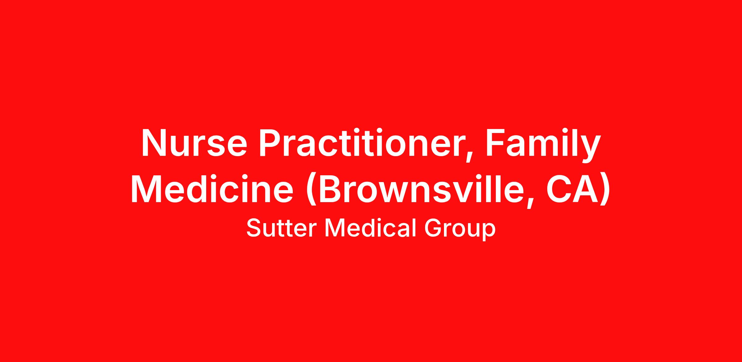 Opportunity Information Sutter North Medical G roup (SNMG) seeks to hire a Nurse Practitioner (NP)/Physician Assistant (PA) to join a well–established Family Medicine practice in Brownsville, CA. Requirements Current California State NP/PA License. We Offer / Join Us and Enjoy Generous compensation with bonus potential Excellent benefits package, including zero–cost medical insurance Paid medical benefits for employees and dependents Award–winning, 100% 401(k) match Relocation assistance up to $20,000 for qualified applicants CME allowance Robust retirement program Advanced practice technology, including EPIC A positive work–life balance and Northern California's natural beauty and lifestyle Medical Group Details Sutter North Medical Group is a 100 member multi–specialty medical group where primary and specialty physicians and staff provide personalized care in offices throughout Yuba–Sutter in Northern California. Affiliation with not–for–profit Sutter Health provides Sutter North Medical Group physicians access to a network of health care professionals, services, and facilities, enabling them to care for patients of all ages with any medical condition. Community Information The Brownsville area has a population of nearly 10,000 and is steadily growing. Tucked away in the Sierra foothills some 35 miles of Marysville, Brownsville residents enjoy beautiful scenery, clean air and a small town atmosphere where people know each other by their first name. Brownsville offers proximity to outdoor activities such as: cross–country skiing, hiking, boating, fishing and more. Equal Opportunity Statement It is the policy of Sutter Health and its partners to provide equal employment for all qualified individuals; to prohibit discrimination in employment because of basis of race, color, creed, religion, marital status, sexual orientation, registered domestic partner status, sex, gender, gender identity or expression, ancestry, national origin (including possession of a driver's license issued to individuals who did not present proof of authorized presence in the U.S.), age, medical condition, physical or mental disability, military or protected veteran status, political affiliation, pregnancy or perceived pregnancy, childbirth, breastfeeding or related medical condition, genetic information or any other characteristic made unlawful by local, state or federal law, ordinance or regulation. We promote the full realization of equal employment opportunities through a positive continuing program within each medical group, company, hospital, department, and service area. Equal employment opportunities apply to every aspect of Sutter's employment policies and practices.
