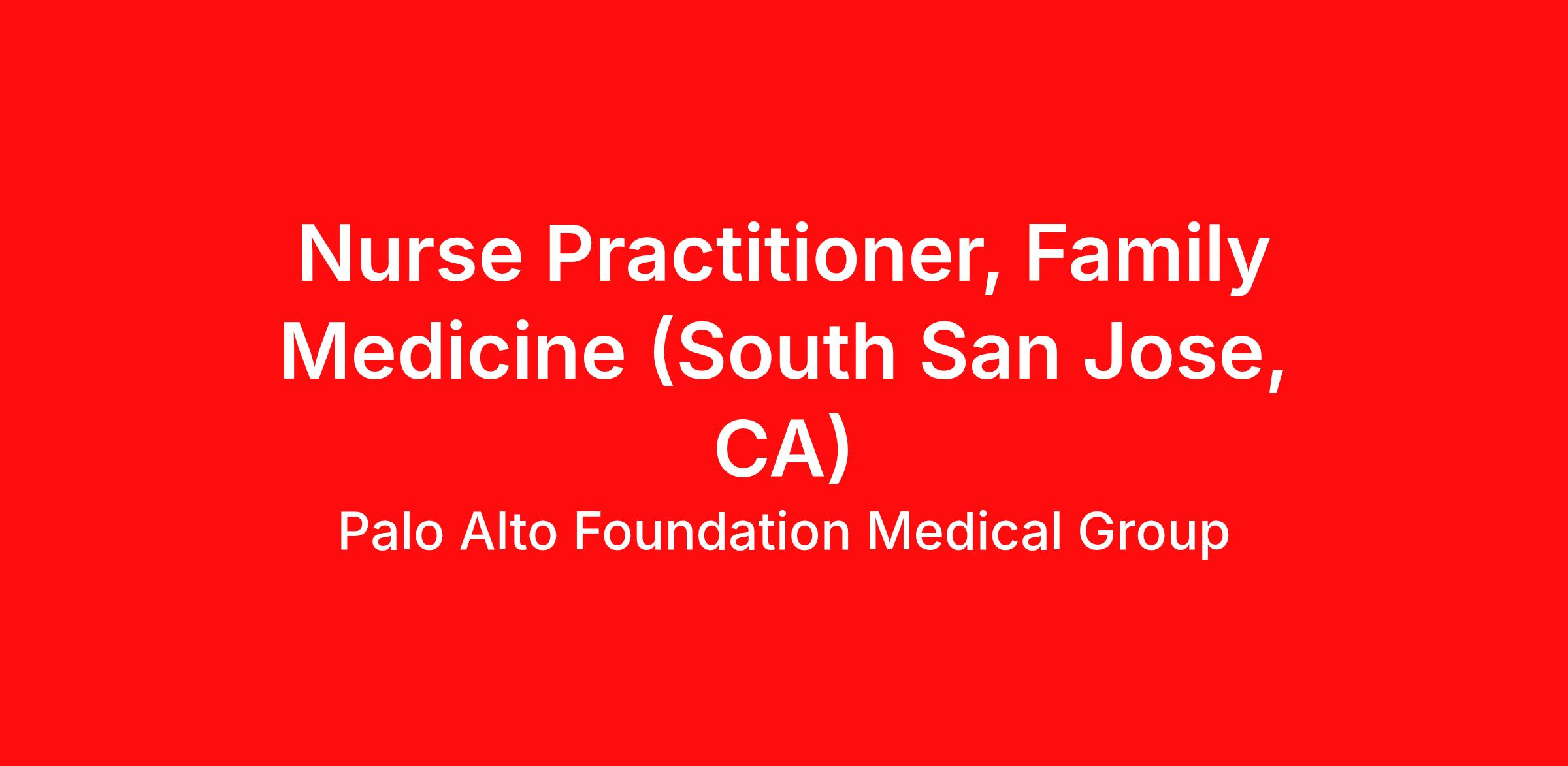 Opportunity Information Palo Alto Foundation Medical Group seeks a full-time, certified Nurse Practitioner or Physician Assistant in Family Medicine. Location: South San Jose, CA Highlights: Resource-rich working environment Schedule designed to promote work/life balance Collaborate with a talented team of on-site primary care clinicians and medical specialists Requirements Requirements: Current California State NP license Current Nurse Practitioner Furnishing Number (NPs) Nurse Practitioner furnishing number of NPs (NPs) CAPA Controlled Substance Certification (PAs) Active DEA registration Preferred: 6 months or more of related primary care experience as an APC We Offer / Join Us and Enjoy Relocation allowance Generous benefits package 401K, HSA Medical Group Details Palo Alto Foundation Medical Group We are one of the largest multi-specialty medical groups in the country, made up of over 2,100 clinicians in 40 specialties, in practices throughout the San Francisco Bay Area. Our organization is nationally recognized for our excellence with multiple awards for quality of care, innovation, and leadership. Palo Alto Foundation Medical Group is affiliated with Palo Alto Medical Foundation, a not-for-profit health care organization, providing operational and administrative support, including the latest technology, allowing physicians to focus on delivering exceptional patient care. Community Information San Jose encompasses a large geographic and cultural portion of San Jose, California , located south of the downtown area. The tenth largest city in the United States , San Jose is nicknamed "Capital of Silicon Valley ." This diverse city is home to a diverse population of one million residents and many visitors. The arts and culture are essential elements in the character and quality of life in the vibrant San José community; its landmarks include the Children's Discovery Museum , SAP Center , Winchester Mystery House and the Tech Museum of Innovation . Equal Opportunity Statement It is the policy of Sutter Health and its partners to provide equal employment for all qualified individuals; to prohibit discrimination in employment because of basis of race, color, creed, religion, marital status, sexual orientation, registered domestic partner status, sex, gender, gender identity or expression, ancestry, national origin (including possession of a driver's license issued to individuals who did not present proof of authorized presence in the U.S.), age, medical condition, physical or mental disability, military or protected veteran status, political affiliation, pregnancy or perceived pregnancy, childbirth, breastfeeding or related medical condition, genetic information or any other characteristic made unlawful by local, state or federal law, ordinance or regulation. We promote the full realization of equal employment opportunities through a positive continuing program within each medical group, company, hospital, department, and service area. Equal employment opportunities apply to every aspect of Sutter's employment policies and practices.