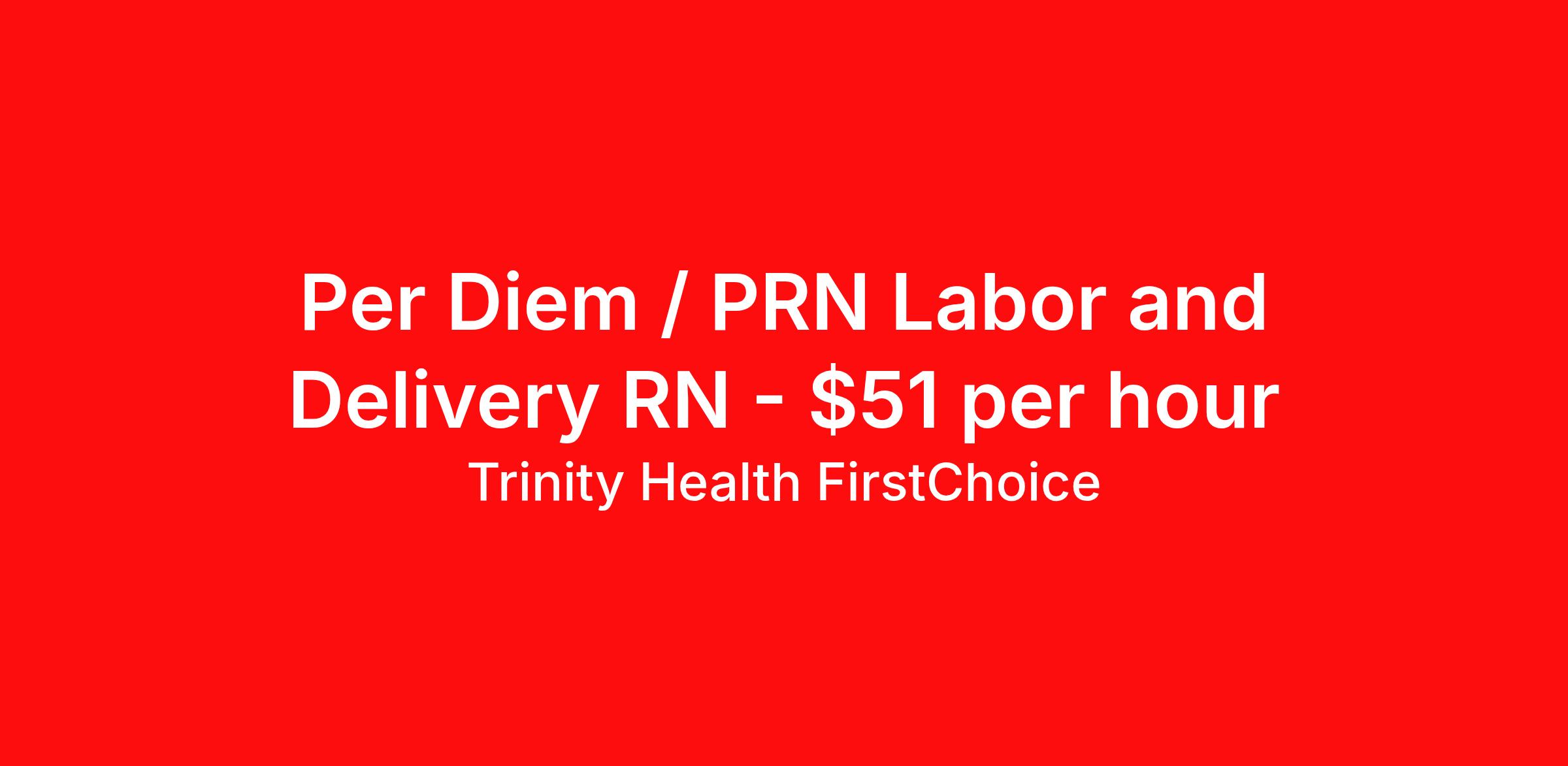 Trinity Health FirstChoice is seeking a per diem / prn nurse RN Labor and Delivery for a per diem / prn nursing job in Ann Arbor, Michigan. Job Description & Requirements Specialty: Labor and Delivery Discipline: RN Start Date: ASAP Duration: Ongoing Shift: days Employment Type: Per Diem Employment Type: Full time Shift: Day Shift Description: Are you an experienced Registered Nurse looking for premium compensation and maximum flexibility? Explore FirstChoice – Trinity Health's mobile staffing solution! FirstChoice RNs are utilized to fill short and long-term assignments, and we need you to be a part of this innovative program! Location: Trinity Health Ann Arbor START DATE : Flexible WEEKS : 0 HOURS : 0 Shift: 7a - 7p Gross Weekly Rate: $51 per hour What you will do: Both day and night shift PRN available. Need to float between Trinity Health Ann Arbor, Trinity Health Oakland and Trinity Health Livonia $51/hr $5/hr for nights and $3/hr for weekends Qualified and willing to float throughout the hospital and/or throughout multiple hospital locations and/or regions Knows, understands, incorporates & demonstrates standard elements of professional practice: Assess, Outcomes Identification / Solutions, Plan, Implement, Evaluate Acts independently & appropriately within license, scope of knowledge & experience in practice area Retains accountability for delegation, choices, decisions & outcomes Collaborates with key stakeholders & contributes to quality & improvement practices & outcomes Exhibits agility & willingness to take on new & additional responsibilities Embraces new ideas & cultural differences while managing competing priorities Minimum Qualifications : Current RN License to practice in the State of Michigan Current American Heart Association BLS Current American Heart Association ACLS NRP Certification EFM Certification NIHSS Certification Minimum 2 years of current experience in L&D Position Highlights and Benefits: Premium Pay Travel and Per Diem opportunities available Variety of Practice Settings Learning Opportunities DailyPay available Opportunity to participate in 403B program Ministry Information: FirstChoice offers rewarding Nursing, Respiratory Therapist, Surgical Technologist, and Health Care Professional travel positions with a flexible schedule to fit your life. FirstChoice travel Health Care Professionals fill critical positions when unforeseen or unplanned circumstances occur; or, when there is a position open due to an extended leave-of-absence. You’ll get to experience a variety of practice settings while traveling within your local region or traveling nationally – your choice! Our Commitment Rooted in our Mission and Core Values, we honor the dignity of every person and recognize the unique perspectives, experiences, and talents each colleague brings. By finding common ground and embracing our differences, we grow stronger together and deliver more compassionate, person-centered care. We are an Equal Opportunity Employer. All qualified applicants will receive consideration for employment without regard to race, color, religion, sex, sexual orientation, gender identity, national origin, disability, veteran status, or any other status protected by federal, state, or local law. Trinity Health FirstChoice Job ID 00648569. Posted job title: Per Diem Registered Nurse, RN, Labor and Delivery About Trinity Health FirstChoice Premium pay FirstChoice offers a rewarding career with significant p remium pay and flexible scheduling to fit your life. FirstChoice h ealthcare travel professionals fill critical positions when unforeseen or unplanned circumstances occur; or, when there is a position open due to an extended leave-of-absence. You’ll get to experience a variety of practice settings while traveling within your local region or traveling nationally – your choice! Healthcare travel professionals, join us in caring for our community, we can't do it without you. FirstChoice exclusively supports facilities within the Trinity Health system meaning you will have a consistent experience between job sites. Your training at one site will apply to other sites within the region and will minimize the time you are spending outside of patient care. We understand that there has been a fundamental shift in the nursing position in recent years and like any other employee, nurses want more options and flexibility in their careers. FirstChoice provides you with both along with the comfort and security of one employer. Benefits of Being a FirstChoice healthcare travel professional: Premium pay Choose your own travel adventure—work in a variety of practice settings Wide range of assignments available Housing and meal stipend Minimum Qualifications/Requirements of a FirstChoice Nurse: Registered nurse with a license in the state(s) you will work Minimum of 2 years, depending on specialty area Cannot hold a concurrent position at a Trinity Health facility Trinity Health is a leading not-for-profit Catholic health system with 92 hospitals and hundreds of primary, specialty and continuing care centers across the United States. Benefits Employee assistance programs 403b retirement plan Discount program