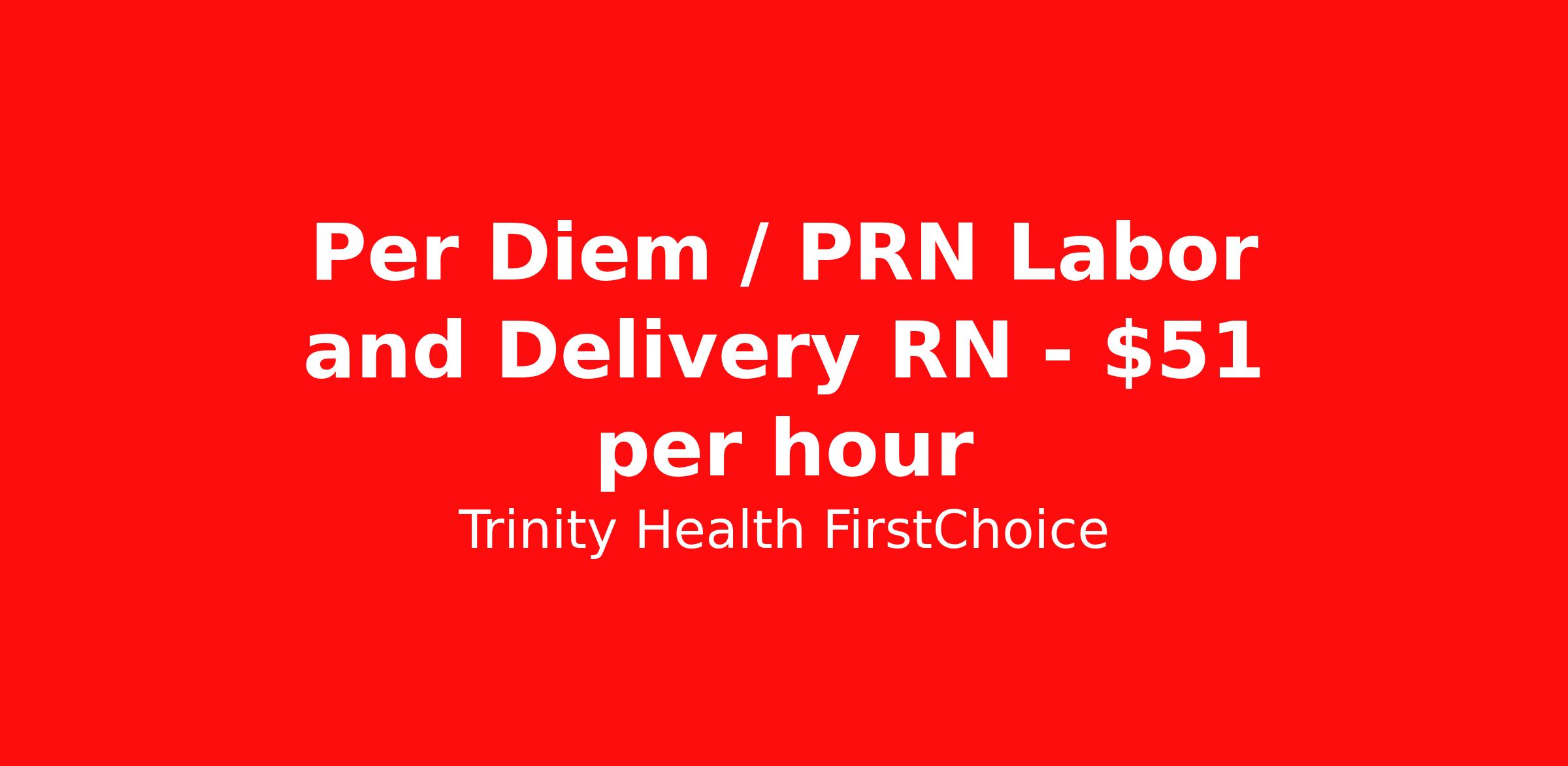 Trinity Health FirstChoice is seeking a per diem / prn nurse RN Labor and Delivery for a per diem / prn nursing job in Ann Arbor, Michigan. Job Description & Requirements Specialty: Labor and Delivery Discipline: RN Start Date: ASAP Duration: Ongoing Shift: days Employment Type: Per Diem Employment Type: Full time Shift: Day Shift Description: Are you an experienced Registered Nurse looking for premium compensation and maximum flexibility? Explore FirstChoice – Trinity Health's mobile staffing solution! FirstChoice RNs are utilized to fill short and long-term assignments, and we need you to be a part of this innovative program! Location: Trinity Health Ann Arbor START DATE : Flexible WEEKS : 0 HOURS : 0 Shift: 7a - 7p Gross Weekly Rate: $51 per hour What you will do: Both day and night shift PRN available. Need to float between Trinity Health Ann Arbor, Trinity Health Oakland and Trinity Health Livonia $51/hr $5/hr for nights and $3/hr for weekends Qualified and willing to float throughout the hospital and/or throughout multiple hospital locations and/or regions Knows, understands, incorporates & demonstrates standard elements of professional practice: Assess, Outcomes Identification / Solutions, Plan, Implement, Evaluate Acts independently & appropriately within license, scope of knowledge & experience in practice area Retains accountability for delegation, choices, decisions & outcomes Collaborates with key stakeholders & contributes to quality & improvement practices & outcomes Exhibits agility & willingness to take on new & additional responsibilities Embraces new ideas & cultural differences while managing competing priorities Minimum Qualifications : Current RN License to practice in the State of Michigan Current American Heart Association BLS Current American Heart Association ACLS NRP Certification EFM Certification NIHSS Certification Minimum 2 years of current experience in L&D Position Highlights and Benefits: Premium Pay Travel and Per Diem opportunities available Variety of Practice Settings Learning Opportunities DailyPay available Opportunity to participate in 403B program Ministry Information: FirstChoice offers rewarding Nursing, Respiratory Therapist, Surgical Technologist, and Health Care Professional travel positions with a flexible schedule to fit your life. FirstChoice travel Health Care Professionals fill critical positions when unforeseen or unplanned circumstances occur; or, when there is a position open due to an extended leave-of-absence. You’ll get to experience a variety of practice settings while traveling within your local region or traveling nationally – your choice! Our Commitment Rooted in our Mission and Core Values, we honor the dignity of every person and recognize the unique perspectives, experiences, and talents each colleague brings. By finding common ground and embracing our differences, we grow stronger together and deliver more compassionate, person-centered care. We are an Equal Opportunity Employer. All qualified applicants will receive consideration for employment without regard to race, color, religion, sex, sexual orientation, gender identity, national origin, disability, veteran status, or any other status protected by federal, state, or local law. Trinity Health FirstChoice Job ID 00648569. Posted job title: Per Diem Registered Nurse, RN, Labor and Delivery About Trinity Health FirstChoice Premium pay FirstChoice offers a rewarding career with significant p remium pay and flexible scheduling to fit your life. FirstChoice h ealthcare travel professionals fill critical positions when unforeseen or unplanned circumstances occur; or, when there is a position open due to an extended leave-of-absence. You’ll get to experience a variety of practice settings while traveling within your local region or traveling nationally – your choice! Healthcare travel professionals, join us in caring for our community, we can't do it without you. FirstChoice exclusively supports facilities within the Trinity Health system meaning you will have a consistent experience between job sites. Your training at one site will apply to other sites within the region and will minimize the time you are spending outside of patient care. We understand that there has been a fundamental shift in the nursing position in recent years and like any other employee, nurses want more options and flexibility in their careers. FirstChoice provides you with both along with the comfort and security of one employer. Benefits of Being a FirstChoice healthcare travel professional: Premium pay Choose your own travel adventure—work in a variety of practice settings Wide range of assignments available Housing and meal stipend Minimum Qualifications/Requirements of a FirstChoice Nurse: Registered nurse with a license in the state(s) you will work Minimum of 2 years, depending on specialty area Cannot hold a concurrent position at a Trinity Health facility Trinity Health is a leading not-for-profit Catholic health system with 92 hospitals and hundreds of primary, specialty and continuing care centers across the United States. Benefits Employee assistance programs 403b retirement plan Discount program