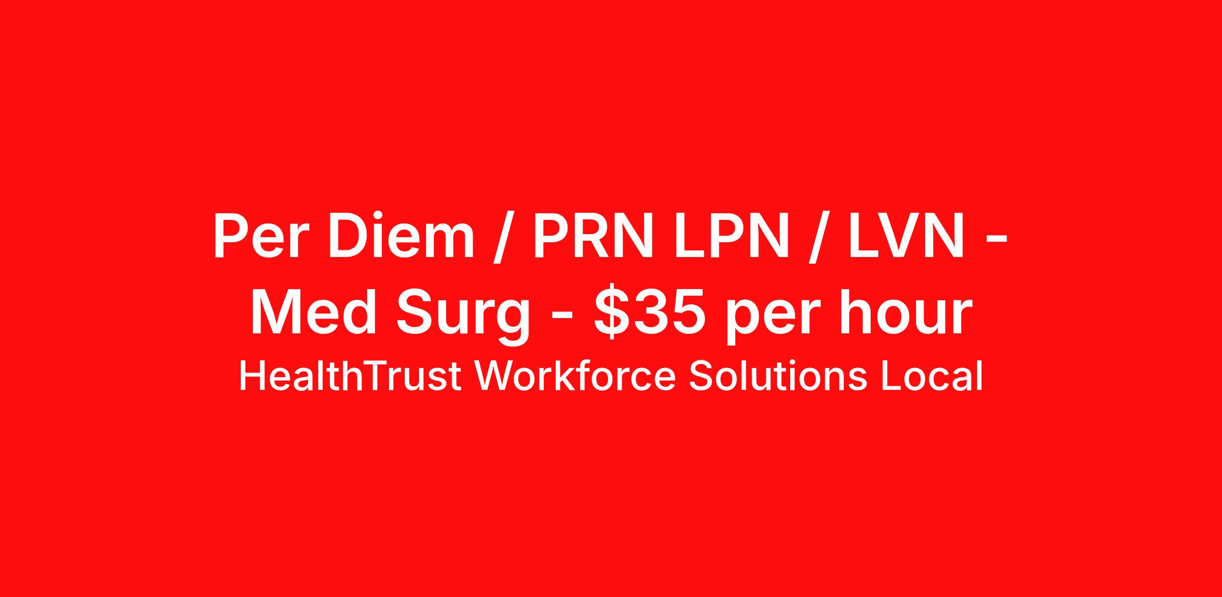 HealthTrust Workforce Solutions Local is seeking a LPN / LVN Med Surg for a per diem / prn job in Hendersonville, Tennessee. Job Description & Requirements Specialty: Med Surg Discipline: LPN / LVN Start Date: 04/06/2026 Duration: Ongoing Employment Type: Per Diem Posted rates reflects the maximum rate, including night and weekend shift differentials Entrust Your Career to HealthTrust! At HealthTrust, we believe that healthcare is not defined by the four walls in which it is practiced; it’s defined by its people. We pride ourselves on crafting opportunities that expand skill sets, broaden career horizons, provide economic stability, and cultivate personal growth. HealthTrust Offers: Getting to know HCA facilities within 50mi of home zip code Self scheduling through our Mobile GO HWS App Minimum of just three shifts a month, however, you can work more! 401K Matching Weekly pay every Friday Not required to work weekends Not Required to work holidays To get started, you will need: RN's a minimum of 1 year in specialty Allied 6 months of experience An adventurous spirit and fierce dedication Degree in corresponding specialty as required Appropriate certifications for the specific position HealthTrust Benefits: Opportunities for a lifetime: When you become a part of the HCA family, you will have exclusive access to more opportunities than any other healthcare system in the nation. At HWS, we help open the door to a lifetime of lasting career opportunities. A culture of care: Our clinicians have made HWS an industry leader for over 25 years. We are passionate about our mission that, above all else, we are committed to the care and improvement of human life. Career Development: As a wholly owned subsidiary of HCA Healthcare, HWS is a preferred partner to thousands of top-performing hospitals. We provide our healthcare professionals with first-priority access to more than 200,000 jobs nationwide. We are uniquely positioned to offer you exclusive and direct access to HCA Healthcare’s vast network of facilities. Let us open the door to nationwide opportunities that fit your lifestyle! We are an equal opportunity employer and value diversity at our company. We do not discriminate on the basis of race, religion, color, national origin, gender, sexual orientation, age, marital status, veteran status, or disability status. Job Requirements Certifications IV Therapy (Required) BLS (Required) HealthTrust Workforce Solutions Per Diem Job ID 432680. Posted job title: Per Diem LPN/LVN - Medical-Surgical