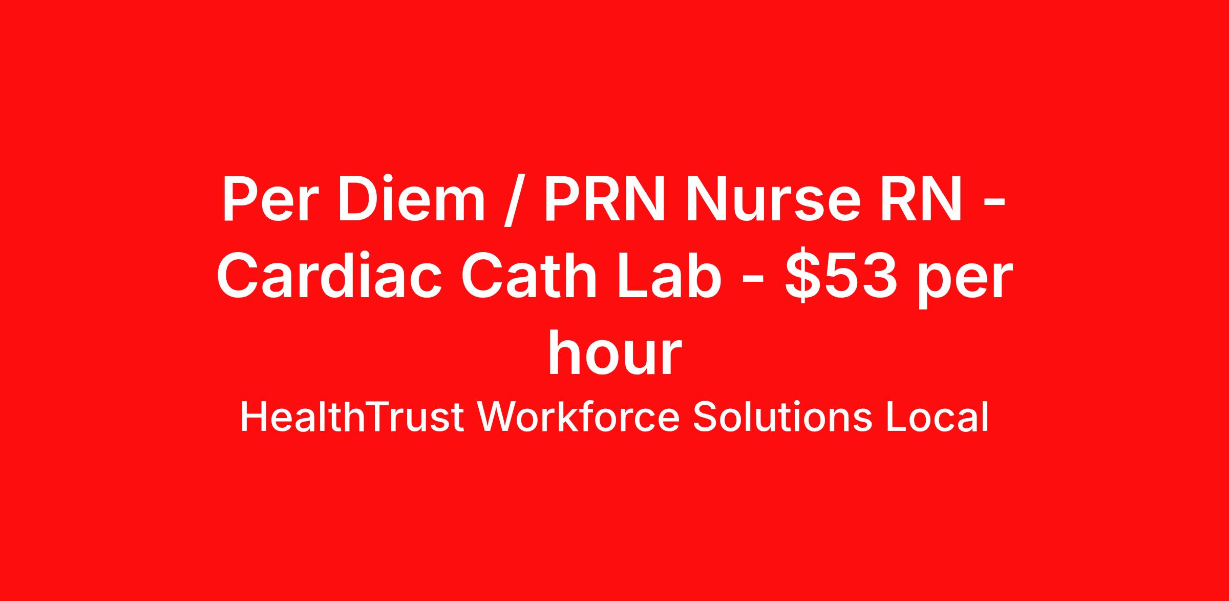 HealthTrust Workforce Solutions Local is seeking a per diem / prn nurse RN Cardiac Cath Lab for a per diem / prn nursing job in Largo, Florida. Job Description & Requirements Specialty: Cardiac Cath Lab Discipline: RN Duration: Ongoing Employment Type: Per Diem Posted rates reflects the maximum rate, including night and weekend shift differentials Entrust Your Career to HealthTrust! At HealthTrust, we believe that healthcare is not defined by the four walls in which it is practiced; it’s defined by its people. We pride ourselves on crafting opportunities that expand skill sets, broaden career horizons, provide economic stability, and cultivate personal growth. HealthTrust Offers: Getting to know HCA facilities within 50mi of home zip code Self scheduling through our Mobile GO HWS App Minimum of just three shifts a month, however, you can work more! 401K Matching Weekly pay every Friday Not required to work weekends Not Required to work holidays To get started, you will need: RN's a minimum of 1 year in specialty Allied 6 months of experience An adventurous spirit and fierce dedication Degree in corresponding specialty as required Appropriate certifications for the specific position HealthTrust Benefits: Opportunities for a lifetime: When you become a part of the HCA family, you will have exclusive access to more opportunities than any other healthcare system in the nation. At HWS, we help open the door to a lifetime of lasting career opportunities. A culture of care: Our clinicians have made HWS an industry leader for over 25 years. We are passionate about our mission that, above all else, we are committed to the care and improvement of human life. Career Development: As a wholly owned subsidiary of HCA Healthcare, HWS is a preferred partner to thousands of top-performing hospitals. We provide our healthcare professionals with first-priority access to more than 200,000 jobs nationwide. We are uniquely positioned to offer you exclusive and direct access to HCA Healthcare’s vast network of facilities. Let us open the door to nationwide opportunities that fit your lifestyle! We are an equal opportunity employer and value diversity at our company. We do not discriminate on the basis of race, religion, color, national origin, gender, sexual orientation, age, marital status, veteran status, or disability status. Job Requirements Certifications ACLS (Required) BLS (Required) HealthTrust Workforce Solutions Per Diem Job ID 829466. Posted job title: Per Diem Nurse - Cath Lab