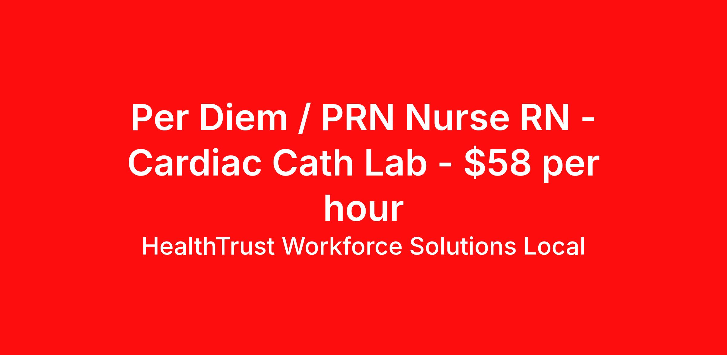 HealthTrust Workforce Solutions Local is seeking a per diem / prn nurse RN Cardiac Cath Lab for a per diem / prn nursing job in Margate, Florida. Job Description & Requirements Specialty: Cardiac Cath Lab Discipline: RN Duration: Ongoing Employment Type: Per Diem Posted rates reflects the maximum rate, including night and weekend shift differentials Entrust Your Career to HealthTrust! At HealthTrust, we believe that healthcare is not defined by the four walls in which it is practiced; it’s defined by its people. We pride ourselves on crafting opportunities that expand skill sets, broaden career horizons, provide economic stability, and cultivate personal growth. HealthTrust Offers: Getting to know HCA facilities within 50mi of home zip code Self scheduling through our Mobile GO HWS App Minimum of just three shifts a month, however, you can work more! 401K Matching Weekly pay every Friday Not required to work weekends Not Required to work holidays To get started, you will need: RN's a minimum of 1 year in specialty Allied 6 months of experience An adventurous spirit and fierce dedication Degree in corresponding specialty as required Appropriate certifications for the specific position HealthTrust Benefits: Opportunities for a lifetime: When you become a part of the HCA family, you will have exclusive access to more opportunities than any other healthcare system in the nation. At HWS, we help open the door to a lifetime of lasting career opportunities. A culture of care: Our clinicians have made HWS an industry leader for over 25 years. We are passionate about our mission that, above all else, we are committed to the care and improvement of human life. Career Development: As a wholly owned subsidiary of HCA Healthcare, HWS is a preferred partner to thousands of top-performing hospitals. We provide our healthcare professionals with first-priority access to more than 200,000 jobs nationwide. We are uniquely positioned to offer you exclusive and direct access to HCA Healthcare’s vast network of facilities. Let us open the door to nationwide opportunities that fit your lifestyle! We are an equal opportunity employer and value diversity at our company. We do not discriminate on the basis of race, religion, color, national origin, gender, sexual orientation, age, marital status, veteran status, or disability status. Job Requirements Certifications ACLS (Required) BLS (Required) HealthTrust Workforce Solutions Per Diem Job ID 967214. Posted job title: Per Diem Nurse - Cath Lab