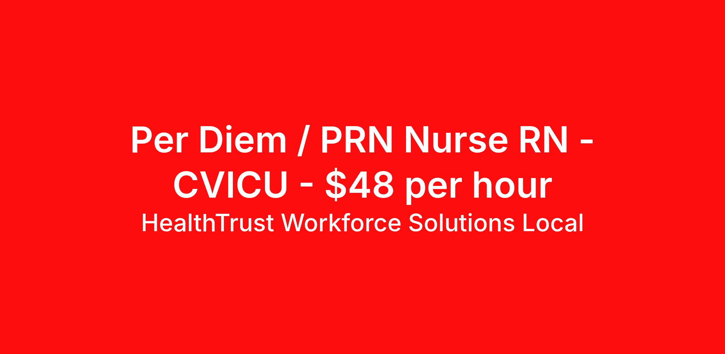HealthTrust Workforce Solutions Local is seeking a per diem / prn nurse RN CVICU for a per diem / prn nursing job in Tallahassee, Florida. Job Description & Requirements Specialty: CVICU Discipline: RN Duration: Ongoing Employment Type: Per Diem Posted rates reflects the maximum rate, including night and weekend shift differentials Entrust Your Career to HealthTrust! At HealthTrust, we believe that healthcare is not defined by the four walls in which it is practiced; it’s defined by its people. We pride ourselves on crafting opportunities that expand skill sets, broaden career horizons, provide economic stability, and cultivate personal growth. HealthTrust Offers: Getting to know HCA facilities within 50mi of home zip code Self scheduling through our Mobile GO HWS App Minimum of just three shifts a month, however, you can work more! 401K Matching Weekly pay every Friday Not required to work weekends Not Required to work holidays To get started, you will need: RN's a minimum of 1 year in specialty Allied 6 months of experience An adventurous spirit and fierce dedication Degree in corresponding specialty as required Appropriate certifications for the specific position HealthTrust Benefits: Opportunities for a lifetime: When you become a part of the HCA family, you will have exclusive access to more opportunities than any other healthcare system in the nation. At HWS, we help open the door to a lifetime of lasting career opportunities. A culture of care: Our clinicians have made HWS an industry leader for over 25 years. We are passionate about our mission that, above all else, we are committed to the care and improvement of human life. Career Development: As a wholly owned subsidiary of HCA Healthcare, HWS is a preferred partner to thousands of top-performing hospitals. We provide our healthcare professionals with first-priority access to more than 200,000 jobs nationwide. We are uniquely positioned to offer you exclusive and direct access to HCA Healthcare’s vast network of facilities. Let us open the door to nationwide opportunities that fit your lifestyle! We are an equal opportunity employer and value diversity at our company. We do not discriminate on the basis of race, religion, color, national origin, gender, sexual orientation, age, marital status, veteran status, or disability status. Job Requirements Certifications ACLS (Required) NIHSS (Required) BLS (Required) HealthTrust Workforce Solutions Per Diem Job ID 940245. Posted job title: Per Diem Nurse - Cardiac ICU