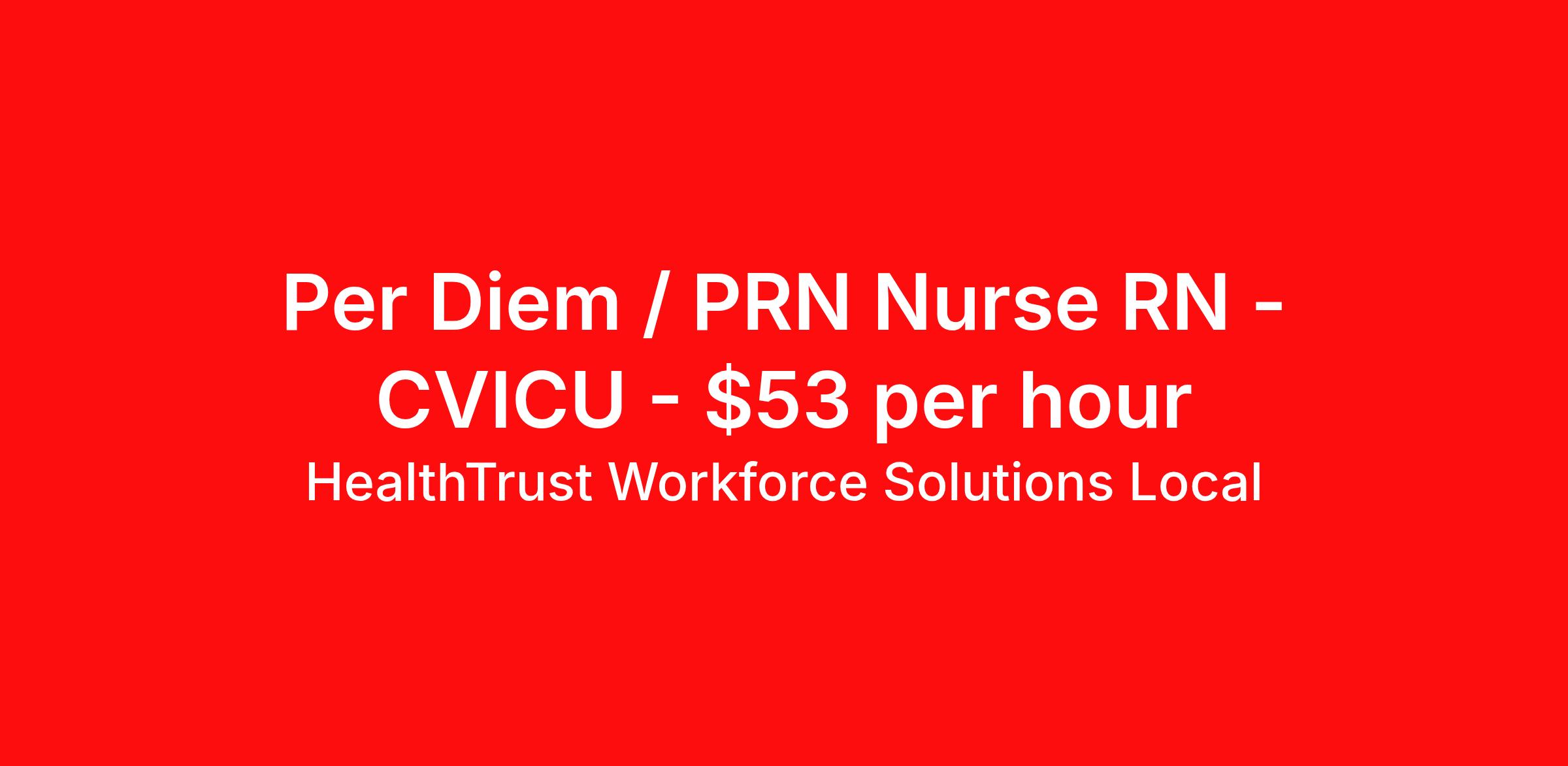 HealthTrust Workforce Solutions Local is seeking a per diem / prn nurse RN CVICU for a per diem / prn nursing job in Asheville, North Carolina. Job Description & Requirements Specialty: CVICU Discipline: RN Start Date: 04/06/2026 Duration: Ongoing Employment Type: Per Diem Posted rates reflects the maximum rate, including night and weekend shift differentials Entrust Your Career to HealthTrust! At HealthTrust, we believe that healthcare is not defined by the four walls in which it is practiced; it’s defined by its people. We pride ourselves on crafting opportunities that expand skill sets, broaden career horizons, provide economic stability, and cultivate personal growth. HealthTrust Offers: Getting to know HCA facilities within 50mi of home zip code Self scheduling through our Mobile GO HWS App Minimum of just three shifts a month, however, you can work more! 401K Matching Weekly pay every Friday Not required to work weekends Not Required to work holidays To get started, you will need: RN's a minimum of 1 year in specialty Allied 6 months of experience An adventurous spirit and fierce dedication Degree in corresponding specialty as required Appropriate certifications for the specific position HealthTrust Benefits: Opportunities for a lifetime: When you become a part of the HCA family, you will have exclusive access to more opportunities than any other healthcare system in the nation. At HWS, we help open the door to a lifetime of lasting career opportunities. A culture of care: Our clinicians have made HWS an industry leader for over 25 years. We are passionate about our mission that, above all else, we are committed to the care and improvement of human life. Career Development: As a wholly owned subsidiary of HCA Healthcare, HWS is a preferred partner to thousands of top-performing hospitals. We provide our healthcare professionals with first-priority access to more than 200,000 jobs nationwide. We are uniquely positioned to offer you exclusive and direct access to HCA Healthcare’s vast network of facilities. Let us open the door to nationwide opportunities that fit your lifestyle! We are an equal opportunity employer and value diversity at our company. We do not discriminate on the basis of race, religion, color, national origin, gender, sexual orientation, age, marital status, veteran status, or disability status. Job Requirements Certifications ACLS (Required) NIHSS (Required) BLS (Required) HealthTrust Workforce Solutions Per Diem Job ID 420259. Posted job title: Per Diem Nurse - Cardiac ICU