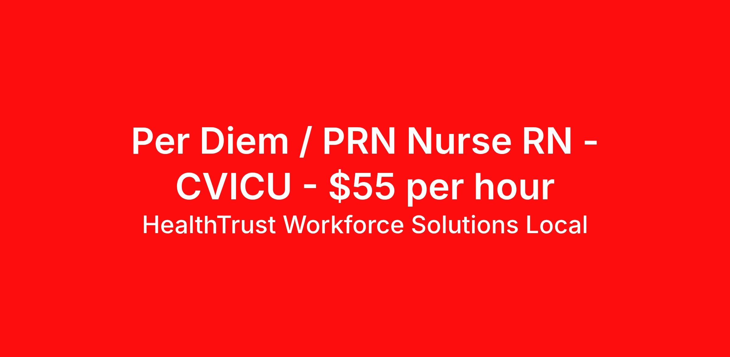 HealthTrust Workforce Solutions Local is seeking a per diem / prn nurse RN CVICU for a per diem / prn nursing job in West Bradenton, Florida. Job Description & Requirements Specialty: CVICU Discipline: RN Start Date: 04/06/2026 Duration: Ongoing Employment Type: Per Diem Posted rates reflects the maximum rate, including night and weekend shift differentials Entrust Your Career to HealthTrust! At HealthTrust, we believe that healthcare is not defined by the four walls in which it is practiced; it’s defined by its people. We pride ourselves on crafting opportunities that expand skill sets, broaden career horizons, provide economic stability, and cultivate personal growth. HealthTrust Offers: Getting to know HCA facilities within 50mi of home zip code Self scheduling through our Mobile GO HWS App Minimum of just three shifts a month, however, you can work more! 401K Matching Weekly pay every Friday Not required to work weekends Not Required to work holidays To get started, you will need: RN's a minimum of 1 year in specialty Allied 6 months of experience An adventurous spirit and fierce dedication Degree in corresponding specialty as required Appropriate certifications for the specific position HealthTrust Benefits: Opportunities for a lifetime: When you become a part of the HCA family, you will have exclusive access to more opportunities than any other healthcare system in the nation. At HWS, we help open the door to a lifetime of lasting career opportunities. A culture of care: Our clinicians have made HWS an industry leader for over 25 years. We are passionate about our mission that, above all else, we are committed to the care and improvement of human life. Career Development: As a wholly owned subsidiary of HCA Healthcare, HWS is a preferred partner to thousands of top-performing hospitals. We provide our healthcare professionals with first-priority access to more than 200,000 jobs nationwide. We are uniquely positioned to offer you exclusive and direct access to HCA Healthcare’s vast network of facilities. Let us open the door to nationwide opportunities that fit your lifestyle! We are an equal opportunity employer and value diversity at our company. We do not discriminate on the basis of race, religion, color, national origin, gender, sexual orientation, age, marital status, veteran status, or disability status. Job Requirements Certifications ACLS (Required) NIHSS (Required) BLS (Required) HealthTrust Workforce Solutions Per Diem Job ID 407807. Posted job title: Per Diem Nurse - Cardiac ICU