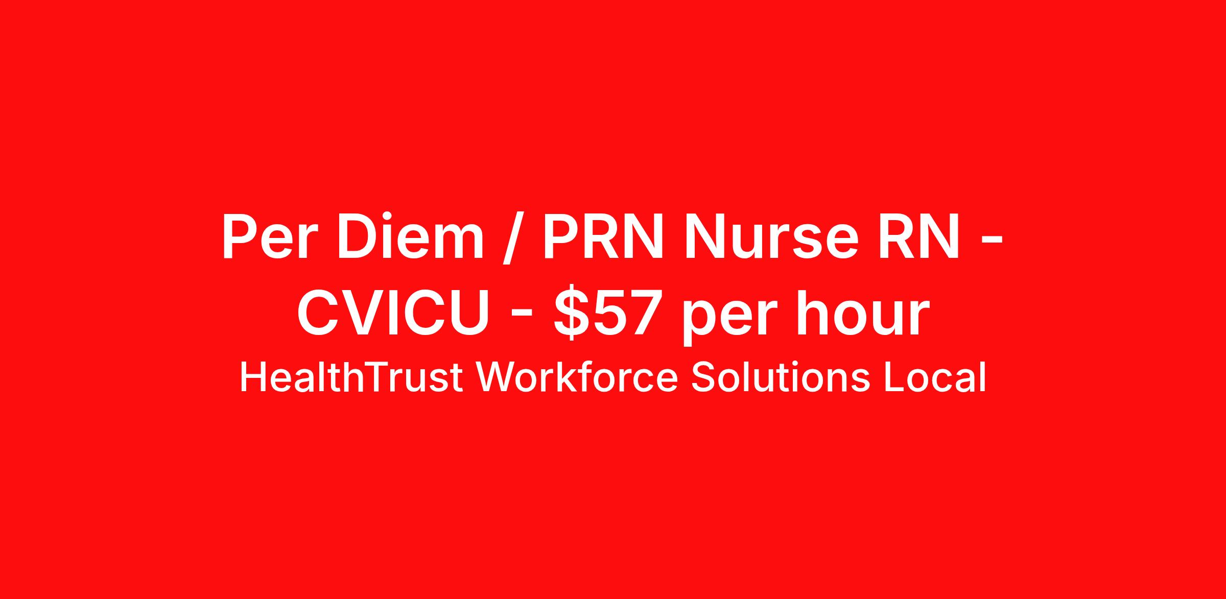 HealthTrust Workforce Solutions Local is seeking a per diem / prn nurse RN CVICU for a per diem / prn nursing job in Houston, Texas. Job Description & Requirements Specialty: CVICU Discipline: RN Duration: Ongoing Employment Type: Per Diem Posted rates reflects the maximum rate, including night and weekend shift differentials Entrust Your Career to HealthTrust! At HealthTrust, we believe that healthcare is not defined by the four walls in which it is practiced; it’s defined by its people. We pride ourselves on crafting opportunities that expand skill sets, broaden career horizons, provide economic stability, and cultivate personal growth. HealthTrust Offers: Getting to know HCA facilities within 50mi of home zip code Self scheduling through our Mobile GO HWS App Minimum of just three shifts a month, however, you can work more! 401K Matching Weekly pay every Friday Not required to work weekends Not Required to work holidays To get started, you will need: RN's a minimum of 1 year in specialty Allied 6 months of experience An adventurous spirit and fierce dedication Degree in corresponding specialty as required Appropriate certifications for the specific position HealthTrust Benefits: Opportunities for a lifetime: When you become a part of the HCA family, you will have exclusive access to more opportunities than any other healthcare system in the nation. At HWS, we help open the door to a lifetime of lasting career opportunities. A culture of care: Our clinicians have made HWS an industry leader for over 25 years. We are passionate about our mission that, above all else, we are committed to the care and improvement of human life. Career Development: As a wholly owned subsidiary of HCA Healthcare, HWS is a preferred partner to thousands of top-performing hospitals. We provide our healthcare professionals with first-priority access to more than 200,000 jobs nationwide. We are uniquely positioned to offer you exclusive and direct access to HCA Healthcare’s vast network of facilities. Let us open the door to nationwide opportunities that fit your lifestyle! We are an equal opportunity employer and value diversity at our company. We do not discriminate on the basis of race, religion, color, national origin, gender, sexual orientation, age, marital status, veteran status, or disability status. Job Requirements Certifications ACLS (Required) NIHSS (Required) BLS (Required) HealthTrust Workforce Solutions Per Diem Job ID 925001. Posted job title: Per Diem Nurse - Cardiac ICU