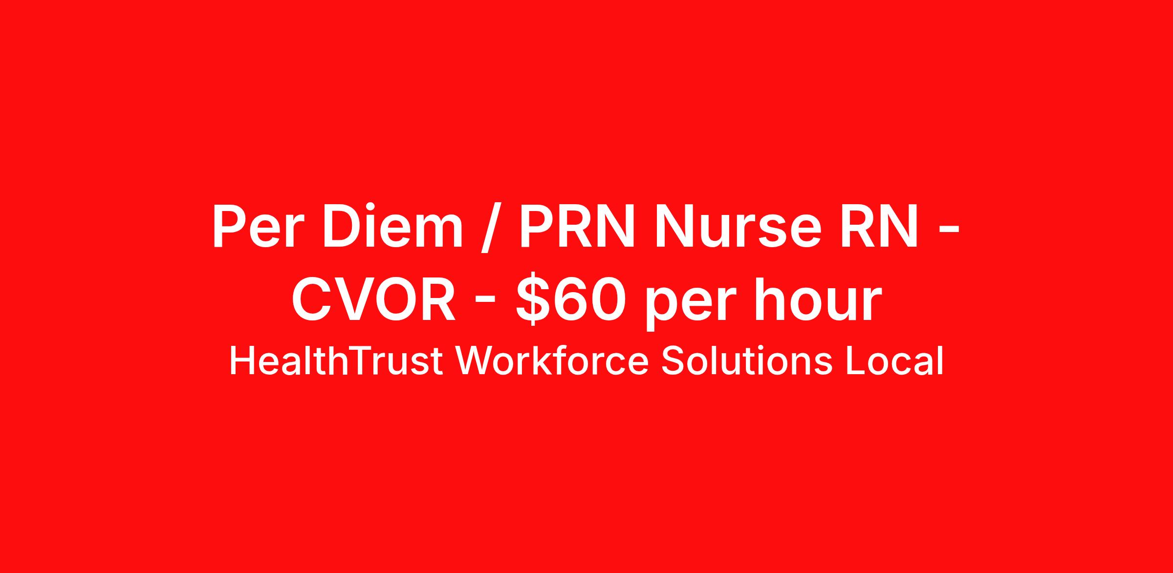HealthTrust Workforce Solutions Local is seeking a per diem / prn nurse RN CVOR for a per diem / prn nursing job in West Bradenton, Florida. Job Description & Requirements Specialty: CVOR Discipline: RN Start Date: 04/06/2026 Duration: Ongoing Employment Type: Per Diem Posted rates reflects the maximum rate, including night and weekend shift differentials Entrust Your Career to HealthTrust! At HealthTrust, we believe that healthcare is not defined by the four walls in which it is practiced; it’s defined by its people. We pride ourselves on crafting opportunities that expand skill sets, broaden career horizons, provide economic stability, and cultivate personal growth. HealthTrust Offers: Getting to know HCA facilities within 50mi of home zip code Self scheduling through our Mobile GO HWS App Minimum of just three shifts a month, however, you can work more! 401K Matching Weekly pay every Friday Not required to work weekends Not Required to work holidays To get started, you will need: RN's a minimum of 1 year in specialty Allied 6 months of experience An adventurous spirit and fierce dedication Degree in corresponding specialty as required Appropriate certifications for the specific position HealthTrust Benefits: Opportunities for a lifetime: When you become a part of the HCA family, you will have exclusive access to more opportunities than any other healthcare system in the nation. At HWS, we help open the door to a lifetime of lasting career opportunities. A culture of care: Our clinicians have made HWS an industry leader for over 25 years. We are passionate about our mission that, above all else, we are committed to the care and improvement of human life. Career Development: As a wholly owned subsidiary of HCA Healthcare, HWS is a preferred partner to thousands of top-performing hospitals. We provide our healthcare professionals with first-priority access to more than 200,000 jobs nationwide. We are uniquely positioned to offer you exclusive and direct access to HCA Healthcare’s vast network of facilities. Let us open the door to nationwide opportunities that fit your lifestyle! We are an equal opportunity employer and value diversity at our company. We do not discriminate on the basis of race, religion, color, national origin, gender, sexual orientation, age, marital status, veteran status, or disability status. Job Requirements Certifications ACLS (Required) BLS (Required) HealthTrust Workforce Solutions Per Diem Job ID 406569. Posted job title: Per Diem Nurse - Cardiovascular OR