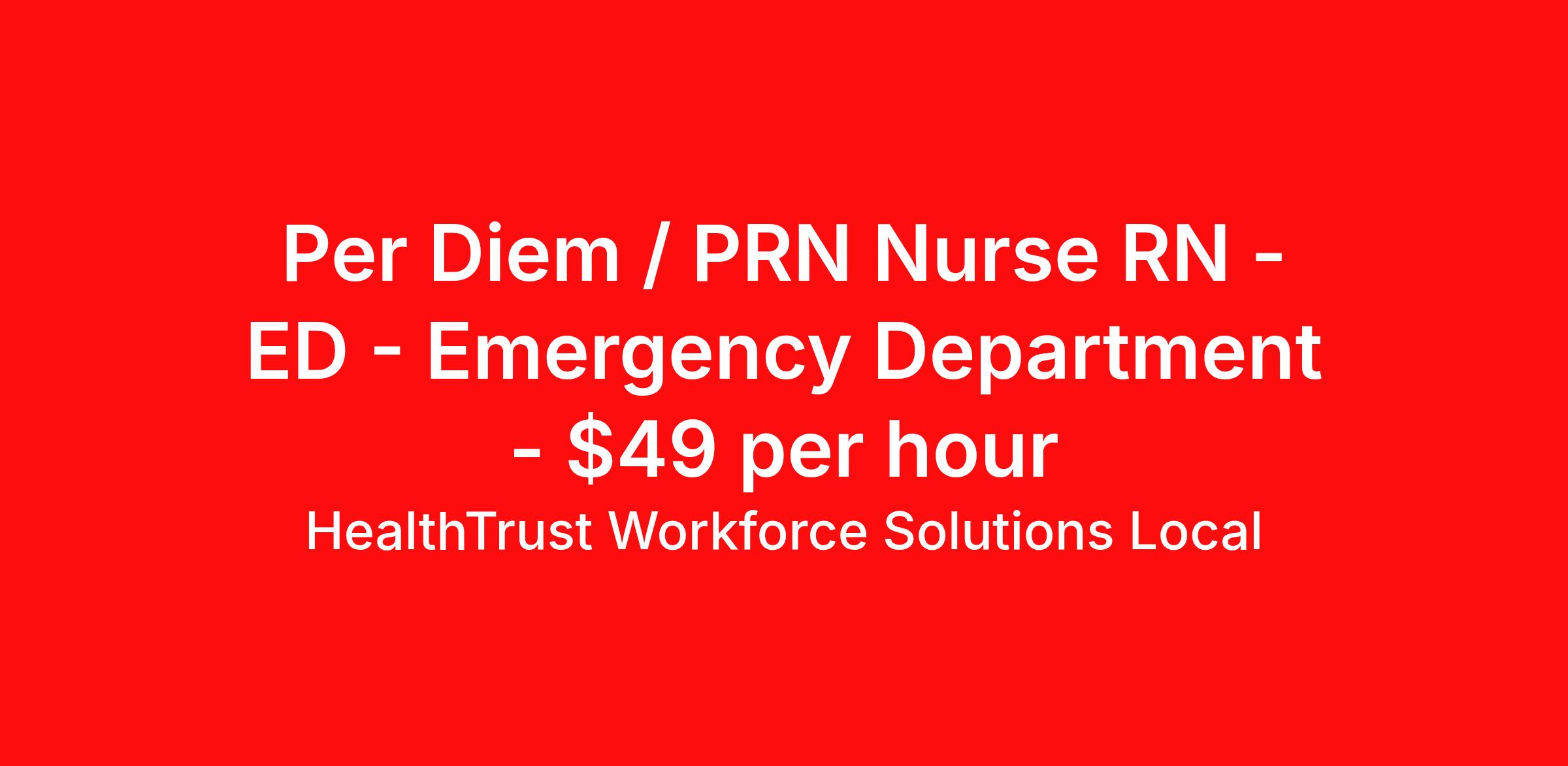 HealthTrust Workforce Solutions Local is seeking a per diem / prn nurse RN ED - Emergency Department for a per diem / prn nursing job in Panama City, Florida. Job Description & Requirements Specialty: ED - Emergency Department Discipline: RN Duration: Ongoing Employment Type: Per Diem Posted rates reflects the maximum rate, including night and weekend shift differentials Entrust Your Career to HealthTrust! At HealthTrust, we believe that healthcare is not defined by the four walls in which it is practiced; it’s defined by its people. We pride ourselves on crafting opportunities that expand skill sets, broaden career horizons, provide economic stability, and cultivate personal growth. HealthTrust Offers: Getting to know HCA facilities within 50mi of home zip code Self scheduling through our Mobile GO HWS App Minimum of just three shifts a month, however, you can work more! 401K Matching Weekly pay every Friday Not required to work weekends Not Required to work holidays To get started, you will need: RN's a minimum of 1 year in specialty Allied 6 months of experience An adventurous spirit and fierce dedication Degree in corresponding specialty as required Appropriate certifications for the specific position HealthTrust Benefits: Opportunities for a lifetime: When you become a part of the HCA family, you will have exclusive access to more opportunities than any other healthcare system in the nation. At HWS, we help open the door to a lifetime of lasting career opportunities. A culture of care: Our clinicians have made HWS an industry leader for over 25 years. We are passionate about our mission that, above all else, we are committed to the care and improvement of human life. Career Development: As a wholly owned subsidiary of HCA Healthcare, HWS is a preferred partner to thousands of top-performing hospitals. We provide our healthcare professionals with first-priority access to more than 200,000 jobs nationwide. We are uniquely positioned to offer you exclusive and direct access to HCA Healthcare’s vast network of facilities. Let us open the door to nationwide opportunities that fit your lifestyle! We are an equal opportunity employer and value diversity at our company. We do not discriminate on the basis of race, religion, color, national origin, gender, sexual orientation, age, marital status, veteran status, or disability status. Job Requirements Certifications CPI (Required) NIHSS (Required) BLS (Required) ACLS (Required) PALS (Required) HealthTrust Workforce Solutions Per Diem Job ID 848268. Posted job title: Per Diem Nurse - Emergency Room