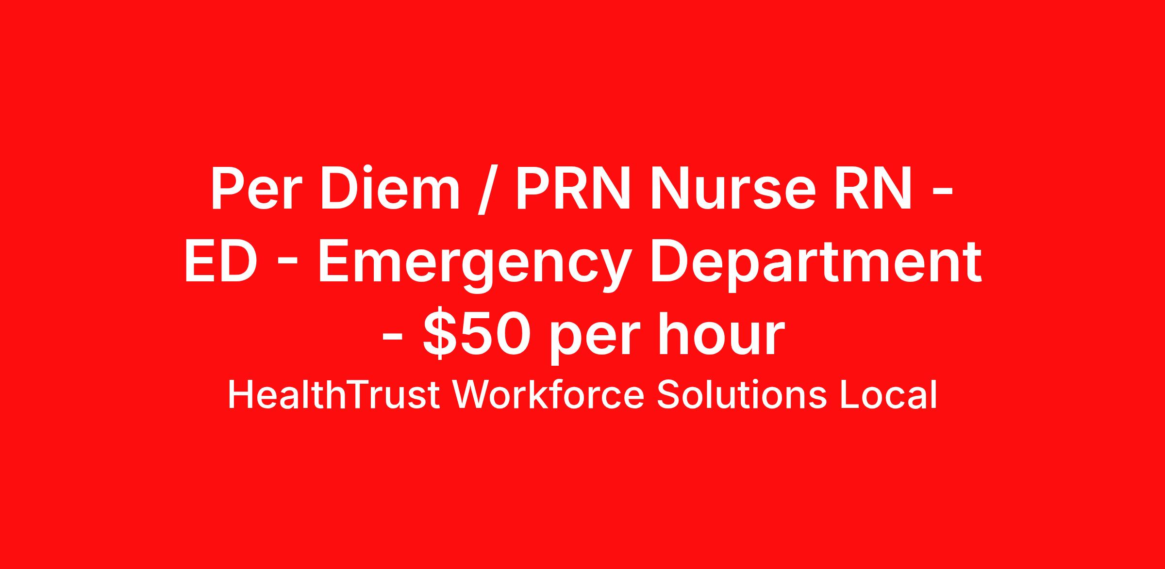HealthTrust Workforce Solutions Local is seeking a per diem / prn nurse RN ED - Emergency Department for a per diem / prn nursing job in Asheville, North Carolina. Job Description & Requirements Specialty: ED - Emergency Department Discipline: RN Start Date: 04/06/2026 Duration: Ongoing Employment Type: Per Diem Posted rates reflects the maximum rate, including night and weekend shift differentials Entrust Your Career to HealthTrust! At HealthTrust, we believe that healthcare is not defined by the four walls in which it is practiced; it’s defined by its people. We pride ourselves on crafting opportunities that expand skill sets, broaden career horizons, provide economic stability, and cultivate personal growth. HealthTrust Offers: Getting to know HCA facilities within 50mi of home zip code Self scheduling through our Mobile GO HWS App Minimum of just three shifts a month, however, you can work more! 401K Matching Weekly pay every Friday Not required to work weekends Not Required to work holidays To get started, you will need: RN's a minimum of 1 year in specialty Allied 6 months of experience An adventurous spirit and fierce dedication Degree in corresponding specialty as required Appropriate certifications for the specific position HealthTrust Benefits: Opportunities for a lifetime: When you become a part of the HCA family, you will have exclusive access to more opportunities than any other healthcare system in the nation. At HWS, we help open the door to a lifetime of lasting career opportunities. A culture of care: Our clinicians have made HWS an industry leader for over 25 years. We are passionate about our mission that, above all else, we are committed to the care and improvement of human life. Career Development: As a wholly owned subsidiary of HCA Healthcare, HWS is a preferred partner to thousands of top-performing hospitals. We provide our healthcare professionals with first-priority access to more than 200,000 jobs nationwide. We are uniquely positioned to offer you exclusive and direct access to HCA Healthcare’s vast network of facilities. Let us open the door to nationwide opportunities that fit your lifestyle! We are an equal opportunity employer and value diversity at our company. We do not discriminate on the basis of race, religion, color, national origin, gender, sexual orientation, age, marital status, veteran status, or disability status. Job Requirements Certifications CPI (Required) NIHSS (Required) BLS (Required) ACLS (Required) PALS (Required) HealthTrust Workforce Solutions Per Diem Job ID 430333. Posted job title: Per Diem Nurse - Emergency Room