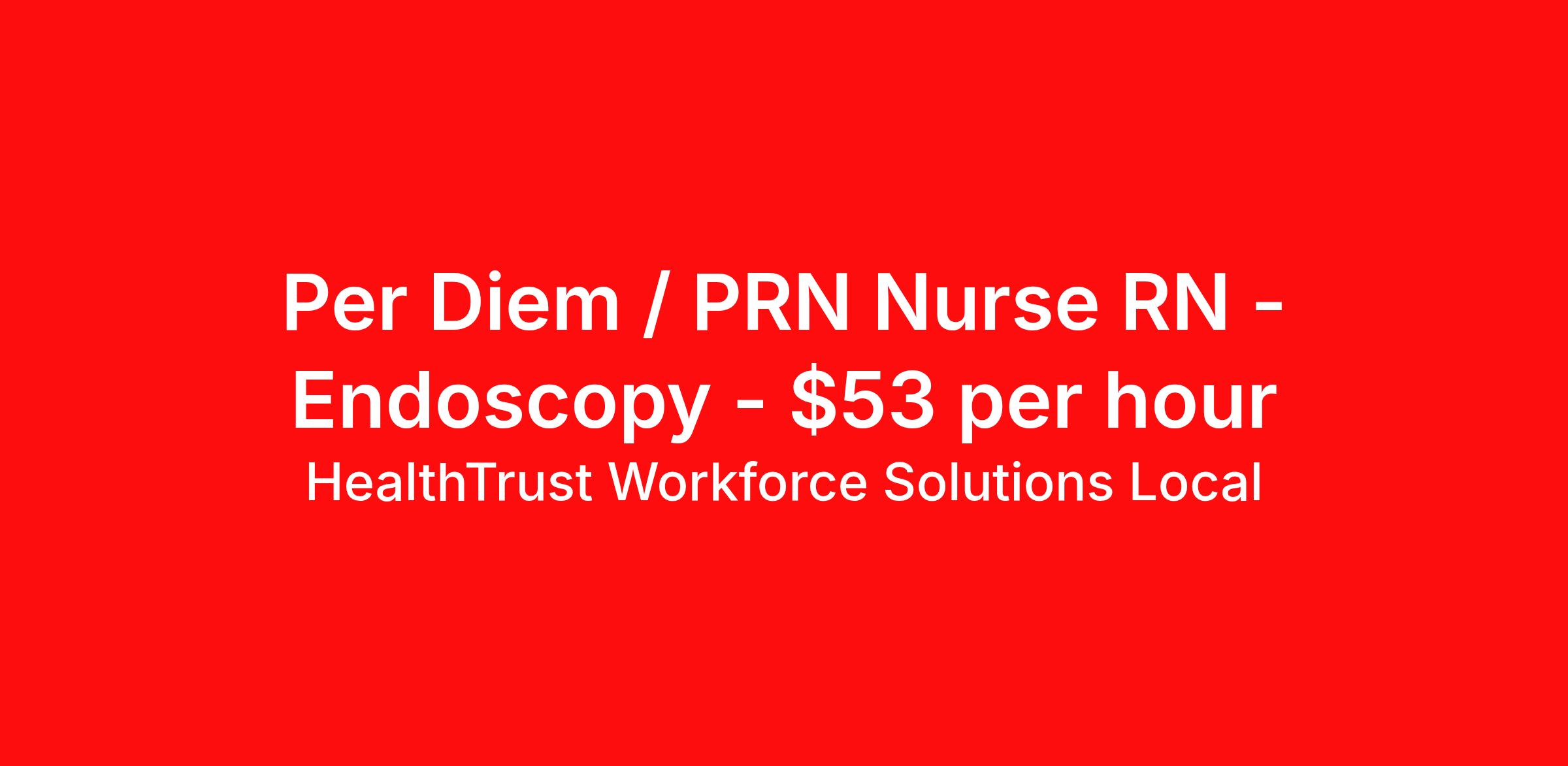 HealthTrust Workforce Solutions Local is seeking a per diem / prn nurse RN Endoscopy for a per diem / prn nursing job in Brandon, Florida. Job Description & Requirements Specialty: Endoscopy Discipline: RN Duration: Ongoing Employment Type: Per Diem Posted rates reflects the maximum rate, including night and weekend shift differentials Entrust Your Career to HealthTrust! At HealthTrust, we believe that healthcare is not defined by the four walls in which it is practiced; it’s defined by its people. We pride ourselves on crafting opportunities that expand skill sets, broaden career horizons, provide economic stability, and cultivate personal growth. HealthTrust Offers: Getting to know HCA facilities within 50mi of home zip code Self scheduling through our Mobile GO HWS App Minimum of just three shifts a month, however, you can work more! 401K Matching Weekly pay every Friday Not required to work weekends Not Required to work holidays To get started, you will need: RN's a minimum of 1 year in specialty Allied 6 months of experience An adventurous spirit and fierce dedication Degree in corresponding specialty as required Appropriate certifications for the specific position HealthTrust Benefits: Opportunities for a lifetime: When you become a part of the HCA family, you will have exclusive access to more opportunities than any other healthcare system in the nation. At HWS, we help open the door to a lifetime of lasting career opportunities. A culture of care: Our clinicians have made HWS an industry leader for over 25 years. We are passionate about our mission that, above all else, we are committed to the care and improvement of human life. Career Development: As a wholly owned subsidiary of HCA Healthcare, HWS is a preferred partner to thousands of top-performing hospitals. We provide our healthcare professionals with first-priority access to more than 200,000 jobs nationwide. We are uniquely positioned to offer you exclusive and direct access to HCA Healthcare’s vast network of facilities. Let us open the door to nationwide opportunities that fit your lifestyle! We are an equal opportunity employer and value diversity at our company. We do not discriminate on the basis of race, religion, color, national origin, gender, sexual orientation, age, marital status, veteran status, or disability status. Job Requirements Certifications ACLS (Required) BLS (Required) HealthTrust Workforce Solutions Per Diem Job ID 857436. Posted job title: Per Diem Nurse - Endoscopy