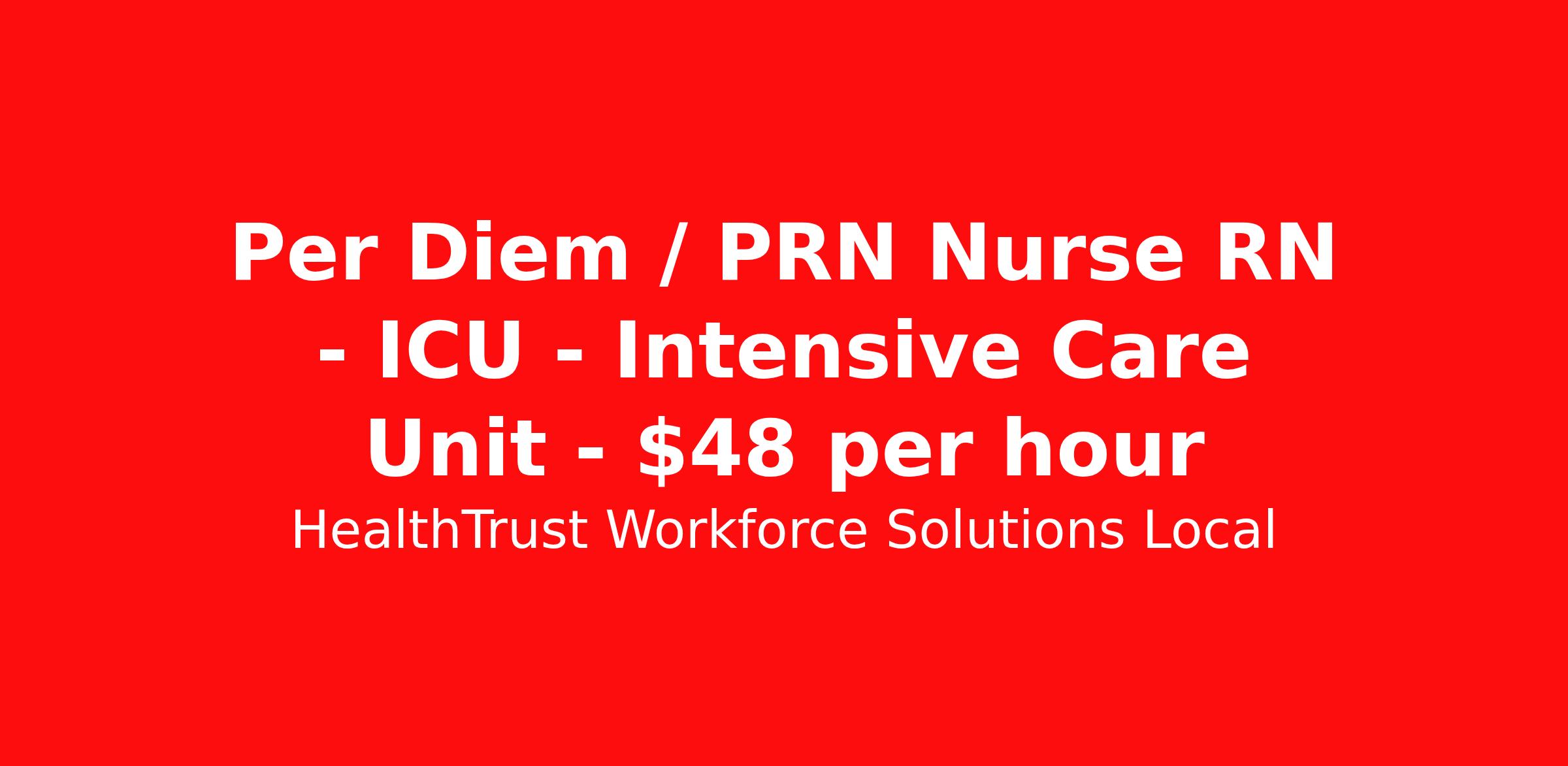 HealthTrust Workforce Solutions Local is seeking a per diem / prn nurse RN ICU - Intensive Care Unit for a per diem / prn nursing job in Palatka, Florida. Job Description & Requirements Specialty: ICU - Intensive Care Unit Discipline: RN Duration: Ongoing Employment Type: Per Diem Posted rates reflects the maximum rate, including night and weekend shift differentials Entrust Your Career to HealthTrust! At HealthTrust, we believe that healthcare is not defined by the four walls in which it is practiced; it’s defined by its people. We pride ourselves on crafting opportunities that expand skill sets, broaden career horizons, provide economic stability, and cultivate personal growth. HealthTrust Offers: Getting to know HCA facilities within 50mi of home zip code Self scheduling through our Mobile GO HWS App Minimum of just three shifts a month, however, you can work more! 401K Matching Weekly pay every Friday Not required to work weekends Not Required to work holidays To get started, you will need: RN's a minimum of 1 year in specialty Allied 6 months of experience An adventurous spirit and fierce dedication Degree in corresponding specialty as required Appropriate certifications for the specific position HealthTrust Benefits: Opportunities for a lifetime: When you become a part of the HCA family, you will have exclusive access to more opportunities than any other healthcare system in the nation. At HWS, we help open the door to a lifetime of lasting career opportunities. A culture of care: Our clinicians have made HWS an industry leader for over 25 years. We are passionate about our mission that, above all else, we are committed to the care and improvement of human life. Career Development: As a wholly owned subsidiary of HCA Healthcare, HWS is a preferred partner to thousands of top-performing hospitals. We provide our healthcare professionals with first-priority access to more than 200,000 jobs nationwide. We are uniquely positioned to offer you exclusive and direct access to HCA Healthcare’s vast network of facilities. Let us open the door to nationwide opportunities that fit your lifestyle! We are an equal opportunity employer and value diversity at our company. We do not discriminate on the basis of race, religion, color, national origin, gender, sexual orientation, age, marital status, veteran status, or disability status. Job Requirements Certifications ACLS (Required) NIHSS (Required) BLS (Required) HealthTrust Workforce Solutions Per Diem Job ID 829672. Posted job title: Per Diem Nurse - Critical Care