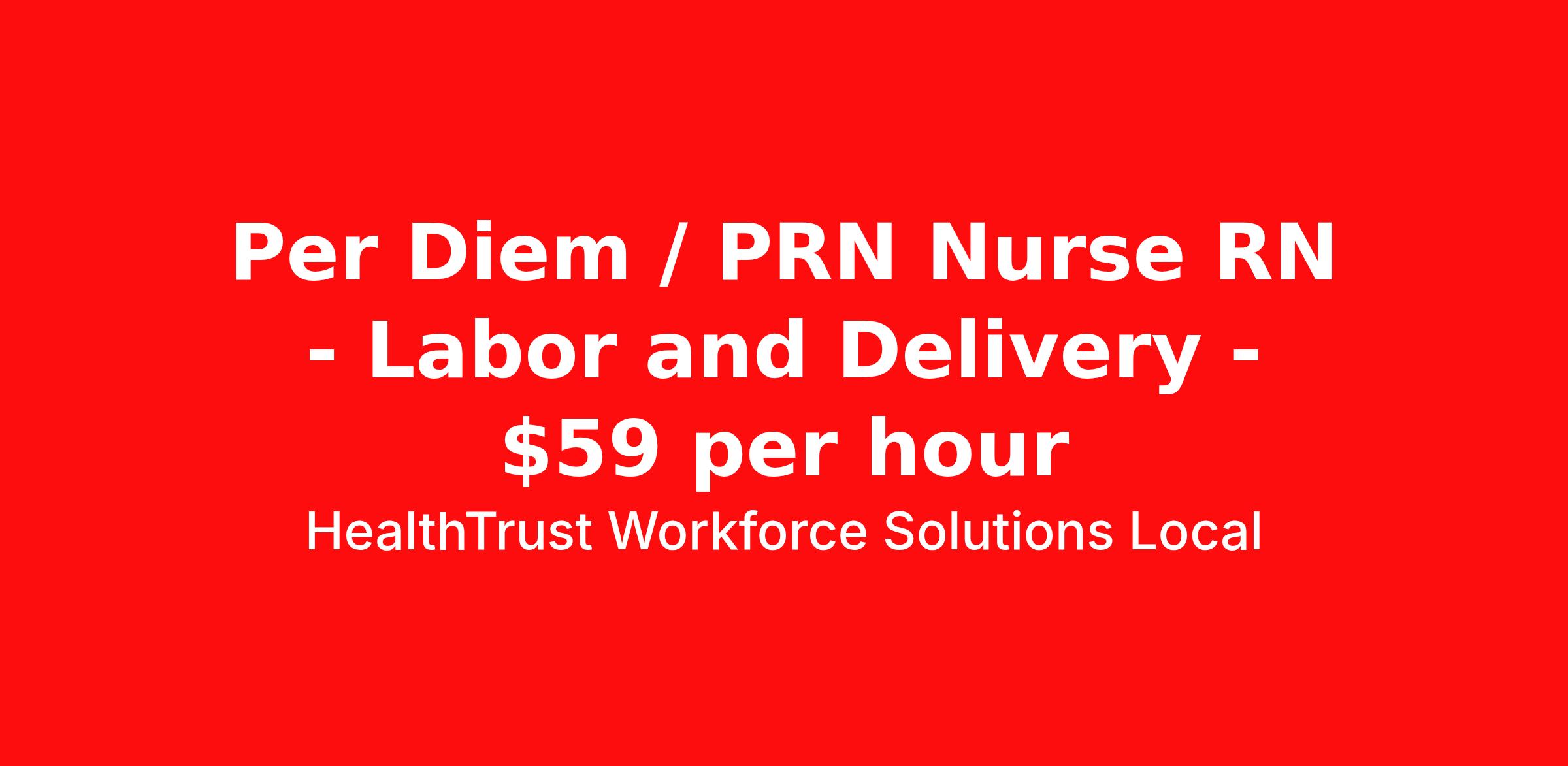 HealthTrust Workforce Solutions Local is seeking a per diem / prn nurse RN Labor and Delivery for a per diem / prn nursing job in Houston, Texas. Job Description & Requirements Specialty: Labor and Delivery Discipline: RN Start Date: 04/06/2026 Duration: Ongoing Employment Type: Per Diem Posted rates reflects the maximum rate, including night and weekend shift differentials Entrust Your Career to HealthTrust! At HealthTrust, we believe that healthcare is not defined by the four walls in which it is practiced; it’s defined by its people. We pride ourselves on crafting opportunities that expand skill sets, broaden career horizons, provide economic stability, and cultivate personal growth. HealthTrust Offers: Getting to know HCA facilities within 50mi of home zip code Self scheduling through our Mobile GO HWS App Minimum of just three shifts a month, however, you can work more! 401K Matching Weekly pay every Friday Not required to work weekends Not Required to work holidays To get started, you will need: RN's a minimum of 1 year in specialty Allied 6 months of experience An adventurous spirit and fierce dedication Degree in corresponding specialty as required Appropriate certifications for the specific position HealthTrust Benefits: Opportunities for a lifetime: When you become a part of the HCA family, you will have exclusive access to more opportunities than any other healthcare system in the nation. At HWS, we help open the door to a lifetime of lasting career opportunities. A culture of care: Our clinicians have made HWS an industry leader for over 25 years. We are passionate about our mission that, above all else, we are committed to the care and improvement of human life. Career Development: As a wholly owned subsidiary of HCA Healthcare, HWS is a preferred partner to thousands of top-performing hospitals. We provide our healthcare professionals with first-priority access to more than 200,000 jobs nationwide. We are uniquely positioned to offer you exclusive and direct access to HCA Healthcare’s vast network of facilities. Let us open the door to nationwide opportunities that fit your lifestyle! We are an equal opportunity employer and value diversity at our company. We do not discriminate on the basis of race, religion, color, national origin, gender, sexual orientation, age, marital status, veteran status, or disability status. Job Requirements Certifications ACLS (Required) AWHONN (Required) NRP (Required) BLS (Required) HealthTrust Workforce Solutions Per Diem Job ID 853453. Posted job title: Per Diem Nurse - Labor & Delivery