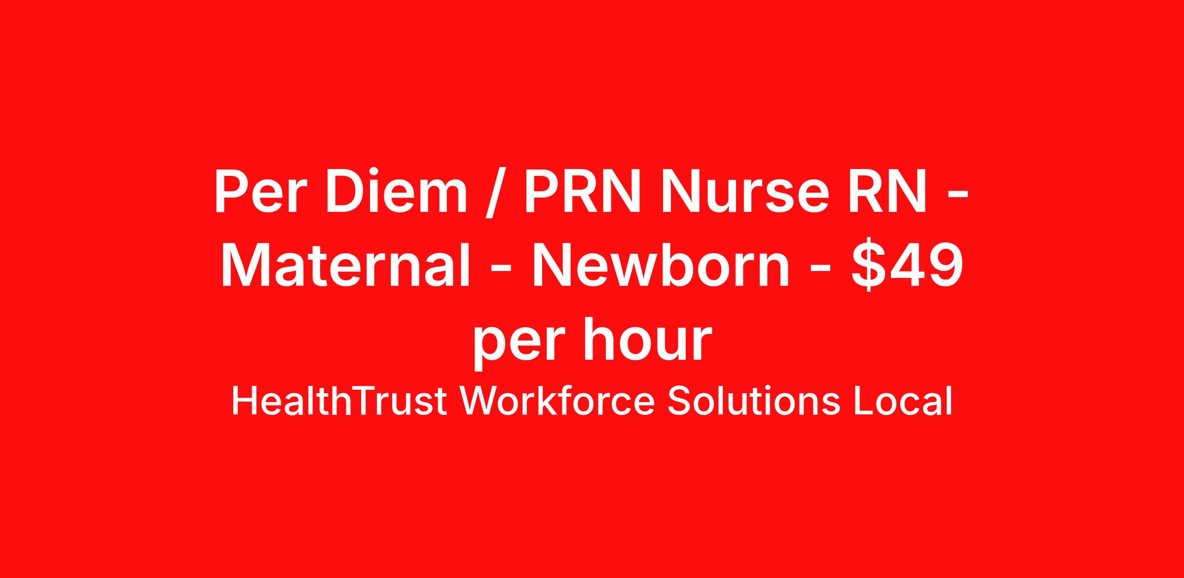 HealthTrust Workforce Solutions Local is seeking a per diem / prn nurse RN Maternal - Newborn for a per diem / prn nursing job in Smyrna, Tennessee. Job Description & Requirements Specialty: Maternal - Newborn Discipline: RN Start Date: 04/06/2026 Duration: Ongoing Employment Type: Per Diem Posted rates reflects the maximum rate, including night and weekend shift differentials Entrust Your Career to HealthTrust! At HealthTrust, we believe that healthcare is not defined by the four walls in which it is practiced; it’s defined by its people. We pride ourselves on crafting opportunities that expand skill sets, broaden career horizons, provide economic stability, and cultivate personal growth. HealthTrust Offers: Getting to know HCA facilities within 50mi of home zip code Self scheduling through our Mobile GO HWS App Minimum of just three shifts a month, however, you can work more! 401K Matching Weekly pay every Friday Not required to work weekends Not Required to work holidays To get started, you will need: RN's a minimum of 1 year in specialty Allied 6 months of experience An adventurous spirit and fierce dedication Degree in corresponding specialty as required Appropriate certifications for the specific position HealthTrust Benefits: Opportunities for a lifetime: When you become a part of the HCA family, you will have exclusive access to more opportunities than any other healthcare system in the nation. At HWS, we help open the door to a lifetime of lasting career opportunities. A culture of care: Our clinicians have made HWS an industry leader for over 25 years. We are passionate about our mission that, above all else, we are committed to the care and improvement of human life. Career Development: As a wholly owned subsidiary of HCA Healthcare, HWS is a preferred partner to thousands of top-performing hospitals. We provide our healthcare professionals with first-priority access to more than 200,000 jobs nationwide. We are uniquely positioned to offer you exclusive and direct access to HCA Healthcare’s vast network of facilities. Let us open the door to nationwide opportunities that fit your lifestyle! We are an equal opportunity employer and value diversity at our company. We do not discriminate on the basis of race, religion, color, national origin, gender, sexual orientation, age, marital status, veteran status, or disability status. Job Requirements Certifications : BLS (Required) HealthTrust Workforce Solutions Per Diem Job ID 885550. Posted job title: Per Diem Nurse - Mother/Baby