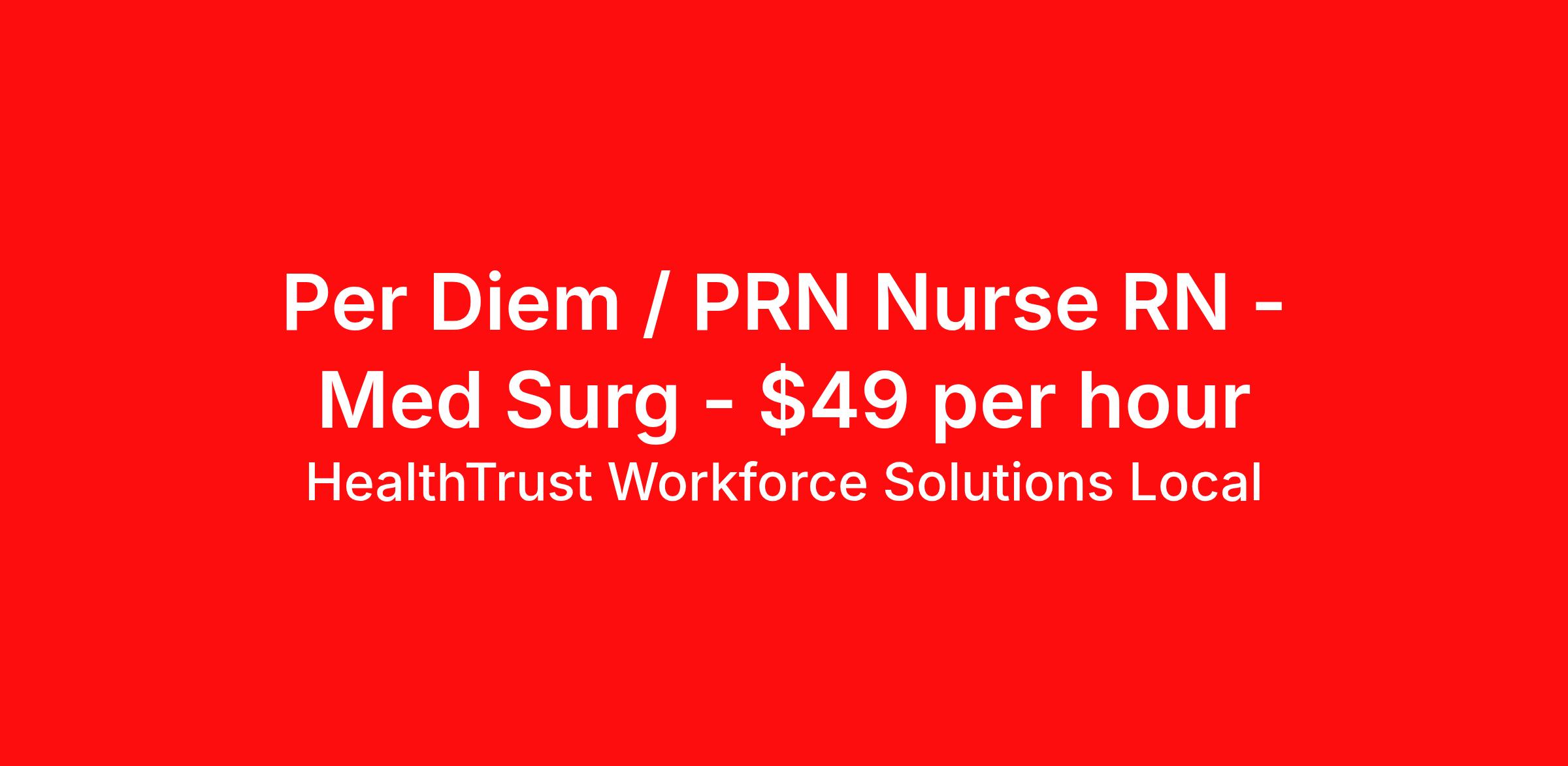 HealthTrust Workforce Solutions Local is seeking a per diem / prn nurse RN Med Surg for a per diem / prn nursing job in Smyrna, Tennessee. Job Description & Requirements Specialty: Med Surg Discipline: RN Start Date: 04/06/2026 Duration: Ongoing Employment Type: Per Diem Posted rates reflects the maximum rate, including night and weekend shift differentials Entrust Your Career to HealthTrust! At HealthTrust, we believe that healthcare is not defined by the four walls in which it is practiced; it’s defined by its people. We pride ourselves on crafting opportunities that expand skill sets, broaden career horizons, provide economic stability, and cultivate personal growth. HealthTrust Offers: Getting to know HCA facilities within 50mi of home zip code Self scheduling through our Mobile GO HWS App Minimum of just three shifts a month, however, you can work more! 401K Matching Weekly pay every Friday Not required to work weekends Not Required to work holidays To get started, you will need: RN's a minimum of 1 year in specialty Allied 6 months of experience An adventurous spirit and fierce dedication Degree in corresponding specialty as required Appropriate certifications for the specific position HealthTrust Benefits: Opportunities for a lifetime: When you become a part of the HCA family, you will have exclusive access to more opportunities than any other healthcare system in the nation. At HWS, we help open the door to a lifetime of lasting career opportunities. A culture of care: Our clinicians have made HWS an industry leader for over 25 years. We are passionate about our mission that, above all else, we are committed to the care and improvement of human life. Career Development: As a wholly owned subsidiary of HCA Healthcare, HWS is a preferred partner to thousands of top-performing hospitals. We provide our healthcare professionals with first-priority access to more than 200,000 jobs nationwide. We are uniquely positioned to offer you exclusive and direct access to HCA Healthcare’s vast network of facilities. Let us open the door to nationwide opportunities that fit your lifestyle! We are an equal opportunity employer and value diversity at our company. We do not discriminate on the basis of race, religion, color, national origin, gender, sexual orientation, age, marital status, veteran status, or disability status. Job Requirements Certifications : BLS (Required) HealthTrust Workforce Solutions Per Diem Job ID 480117. Posted job title: Per Diem Nurse - Medical-Surgical