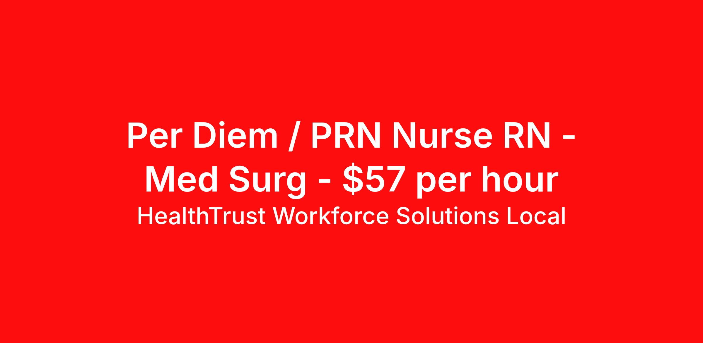 HealthTrust Workforce Solutions Local is seeking a per diem / prn nurse RN Med Surg for a per diem / prn nursing job in Las Vegas, Nevada. Job Description & Requirements Specialty: Med Surg Discipline: RN Start Date: 04/06/2026 Duration: Ongoing Employment Type: Per Diem Posted rates reflects the maximum rate, including night and weekend shift differentials Entrust Your Career to HealthTrust! At HealthTrust, we believe that healthcare is not defined by the four walls in which it is practiced; it’s defined by its people. We pride ourselves on crafting opportunities that expand skill sets, broaden career horizons, provide economic stability, and cultivate personal growth. HealthTrust Offers: Getting to know HCA facilities within 50mi of home zip code Self scheduling through our Mobile GO HWS App Minimum of just three shifts a month, however, you can work more! 401K Matching Weekly pay every Friday Not required to work weekends Not Required to work holidays To get started, you will need: RN's a minimum of 1 year in specialty Allied 6 months of experience An adventurous spirit and fierce dedication Degree in corresponding specialty as required Appropriate certifications for the specific position HealthTrust Benefits: Opportunities for a lifetime: When you become a part of the HCA family, you will have exclusive access to more opportunities than any other healthcare system in the nation. At HWS, we help open the door to a lifetime of lasting career opportunities. A culture of care: Our clinicians have made HWS an industry leader for over 25 years. We are passionate about our mission that, above all else, we are committed to the care and improvement of human life. Career Development: As a wholly owned subsidiary of HCA Healthcare, HWS is a preferred partner to thousands of top-performing hospitals. We provide our healthcare professionals with first-priority access to more than 200,000 jobs nationwide. We are uniquely positioned to offer you exclusive and direct access to HCA Healthcare’s vast network of facilities. Let us open the door to nationwide opportunities that fit your lifestyle! We are an equal opportunity employer and value diversity at our company. We do not discriminate on the basis of race, religion, color, national origin, gender, sexual orientation, age, marital status, veteran status, or disability status. Job Requirements Certifications : BLS (Required) HealthTrust Workforce Solutions Per Diem Job ID 369529. Posted job title: Per Diem Nurse - Medical-Surgical