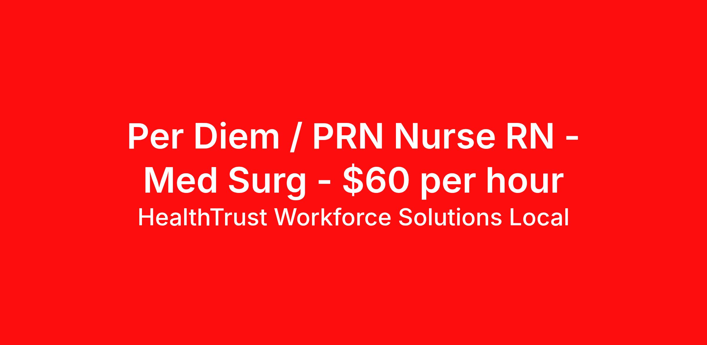 HealthTrust Workforce Solutions Local is seeking a per diem / prn nurse RN Med Surg for a per diem / prn nursing job in Denver, Colorado. Job Description & Requirements Specialty: Med Surg Discipline: RN Start Date: 04/06/2026 Duration: Ongoing Employment Type: Per Diem Posted rates reflects the maximum rate, including night and weekend shift differentials Entrust Your Career to HealthTrust! At HealthTrust, we believe that healthcare is not defined by the four walls in which it is practiced; it’s defined by its people. We pride ourselves on crafting opportunities that expand skill sets, broaden career horizons, provide economic stability, and cultivate personal growth. HealthTrust Offers: Getting to know HCA facilities within 50mi of home zip code Self scheduling through our Mobile GO HWS App Minimum of just three shifts a month, however, you can work more! 401K Matching Weekly pay every Friday Not required to work weekends Not Required to work holidays To get started, you will need: RN's a minimum of 1 year in specialty Allied 6 months of experience An adventurous spirit and fierce dedication Degree in corresponding specialty as required Appropriate certifications for the specific position HealthTrust Benefits: Opportunities for a lifetime: When you become a part of the HCA family, you will have exclusive access to more opportunities than any other healthcare system in the nation. At HWS, we help open the door to a lifetime of lasting career opportunities. A culture of care: Our clinicians have made HWS an industry leader for over 25 years. We are passionate about our mission that, above all else, we are committed to the care and improvement of human life. Career Development: As a wholly owned subsidiary of HCA Healthcare, HWS is a preferred partner to thousands of top-performing hospitals. We provide our healthcare professionals with first-priority access to more than 200,000 jobs nationwide. We are uniquely positioned to offer you exclusive and direct access to HCA Healthcare’s vast network of facilities. Let us open the door to nationwide opportunities that fit your lifestyle! We are an equal opportunity employer and value diversity at our company. We do not discriminate on the basis of race, religion, color, national origin, gender, sexual orientation, age, marital status, veteran status, or disability status. Job Requirements Certifications : BLS (Required) HealthTrust Workforce Solutions Per Diem Job ID 926384. Posted job title: Per Diem Nurse - Medical-Surgical