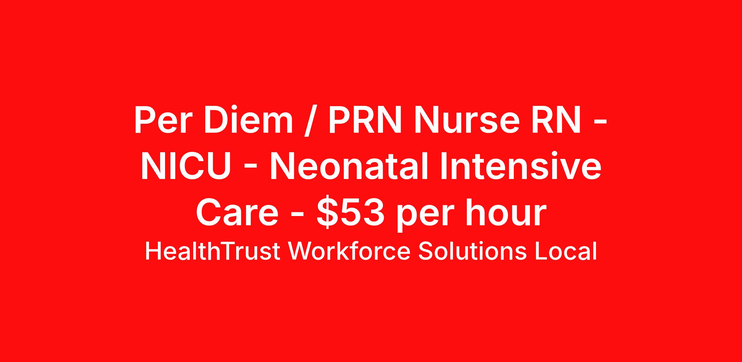 HealthTrust Workforce Solutions Local is seeking a per diem / prn nurse RN NICU - Neonatal Intensive Care for a per diem / prn nursing job in Asheville, North Carolina. Job Description & Requirements Specialty: NICU - Neonatal Intensive Care Discipline: RN Start Date: 04/06/2026 Duration: Ongoing Employment Type: Per Diem Posted rates reflects the maximum rate, including night and weekend shift differentials Entrust Your Career to HealthTrust! At HealthTrust, we believe that healthcare is not defined by the four walls in which it is practiced; it’s defined by its people. We pride ourselves on crafting opportunities that expand skill sets, broaden career horizons, provide economic stability, and cultivate personal growth. HealthTrust Offers: Getting to know HCA facilities within 50mi of home zip code Self scheduling through our Mobile GO HWS App Minimum of just three shifts a month, however, you can work more! 401K Matching Weekly pay every Friday Not required to work weekends Not Required to work holidays To get started, you will need: RN's a minimum of 1 year in specialty Allied 6 months of experience An adventurous spirit and fierce dedication Degree in corresponding specialty as required Appropriate certifications for the specific position HealthTrust Benefits: Opportunities for a lifetime: When you become a part of the HCA family, you will have exclusive access to more opportunities than any other healthcare system in the nation. At HWS, we help open the door to a lifetime of lasting career opportunities. A culture of care: Our clinicians have made HWS an industry leader for over 25 years. We are passionate about our mission that, above all else, we are committed to the care and improvement of human life. Career Development: As a wholly owned subsidiary of HCA Healthcare, HWS is a preferred partner to thousands of top-performing hospitals. We provide our healthcare professionals with first-priority access to more than 200,000 jobs nationwide. We are uniquely positioned to offer you exclusive and direct access to HCA Healthcare’s vast network of facilities. Let us open the door to nationwide opportunities that fit your lifestyle! We are an equal opportunity employer and value diversity at our company. We do not discriminate on the basis of race, religion, color, national origin, gender, sexual orientation, age, marital status, veteran status, or disability status. Job Requirements Certifications NRP (Required) BLS (Required) HealthTrust Workforce Solutions Per Diem Job ID 979146. Posted job title: Per Diem Nurse - Neonatal ICU (NICU)