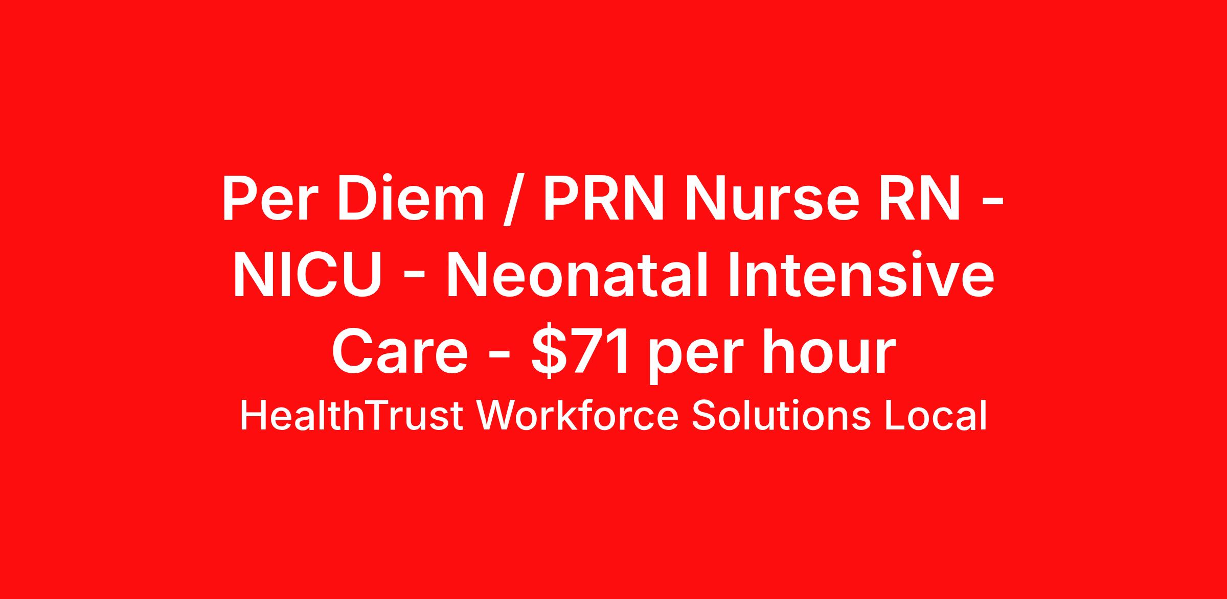 HealthTrust Workforce Solutions Local is seeking a per diem / prn nurse RN NICU - Neonatal Intensive Care for a per diem / prn nursing job in Las Vegas, Nevada. Job Description & Requirements Specialty: NICU - Neonatal Intensive Care Discipline: RN Start Date: 04/06/2026 Duration: Ongoing Employment Type: Per Diem Posted rates reflects the maximum rate, including night and weekend shift differentials Entrust Your Career to HealthTrust! At HealthTrust, we believe that healthcare is not defined by the four walls in which it is practiced; it’s defined by its people. We pride ourselves on crafting opportunities that expand skill sets, broaden career horizons, provide economic stability, and cultivate personal growth. HealthTrust Offers: Getting to know HCA facilities within 50mi of home zip code Self scheduling through our Mobile GO HWS App Minimum of just three shifts a month, however, you can work more! 401K Matching Weekly pay every Friday Not required to work weekends Not Required to work holidays To get started, you will need: RN's a minimum of 1 year in specialty Allied 6 months of experience An adventurous spirit and fierce dedication Degree in corresponding specialty as required Appropriate certifications for the specific position HealthTrust Benefits: Opportunities for a lifetime: When you become a part of the HCA family, you will have exclusive access to more opportunities than any other healthcare system in the nation. At HWS, we help open the door to a lifetime of lasting career opportunities. A culture of care: Our clinicians have made HWS an industry leader for over 25 years. We are passionate about our mission that, above all else, we are committed to the care and improvement of human life. Career Development: As a wholly owned subsidiary of HCA Healthcare, HWS is a preferred partner to thousands of top-performing hospitals. We provide our healthcare professionals with first-priority access to more than 200,000 jobs nationwide. We are uniquely positioned to offer you exclusive and direct access to HCA Healthcare’s vast network of facilities. Let us open the door to nationwide opportunities that fit your lifestyle! We are an equal opportunity employer and value diversity at our company. We do not discriminate on the basis of race, religion, color, national origin, gender, sexual orientation, age, marital status, veteran status, or disability status. Job Requirements Certifications NRP (Required) BLS (Required) HealthTrust Workforce Solutions Per Diem Job ID 835108. Posted job title: Per Diem Nurse - Neonatal ICU (NICU)