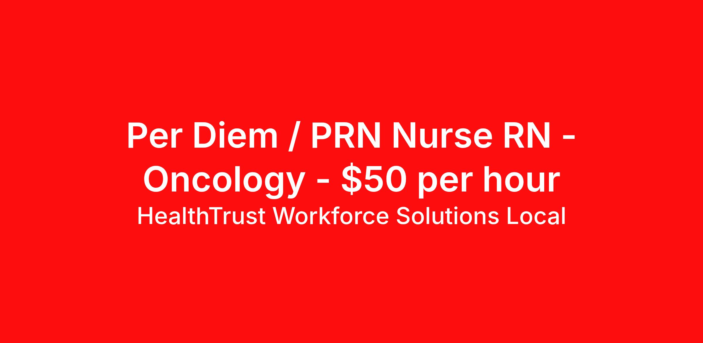 HealthTrust Workforce Solutions Local is seeking a per diem / prn nurse RN Oncology for a per diem / prn nursing job in Richmond, Virginia. Job Description & Requirements Specialty: Oncology Discipline: RN Start Date: 04/06/2026 Duration: Ongoing Employment Type: Per Diem Posted rates reflects the maximum rate, including night and weekend shift differentials Entrust Your Career to HealthTrust! At HealthTrust, we believe that healthcare is not defined by the four walls in which it is practiced; it’s defined by its people. We pride ourselves on crafting opportunities that expand skill sets, broaden career horizons, provide economic stability, and cultivate personal growth. HealthTrust Offers: Getting to know HCA facilities within 50mi of home zip code Self scheduling through our Mobile GO HWS App Minimum of just three shifts a month, however, you can work more! 401K Matching Weekly pay every Friday Not required to work weekends Not Required to work holidays To get started, you will need: RN's a minimum of 1 year in specialty Allied 6 months of experience An adventurous spirit and fierce dedication Degree in corresponding specialty as required Appropriate certifications for the specific position HealthTrust Benefits: Opportunities for a lifetime: When you become a part of the HCA family, you will have exclusive access to more opportunities than any other healthcare system in the nation. At HWS, we help open the door to a lifetime of lasting career opportunities. A culture of care: Our clinicians have made HWS an industry leader for over 25 years. We are passionate about our mission that, above all else, we are committed to the care and improvement of human life. Career Development: As a wholly owned subsidiary of HCA Healthcare, HWS is a preferred partner to thousands of top-performing hospitals. We provide our healthcare professionals with first-priority access to more than 200,000 jobs nationwide. We are uniquely positioned to offer you exclusive and direct access to HCA Healthcare’s vast network of facilities. Let us open the door to nationwide opportunities that fit your lifestyle! We are an equal opportunity employer and value diversity at our company. We do not discriminate on the basis of race, religion, color, national origin, gender, sexual orientation, age, marital status, veteran status, or disability status. Job Requirements Certifications : BLS (Required) HealthTrust Workforce Solutions Per Diem Job ID 498177. Posted job title: Per Diem Nurse - Oncology