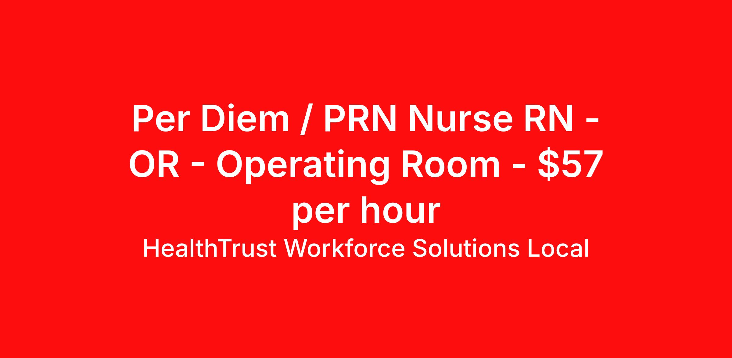 HealthTrust Workforce Solutions Local is seeking a per diem / prn nurse RN OR - Operating Room for a per diem / prn nursing job in Manchester, New Hampshire. Job Description & Requirements Specialty: OR - Operating Room Discipline: RN Duration: Ongoing Employment Type: Per Diem Posted rates reflects the maximum rate, including night and weekend shift differentials Entrust Your Career to HealthTrust! At HealthTrust, we believe that healthcare is not defined by the four walls in which it is practiced; it’s defined by its people. We pride ourselves on crafting opportunities that expand skill sets, broaden career horizons, provide economic stability, and cultivate personal growth. HealthTrust Offers: Getting to know HCA facilities within 50mi of home zip code Self scheduling through our Mobile GO HWS App Minimum of just three shifts a month, however, you can work more! 401K Matching Weekly pay every Friday Not required to work weekends Not Required to work holidays To get started, you will need: RN's a minimum of 1 year in specialty Allied 6 months of experience An adventurous spirit and fierce dedication Degree in corresponding specialty as required Appropriate certifications for the specific position HealthTrust Benefits: Opportunities for a lifetime: When you become a part of the HCA family, you will have exclusive access to more opportunities than any other healthcare system in the nation. At HWS, we help open the door to a lifetime of lasting career opportunities. A culture of care: Our clinicians have made HWS an industry leader for over 25 years. We are passionate about our mission that, above all else, we are committed to the care and improvement of human life. Career Development: As a wholly owned subsidiary of HCA Healthcare, HWS is a preferred partner to thousands of top-performing hospitals. We provide our healthcare professionals with first-priority access to more than 200,000 jobs nationwide. We are uniquely positioned to offer you exclusive and direct access to HCA Healthcare’s vast network of facilities. Let us open the door to nationwide opportunities that fit your lifestyle! We are an equal opportunity employer and value diversity at our company. We do not discriminate on the basis of race, religion, color, national origin, gender, sexual orientation, age, marital status, veteran status, or disability status. Job Requirements Certifications ACLS (Required) BLS (Required) HealthTrust Workforce Solutions Per Diem Job ID 898813. Posted job title: Per Diem Nurse - Operating Room