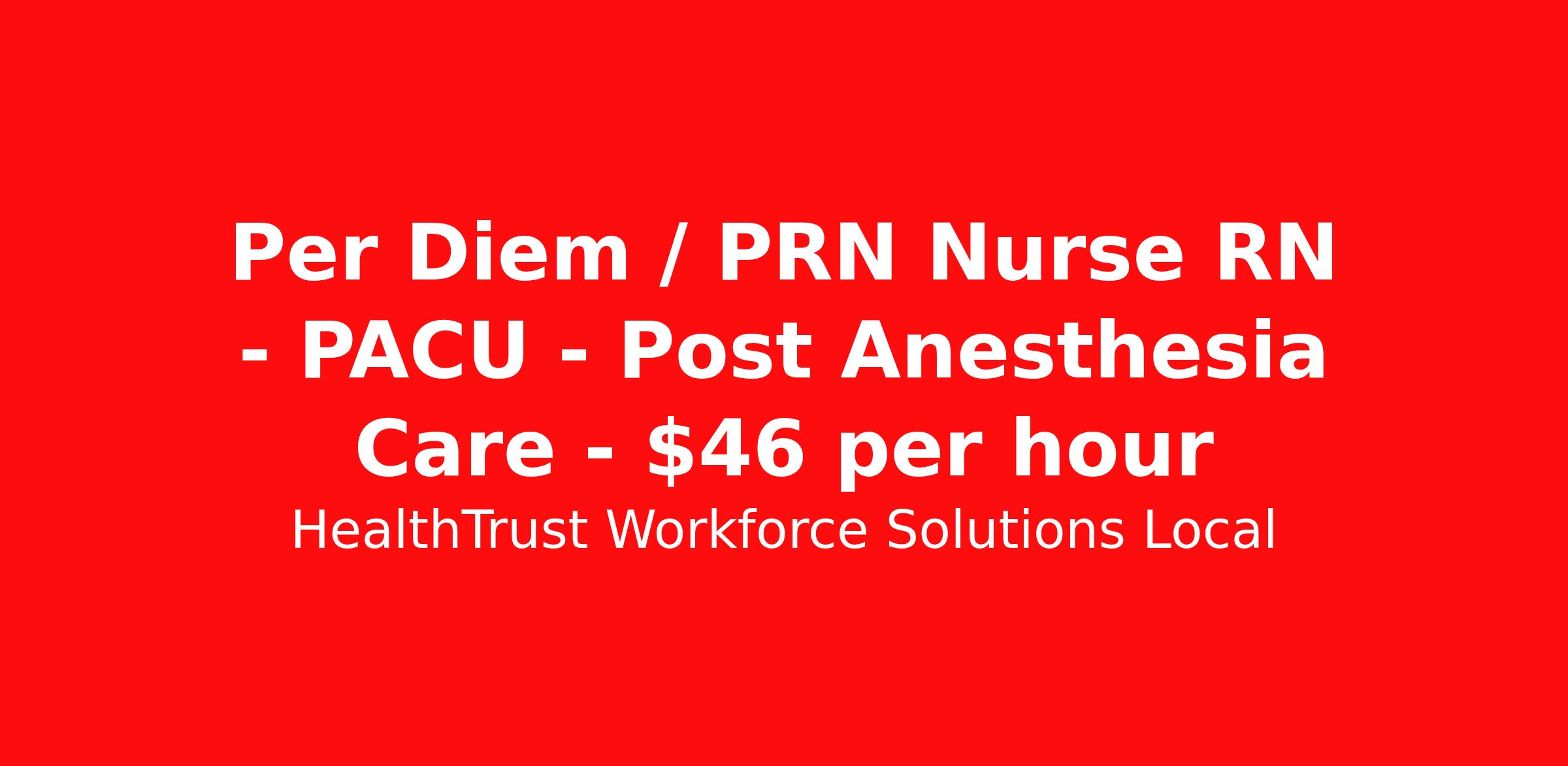 HealthTrust Workforce Solutions Local is seeking a per diem / prn nurse RN PACU - Post Anesthesia Care for a per diem / prn nursing job in Gainesville, Florida. Job Description & Requirements Specialty: PACU - Post Anesthesia Care Discipline: RN Duration: Ongoing Employment Type: Per Diem Posted rates reflects the maximum rate, including night and weekend shift differentials Entrust Your Career to HealthTrust! At HealthTrust, we believe that healthcare is not defined by the four walls in which it is practiced; it’s defined by its people. We pride ourselves on crafting opportunities that expand skill sets, broaden career horizons, provide economic stability, and cultivate personal growth. HealthTrust Offers: Getting to know HCA facilities within 50mi of home zip code Self scheduling through our Mobile GO HWS App Minimum of just three shifts a month, however, you can work more! 401K Matching Weekly pay every Friday Not required to work weekends Not Required to work holidays To get started, you will need: RN's a minimum of 1 year in specialty Allied 6 months of experience An adventurous spirit and fierce dedication Degree in corresponding specialty as required Appropriate certifications for the specific position HealthTrust Benefits: Opportunities for a lifetime: When you become a part of the HCA family, you will have exclusive access to more opportunities than any other healthcare system in the nation. At HWS, we help open the door to a lifetime of lasting career opportunities. A culture of care: Our clinicians have made HWS an industry leader for over 25 years. We are passionate about our mission that, above all else, we are committed to the care and improvement of human life. Career Development: As a wholly owned subsidiary of HCA Healthcare, HWS is a preferred partner to thousands of top-performing hospitals. We provide our healthcare professionals with first-priority access to more than 200,000 jobs nationwide. We are uniquely positioned to offer you exclusive and direct access to HCA Healthcare’s vast network of facilities. Let us open the door to nationwide opportunities that fit your lifestyle! We are an equal opportunity employer and value diversity at our company. We do not discriminate on the basis of race, religion, color, national origin, gender, sexual orientation, age, marital status, veteran status, or disability status. Job Requirements Certifications ACLS (Required) BLS (Required) HealthTrust Workforce Solutions Per Diem Job ID 910150. Posted job title: Per Diem Nurse - Post-Anesthesia Care Unit (PACU)