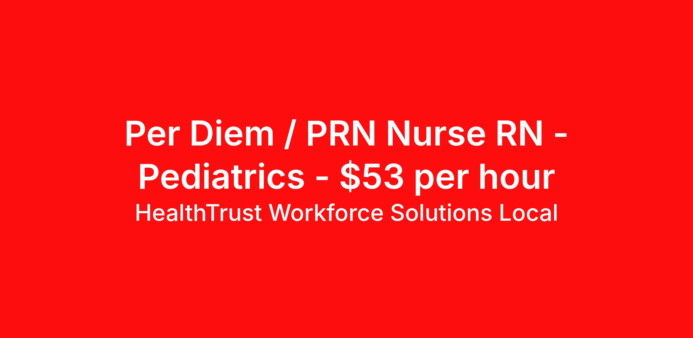 HealthTrust Workforce Solutions Local is seeking a per diem / prn nurse RN Pediatrics for a per diem / prn nursing job in Englewood, Colorado. Job Description & Requirements Specialty: Pediatrics Discipline: RN Duration: Ongoing Employment Type: Per Diem Posted rates reflects the maximum rate, including night and weekend shift differentials Entrust Your Career to HealthTrust! At HealthTrust, we believe that healthcare is not defined by the four walls in which it is practiced; it’s defined by its people. We pride ourselves on crafting opportunities that expand skill sets, broaden career horizons, provide economic stability, and cultivate personal growth. HealthTrust Offers: Getting to know HCA facilities within 50mi of home zip code Self scheduling through our Mobile GO HWS App Minimum of just three shifts a month, however, you can work more! 401K Matching Weekly pay every Friday Not required to work weekends Not Required to work holidays To get started, you will need: RN's a minimum of 1 year in specialty Allied 6 months of experience An adventurous spirit and fierce dedication Degree in corresponding specialty as required Appropriate certifications for the specific position HealthTrust Benefits: Opportunities for a lifetime: When you become a part of the HCA family, you will have exclusive access to more opportunities than any other healthcare system in the nation. At HWS, we help open the door to a lifetime of lasting career opportunities. A culture of care: Our clinicians have made HWS an industry leader for over 25 years. We are passionate about our mission that, above all else, we are committed to the care and improvement of human life. Career Development: As a wholly owned subsidiary of HCA Healthcare, HWS is a preferred partner to thousands of top-performing hospitals. We provide our healthcare professionals with first-priority access to more than 200,000 jobs nationwide. We are uniquely positioned to offer you exclusive and direct access to HCA Healthcare’s vast network of facilities. Let us open the door to nationwide opportunities that fit your lifestyle! We are an equal opportunity employer and value diversity at our company. We do not discriminate on the basis of race, religion, color, national origin, gender, sexual orientation, age, marital status, veteran status, or disability status. Job Requirements Certifications PALS (Required) BLS (Required) HealthTrust Workforce Solutions Per Diem Job ID 527504. Posted job title: Per Diem Nurse - Pediatrics
