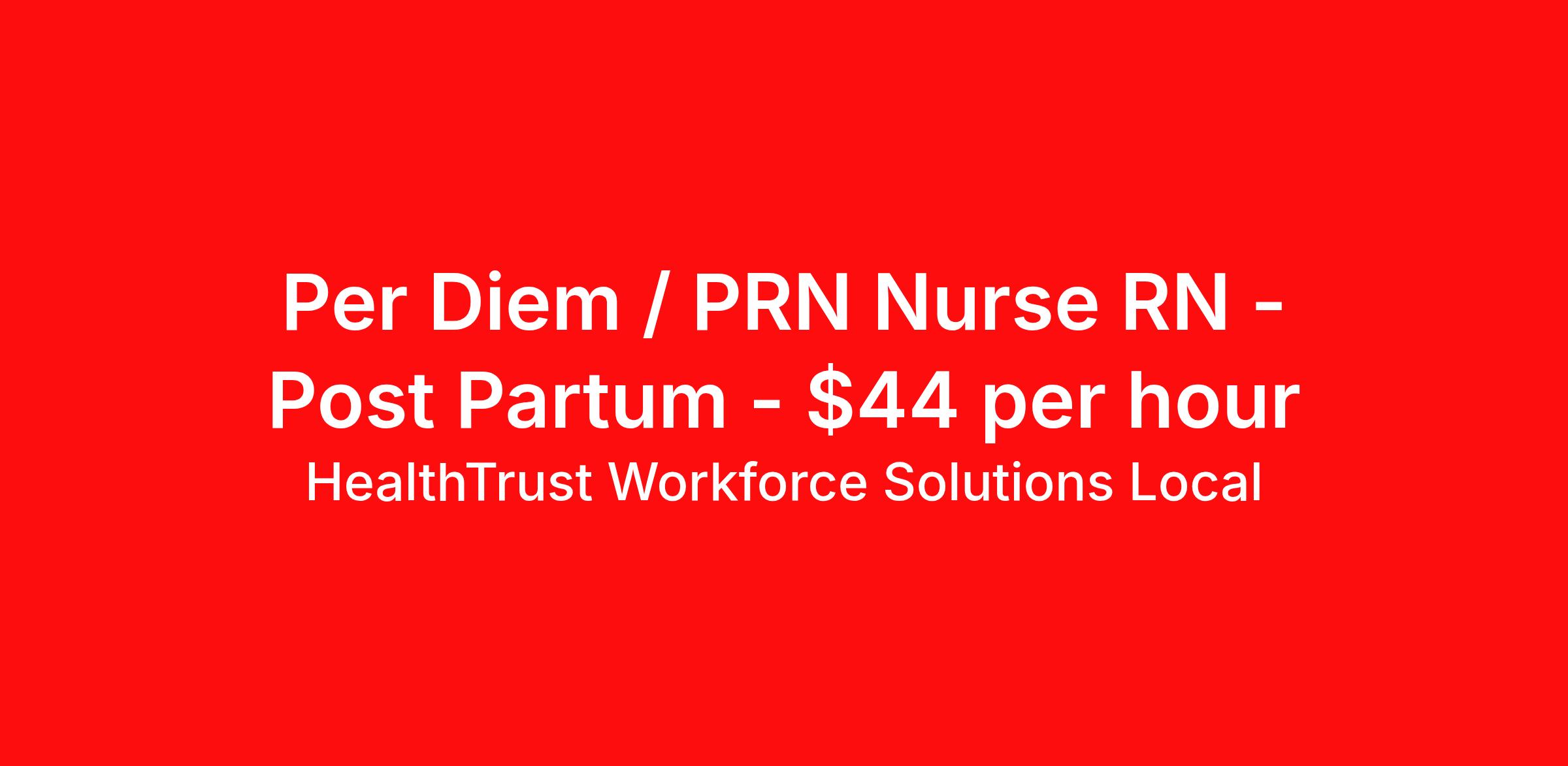 HealthTrust Workforce Solutions Local is seeking a per diem / prn nurse RN Post Partum for a per diem / prn nursing job in Margate, Florida. Job Description & Requirements Specialty: Post Partum Discipline: RN Duration: Ongoing Employment Type: Per Diem Posted rates reflects the maximum rate, including night and weekend shift differentials Entrust Your Career to HealthTrust! At HealthTrust, we believe that healthcare is not defined by the four walls in which it is practiced; it’s defined by its people. We pride ourselves on crafting opportunities that expand skill sets, broaden career horizons, provide economic stability, and cultivate personal growth. HealthTrust Offers: Getting to know HCA facilities within 50mi of home zip code Self scheduling through our Mobile GO HWS App Minimum of just three shifts a month, however, you can work more! 401K Matching Weekly pay every Friday Not required to work weekends Not Required to work holidays To get started, you will need: RN's a minimum of 1 year in specialty Allied 6 months of experience An adventurous spirit and fierce dedication Degree in corresponding specialty as required Appropriate certifications for the specific position HealthTrust Benefits: Opportunities for a lifetime: When you become a part of the HCA family, you will have exclusive access to more opportunities than any other healthcare system in the nation. At HWS, we help open the door to a lifetime of lasting career opportunities. A culture of care: Our clinicians have made HWS an industry leader for over 25 years. We are passionate about our mission that, above all else, we are committed to the care and improvement of human life. Career Development: As a wholly owned subsidiary of HCA Healthcare, HWS is a preferred partner to thousands of top-performing hospitals. We provide our healthcare professionals with first-priority access to more than 200,000 jobs nationwide. We are uniquely positioned to offer you exclusive and direct access to HCA Healthcare’s vast network of facilities. Let us open the door to nationwide opportunities that fit your lifestyle! We are an equal opportunity employer and value diversity at our company. We do not discriminate on the basis of race, religion, color, national origin, gender, sexual orientation, age, marital status, veteran status, or disability status. Job Requirements Certifications NRP (Required) BLS (Required) HealthTrust Workforce Solutions Per Diem Job ID 829625. Posted job title: Per Diem Nurse - Postpartum