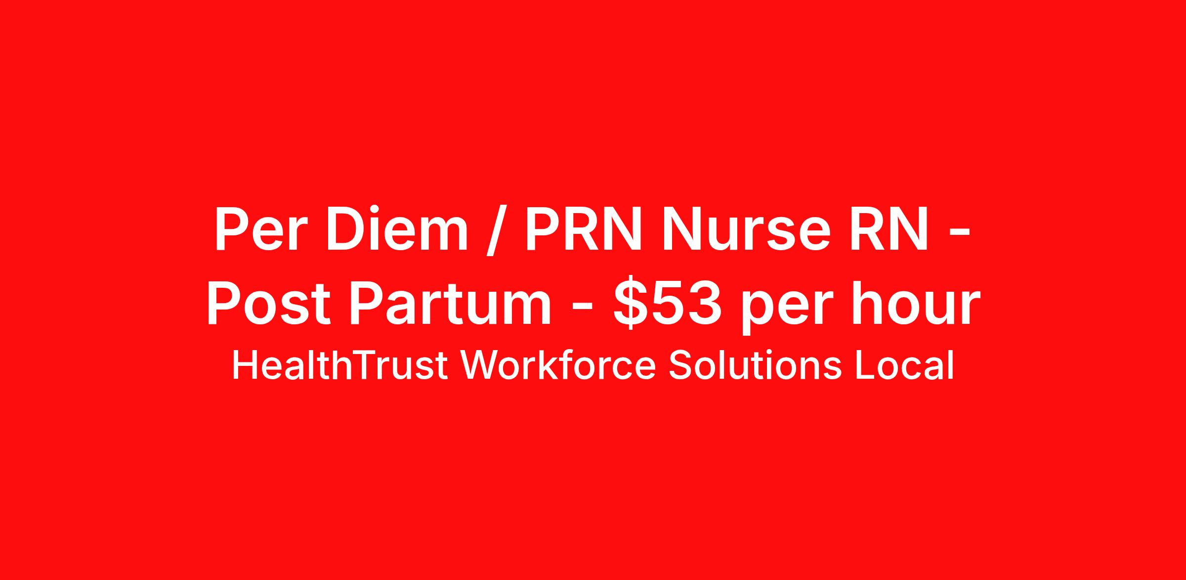 HealthTrust Workforce Solutions Local is seeking a per diem / prn nurse RN Post Partum for a per diem / prn nursing job in Independence, Missouri. Job Description & Requirements Specialty: Post Partum Discipline: RN Start Date: 04/06/2026 Duration: Ongoing Employment Type: Per Diem Posted rates reflects the maximum rate, including night and weekend shift differentials Entrust Your Career to HealthTrust! At HealthTrust, we believe that healthcare is not defined by the four walls in which it is practiced; it’s defined by its people. We pride ourselves on crafting opportunities that expand skill sets, broaden career horizons, provide economic stability, and cultivate personal growth. HealthTrust Offers: Getting to know HCA facilities within 50mi of home zip code Self scheduling through our Mobile GO HWS App Minimum of just three shifts a month, however, you can work more! 401K Matching Weekly pay every Friday Not required to work weekends Not Required to work holidays To get started, you will need: RN's a minimum of 1 year in specialty Allied 6 months of experience An adventurous spirit and fierce dedication Degree in corresponding specialty as required Appropriate certifications for the specific position HealthTrust Benefits: Opportunities for a lifetime: When you become a part of the HCA family, you will have exclusive access to more opportunities than any other healthcare system in the nation. At HWS, we help open the door to a lifetime of lasting career opportunities. A culture of care: Our clinicians have made HWS an industry leader for over 25 years. We are passionate about our mission that, above all else, we are committed to the care and improvement of human life. Career Development: As a wholly owned subsidiary of HCA Healthcare, HWS is a preferred partner to thousands of top-performing hospitals. We provide our healthcare professionals with first-priority access to more than 200,000 jobs nationwide. We are uniquely positioned to offer you exclusive and direct access to HCA Healthcare’s vast network of facilities. Let us open the door to nationwide opportunities that fit your lifestyle! We are an equal opportunity employer and value diversity at our company. We do not discriminate on the basis of race, religion, color, national origin, gender, sexual orientation, age, marital status, veteran status, or disability status. Job Requirements Certifications NRP (Required) BLS (Required) HealthTrust Workforce Solutions Per Diem Job ID 874819. Posted job title: Per Diem Nurse - Postpartum