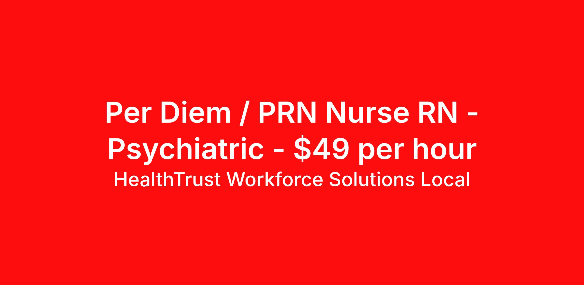 HealthTrust Workforce Solutions Local is seeking a per diem / prn nurse RN Psychiatric for a per diem / prn nursing job in Jasper, Tennessee. Job Description & Requirements Specialty: Psychiatric Discipline: RN Start Date: 04/06/2026 Duration: Ongoing Employment Type: Per Diem Posted rates reflects the maximum rate, including night and weekend shift differentials Entrust Your Career to HealthTrust! At HealthTrust, we believe that healthcare is not defined by the four walls in which it is practiced; it’s defined by its people. We pride ourselves on crafting opportunities that expand skill sets, broaden career horizons, provide economic stability, and cultivate personal growth. HealthTrust Offers: Getting to know HCA facilities within 50mi of home zip code Self scheduling through our Mobile GO HWS App Minimum of just three shifts a month, however, you can work more! 401K Matching Weekly pay every Friday Not required to work weekends Not Required to work holidays To get started, you will need: RN's a minimum of 1 year in specialty Allied 6 months of experience An adventurous spirit and fierce dedication Degree in corresponding specialty as required Appropriate certifications for the specific position HealthTrust Benefits: Opportunities for a lifetime: When you become a part of the HCA family, you will have exclusive access to more opportunities than any other healthcare system in the nation. At HWS, we help open the door to a lifetime of lasting career opportunities. A culture of care: Our clinicians have made HWS an industry leader for over 25 years. We are passionate about our mission that, above all else, we are committed to the care and improvement of human life. Career Development: As a wholly owned subsidiary of HCA Healthcare, HWS is a preferred partner to thousands of top-performing hospitals. We provide our healthcare professionals with first-priority access to more than 200,000 jobs nationwide. We are uniquely positioned to offer you exclusive and direct access to HCA Healthcare’s vast network of facilities. Let us open the door to nationwide opportunities that fit your lifestyle! We are an equal opportunity employer and value diversity at our company. We do not discriminate on the basis of race, religion, color, national origin, gender, sexual orientation, age, marital status, veteran status, or disability status. Job Requirements Certifications CPI (Required) BLS (Required) HealthTrust Workforce Solutions Per Diem Job ID 800113. Posted job title: Per Diem Nurse - Psychiatry