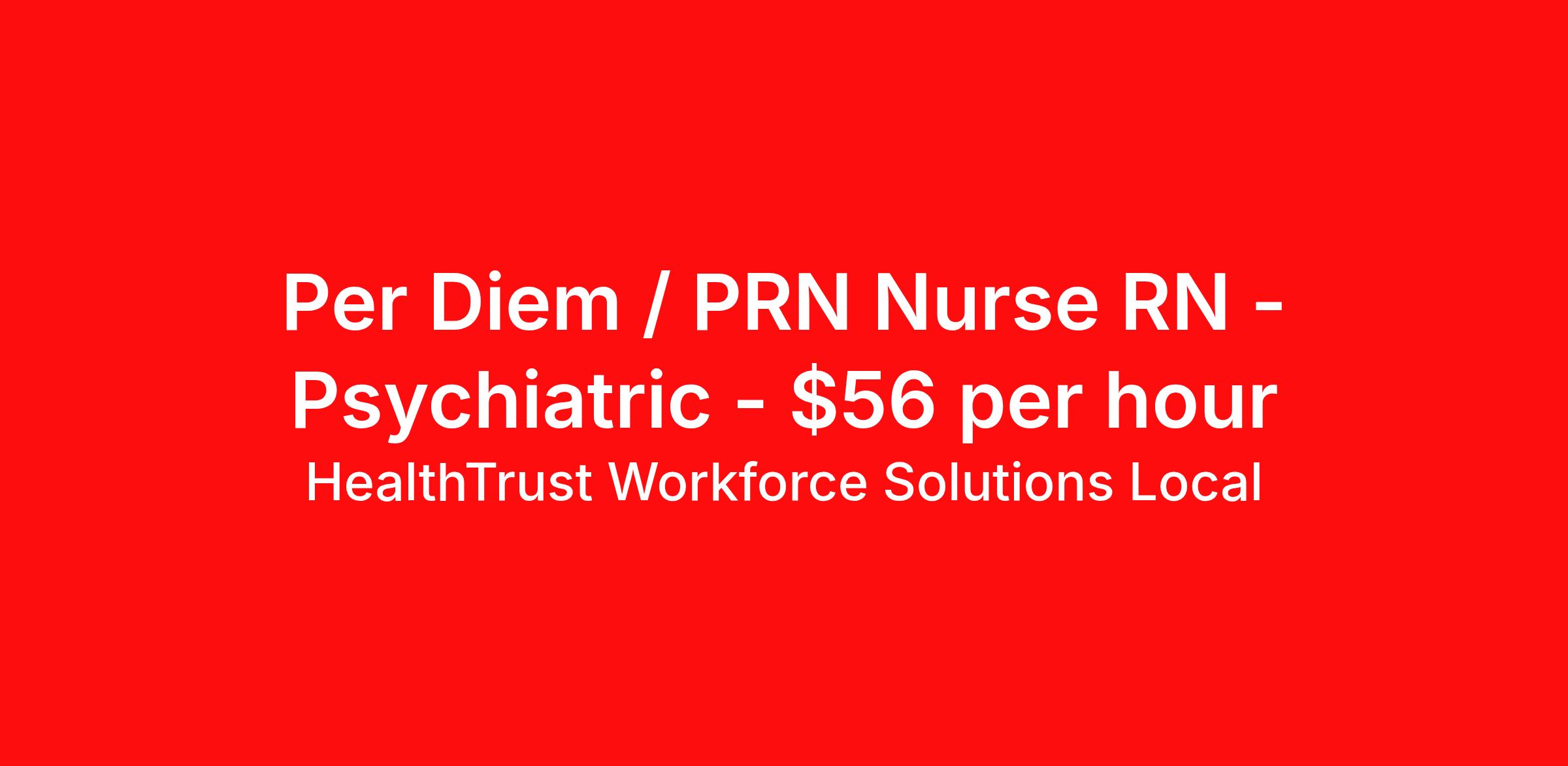 HealthTrust Workforce Solutions Local is seeking a per diem / prn nurse RN Psychiatric for a per diem / prn nursing job in Idaho Falls, Idaho. Job Description & Requirements Specialty: Psychiatric Discipline: RN Start Date: 04/06/2026 Duration: Ongoing Employment Type: Per Diem Posted rates reflects the maximum rate, including night and weekend shift differentials Entrust Your Career to HealthTrust! At HealthTrust, we believe that healthcare is not defined by the four walls in which it is practiced; it’s defined by its people. We pride ourselves on crafting opportunities that expand skill sets, broaden career horizons, provide economic stability, and cultivate personal growth. HealthTrust Offers: Getting to know HCA facilities within 50mi of home zip code Self scheduling through our Mobile GO HWS App Minimum of just three shifts a month, however, you can work more! 401K Matching Weekly pay every Friday Not required to work weekends Not Required to work holidays To get started, you will need: RN's a minimum of 1 year in specialty Allied 6 months of experience An adventurous spirit and fierce dedication Degree in corresponding specialty as required Appropriate certifications for the specific position HealthTrust Benefits: Opportunities for a lifetime: When you become a part of the HCA family, you will have exclusive access to more opportunities than any other healthcare system in the nation. At HWS, we help open the door to a lifetime of lasting career opportunities. A culture of care: Our clinicians have made HWS an industry leader for over 25 years. We are passionate about our mission that, above all else, we are committed to the care and improvement of human life. Career Development: As a wholly owned subsidiary of HCA Healthcare, HWS is a preferred partner to thousands of top-performing hospitals. We provide our healthcare professionals with first-priority access to more than 200,000 jobs nationwide. We are uniquely positioned to offer you exclusive and direct access to HCA Healthcare’s vast network of facilities. Let us open the door to nationwide opportunities that fit your lifestyle! We are an equal opportunity employer and value diversity at our company. We do not discriminate on the basis of race, religion, color, national origin, gender, sexual orientation, age, marital status, veteran status, or disability status. Job Requirements Certifications CPI (Required) BLS (Required) HealthTrust Workforce Solutions Per Diem Job ID 959359. Posted job title: Per Diem Nurse - Psychiatry