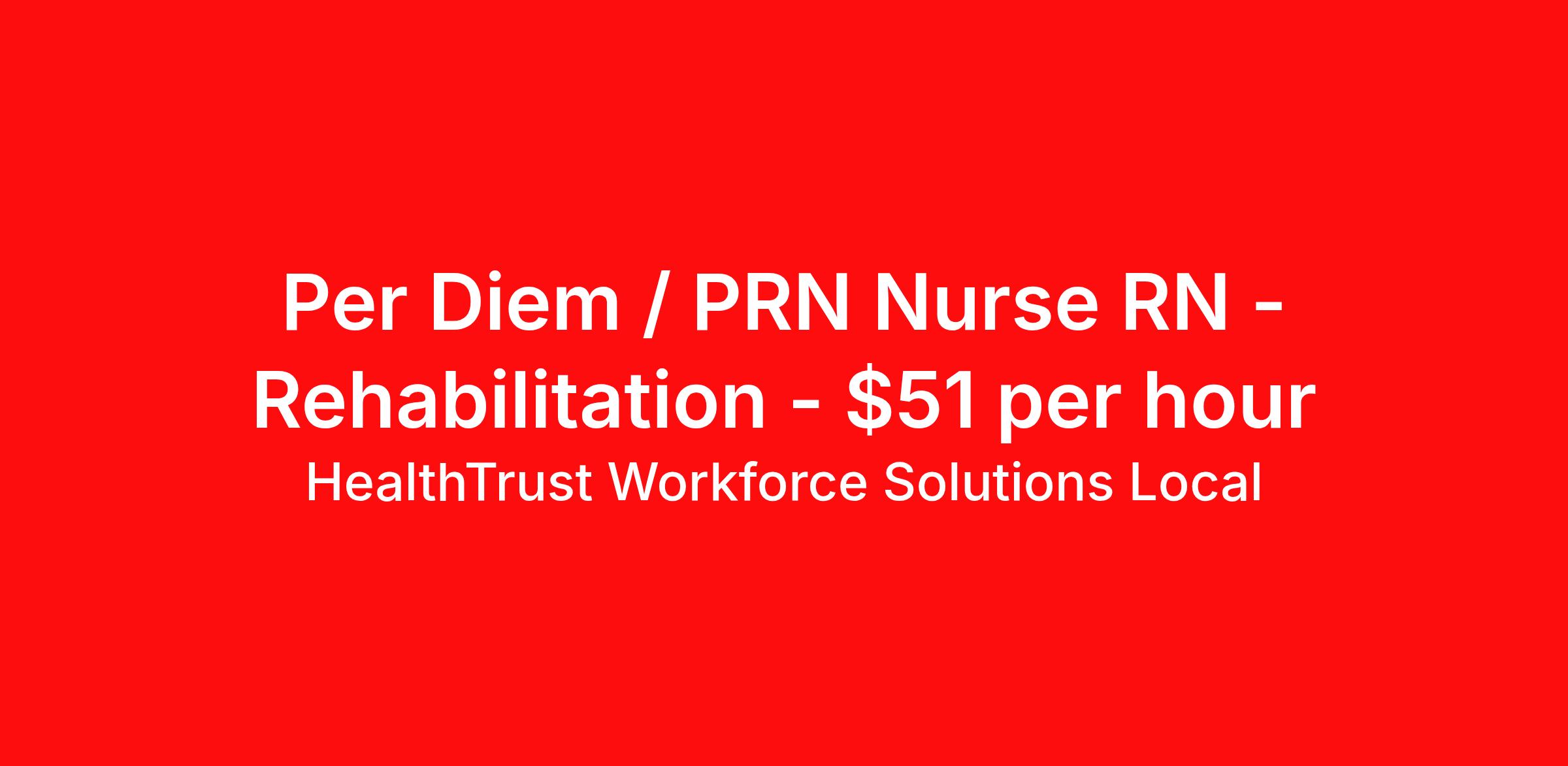 HealthTrust Workforce Solutions Local is seeking a per diem / prn nurse RN Rehabilitation for a per diem / prn nursing job in North Charleston, South Carolina. Job Description & Requirements Specialty: Rehabilitation Discipline: RN Duration: Ongoing Employment Type: Per Diem Posted rates reflects the maximum rate, including night and weekend shift differentials Entrust Your Career to HealthTrust! At HealthTrust, we believe that healthcare is not defined by the four walls in which it is practiced; it’s defined by its people. We pride ourselves on crafting opportunities that expand skill sets, broaden career horizons, provide economic stability, and cultivate personal growth. HealthTrust Offers: Getting to know HCA facilities within 50mi of home zip code Self scheduling through our Mobile GO HWS App Minimum of just three shifts a month, however, you can work more! 401K Matching Weekly pay every Friday Not required to work weekends Not Required to work holidays To get started, you will need: RN's a minimum of 1 year in specialty Allied 6 months of experience An adventurous spirit and fierce dedication Degree in corresponding specialty as required Appropriate certifications for the specific position HealthTrust Benefits: Opportunities for a lifetime: When you become a part of the HCA family, you will have exclusive access to more opportunities than any other healthcare system in the nation. At HWS, we help open the door to a lifetime of lasting career opportunities. A culture of care: Our clinicians have made HWS an industry leader for over 25 years. We are passionate about our mission that, above all else, we are committed to the care and improvement of human life. Career Development: As a wholly owned subsidiary of HCA Healthcare, HWS is a preferred partner to thousands of top-performing hospitals. We provide our healthcare professionals with first-priority access to more than 200,000 jobs nationwide. We are uniquely positioned to offer you exclusive and direct access to HCA Healthcare’s vast network of facilities. Let us open the door to nationwide opportunities that fit your lifestyle! We are an equal opportunity employer and value diversity at our company. We do not discriminate on the basis of race, religion, color, national origin, gender, sexual orientation, age, marital status, veteran status, or disability status. Job Requirements Certifications : BLS (Required) HealthTrust Workforce Solutions Per Diem Job ID 863413. Posted job title: Per Diem Nurse - Rehabilitation