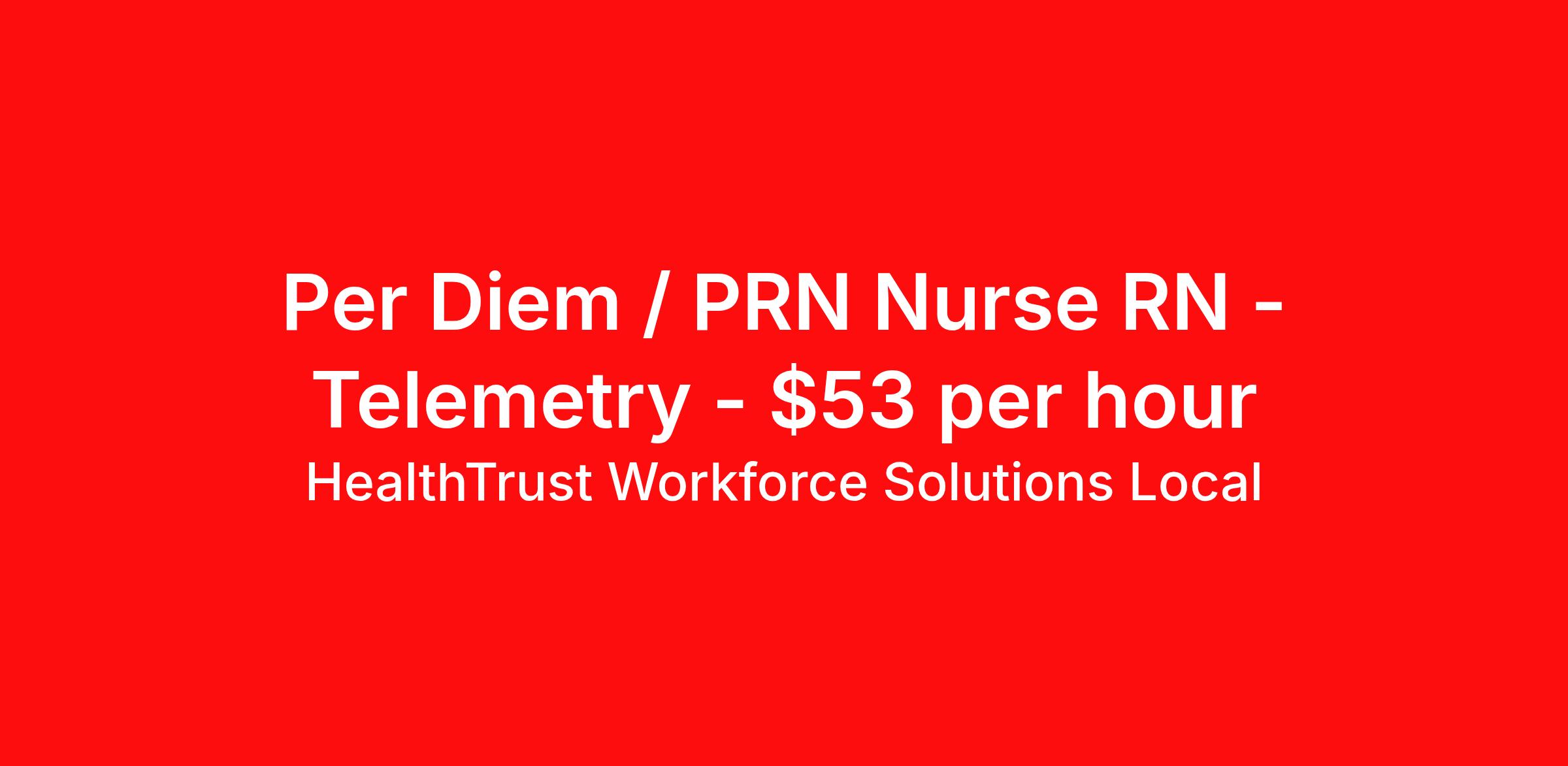 HealthTrust Workforce Solutions Local is seeking a per diem / prn nurse RN Telemetry for a per diem / prn nursing job in Inverness, Florida. Job Description & Requirements Specialty: Telemetry Discipline: RN Start Date: 04/06/2026 Duration: Ongoing Employment Type: Per Diem Posted rates reflects the maximum rate, including night and weekend shift differentials Entrust Your Career to HealthTrust! At HealthTrust, we believe that healthcare is not defined by the four walls in which it is practiced; it’s defined by its people. We pride ourselves on crafting opportunities that expand skill sets, broaden career horizons, provide economic stability, and cultivate personal growth. HealthTrust Offers: Getting to know HCA facilities within 50mi of home zip code Self scheduling through our Mobile GO HWS App Minimum of just three shifts a month, however, you can work more! 401K Matching Weekly pay every Friday Not required to work weekends Not Required to work holidays To get started, you will need: RN's a minimum of 1 year in specialty Allied 6 months of experience An adventurous spirit and fierce dedication Degree in corresponding specialty as required Appropriate certifications for the specific position HealthTrust Benefits: Opportunities for a lifetime: When you become a part of the HCA family, you will have exclusive access to more opportunities than any other healthcare system in the nation. At HWS, we help open the door to a lifetime of lasting career opportunities. A culture of care: Our clinicians have made HWS an industry leader for over 25 years. We are passionate about our mission that, above all else, we are committed to the care and improvement of human life. Career Development: As a wholly owned subsidiary of HCA Healthcare, HWS is a preferred partner to thousands of top-performing hospitals. We provide our healthcare professionals with first-priority access to more than 200,000 jobs nationwide. We are uniquely positioned to offer you exclusive and direct access to HCA Healthcare’s vast network of facilities. Let us open the door to nationwide opportunities that fit your lifestyle! We are an equal opportunity employer and value diversity at our company. We do not discriminate on the basis of race, religion, color, national origin, gender, sexual orientation, age, marital status, veteran status, or disability status. Job Requirements Certifications ACLS (Required) NIHSS (Required) BLS (Required) HealthTrust Workforce Solutions Per Diem Job ID 385182. Posted job title: Per Diem Nurse - Telemetry