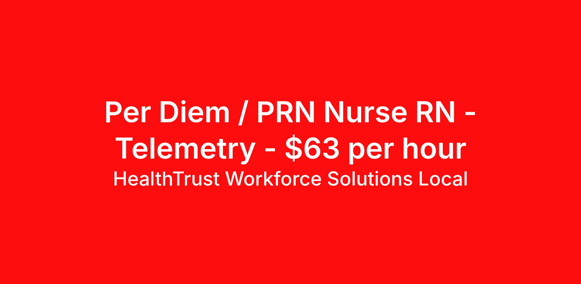 HealthTrust Workforce Solutions Local is seeking a per diem / prn nurse RN Telemetry for a per diem / prn nursing job in Las Vegas, Nevada. Job Description & Requirements Specialty: Telemetry Discipline: RN Start Date: 04/06/2026 Duration: Ongoing Employment Type: Per Diem Posted rates reflects the maximum rate, including night and weekend shift differentials Entrust Your Career to HealthTrust! At HealthTrust, we believe that healthcare is not defined by the four walls in which it is practiced; it’s defined by its people. We pride ourselves on crafting opportunities that expand skill sets, broaden career horizons, provide economic stability, and cultivate personal growth. HealthTrust Offers: Getting to know HCA facilities within 50mi of home zip code Self scheduling through our Mobile GO HWS App Minimum of just three shifts a month, however, you can work more! 401K Matching Weekly pay every Friday Not required to work weekends Not Required to work holidays To get started, you will need: RN's a minimum of 1 year in specialty Allied 6 months of experience An adventurous spirit and fierce dedication Degree in corresponding specialty as required Appropriate certifications for the specific position HealthTrust Benefits: Opportunities for a lifetime: When you become a part of the HCA family, you will have exclusive access to more opportunities than any other healthcare system in the nation. At HWS, we help open the door to a lifetime of lasting career opportunities. A culture of care: Our clinicians have made HWS an industry leader for over 25 years. We are passionate about our mission that, above all else, we are committed to the care and improvement of human life. Career Development: As a wholly owned subsidiary of HCA Healthcare, HWS is a preferred partner to thousands of top-performing hospitals. We provide our healthcare professionals with first-priority access to more than 200,000 jobs nationwide. We are uniquely positioned to offer you exclusive and direct access to HCA Healthcare’s vast network of facilities. Let us open the door to nationwide opportunities that fit your lifestyle! We are an equal opportunity employer and value diversity at our company. We do not discriminate on the basis of race, religion, color, national origin, gender, sexual orientation, age, marital status, veteran status, or disability status. Job Requirements Certifications ACLS (Required) NIHSS (Required) BLS (Required) HealthTrust Workforce Solutions Per Diem Job ID 347257. Posted job title: Per Diem Nurse - Telemetry