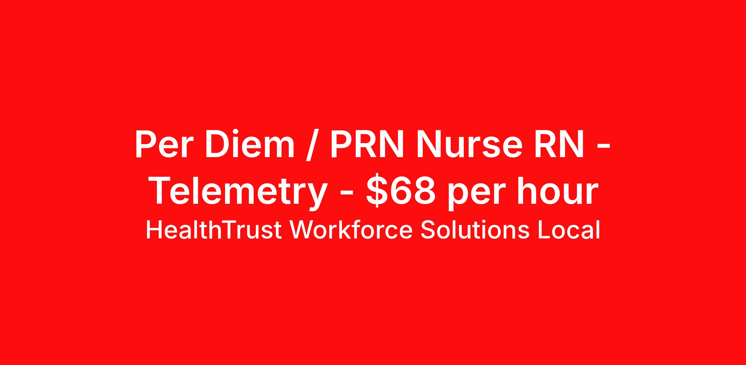 HealthTrust Workforce Solutions Local is seeking a per diem / prn nurse RN Telemetry for a per diem / prn nursing job in Manchester, New Hampshire. Job Description & Requirements Specialty: Telemetry Discipline: RN Duration: Ongoing Employment Type: Per Diem Posted rates reflects the maximum rate, including night and weekend shift differentials Entrust Your Career to HealthTrust! At HealthTrust, we believe that healthcare is not defined by the four walls in which it is practiced; it’s defined by its people. We pride ourselves on crafting opportunities that expand skill sets, broaden career horizons, provide economic stability, and cultivate personal growth. HealthTrust Offers: Getting to know HCA facilities within 50mi of home zip code Self scheduling through our Mobile GO HWS App Minimum of just three shifts a month, however, you can work more! 401K Matching Weekly pay every Friday Not required to work weekends Not Required to work holidays To get started, you will need: RN's a minimum of 1 year in specialty Allied 6 months of experience An adventurous spirit and fierce dedication Degree in corresponding specialty as required Appropriate certifications for the specific position HealthTrust Benefits: Opportunities for a lifetime: When you become a part of the HCA family, you will have exclusive access to more opportunities than any other healthcare system in the nation. At HWS, we help open the door to a lifetime of lasting career opportunities. A culture of care: Our clinicians have made HWS an industry leader for over 25 years. We are passionate about our mission that, above all else, we are committed to the care and improvement of human life. Career Development: As a wholly owned subsidiary of HCA Healthcare, HWS is a preferred partner to thousands of top-performing hospitals. We provide our healthcare professionals with first-priority access to more than 200,000 jobs nationwide. We are uniquely positioned to offer you exclusive and direct access to HCA Healthcare’s vast network of facilities. Let us open the door to nationwide opportunities that fit your lifestyle! We are an equal opportunity employer and value diversity at our company. We do not discriminate on the basis of race, religion, color, national origin, gender, sexual orientation, age, marital status, veteran status, or disability status. Job Requirements Certifications ACLS (Required) NIHSS (Required) BLS (Required) HealthTrust Workforce Solutions Per Diem Job ID 921652. Posted job title: Per Diem Nurse - Telemetry
