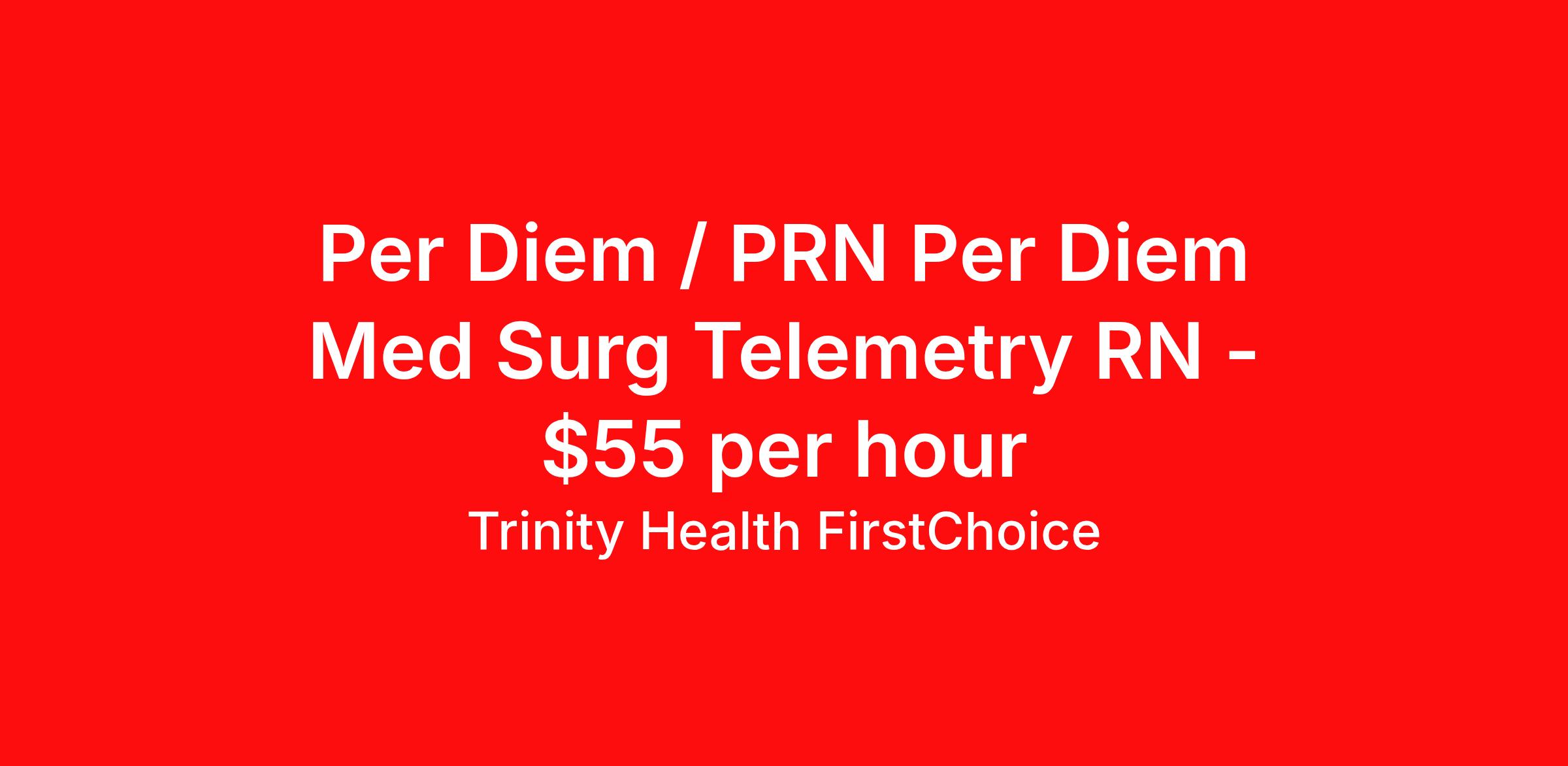Trinity Health FirstChoice is seeking a per diem / prn nurse RN Med Surg / Telemetry for a per diem / prn nursing job in Boise, Idaho. Job Description & Requirements Specialty: Med Surg / Telemetry Discipline: RN Start Date: ASAP Duration: Ongoing Shift: nights Employment Type: Per Diem Employment Type: Part time Shift: Description: Per Diem, Registered Nurse, RN, Med Surg/Tele Position Purpose: Are you an experienced Registered Nurse looking for premium compensation and maximum flexibility? Explore FirstChoice – Trinity Health's mobile staffing solution! FirstChoice RNs are utilized to fill short and long-term assignments throughout the health system, and we need you to be a part of this innovative program! Nationwide and Regional opportunities available! What you will do: Qualified and willing to float throughout the hospital and/or throughout multiple hospital locations and/or regions Knows, understands, incorporates & demonstrates standard elements of professional practice: Assess, Outcomes Identification / Solutions, Plan, Implement, Evaluate Acts independently & appropriately within license, scope of knowledge & experience in practice area Retains accountability for delegation, choices, decisions & outcomes Collaborates with key stakeholders & contributes to quality & improvement practices & outcomes Exhibits agility & willingness to take on new & additional responsibilities Embraces new ideas & cultural differences while managing competing priorities Minimum Qualifications: Graduation from an accredited school of nursing. Valid RN licensure authorized in the applicable state(s) of practice/employment. Minimum of eighteen (18) months of recent clinical experience for Med Surg, Tele and PCU. Minimum two (2) years of recent clinical experience for all remaining specialties including Critical Care, Surgical Services, Maternal Services, Emergency Department and Behavioral Health. Required to have and maintain the credentials required per their specialty area (ex: ACLS, TNCC, etc). BLS, ACLS and PALS must be obtained through American Heart Association Position Highlights and Benefits: Premium Pay Flexible Scheduling Travel and Per Diem opportunities available Variety of Practice Settings Learning Opportunities DailyPay available Reimbursement of License and Certifications available per assignment Opportunity to participate in 403B program Ministry Information: FirstChoice offers rewarding Nursing, Respiratory Therapist, Surgical Technologist, and Health Care Professional travel positions with a flexible schedule to fit your life. FirstChoice travel Health Care Professionals fill critical positions when unforeseen or unplanned circumstances occur; or, when there is a position open due to an extended leave-of-absence. You’ll get to experience a variety of practice settings while traveling within your local region or traveling nationally – your choice! Job Details: Location: St. Alphonsus Health System Start Date: Flexible Weeks: Continuous Hours: Minimum 24 hours in 4-week period Shift: Nights Hourly Rate: $55.00 Our Commitment Rooted in our Mission and Core Values, we honor the dignity of every person and recognize the unique perspectives, experiences, and talents each colleague brings. By finding common ground and embracing our differences, we grow stronger together and deliver more compassionate, person-centered care. We are an Equal Opportunity Employer. All qualified applicants will receive consideration for employment without regard to race, color, religion, sex, sexual orientation, gender identity, national origin, disability, veteran status, or any other status protected by federal, state, or local law. Trinity Health FirstChoice Job ID 00639186. Posted job title: Per Diem, Registered Nurse, RN, Med Surg/Tele About Trinity Health FirstChoice Premium pay FirstChoice offers a rewarding career with significant p remium pay and flexible scheduling to fit your life. FirstChoice h ealthcare travel professionals fill critical positions when unforeseen or unplanned circumstances occur; or, when there is a position open due to an extended leave-of-absence. You’ll get to experience a variety of practice settings while traveling within your local region or traveling nationally – your choice! Healthcare travel professionals, join us in caring for our community, we can't do it without you. FirstChoice exclusively supports facilities within the Trinity Health system meaning you will have a consistent experience between job sites. Your training at one site will apply to other sites within the region and will minimize the time you are spending outside of patient care. We understand that there has been a fundamental shift in the nursing position in recent years and like any other employee, nurses want more options and flexibility in their careers. FirstChoice provides you with both along with the comfort and security of one employer. Benefits of Being a FirstChoice healthcare travel professional: Premium pay Choose your own travel adventure—work in a variety of practice settings Wide range of assignments available Housing and meal stipend Minimum Qualifications/Requirements of a FirstChoice Nurse: Registered nurse with a license in the state(s) you will work Minimum of 2 years, depending on specialty area Cannot hold a concurrent position at a Trinity Health facility Trinity Health is a leading not-for-profit Catholic health system with 92 hospitals and hundreds of primary, specialty and continuing care centers across the United States. Benefits Employee assistance programs 403b retirement plan Discount program