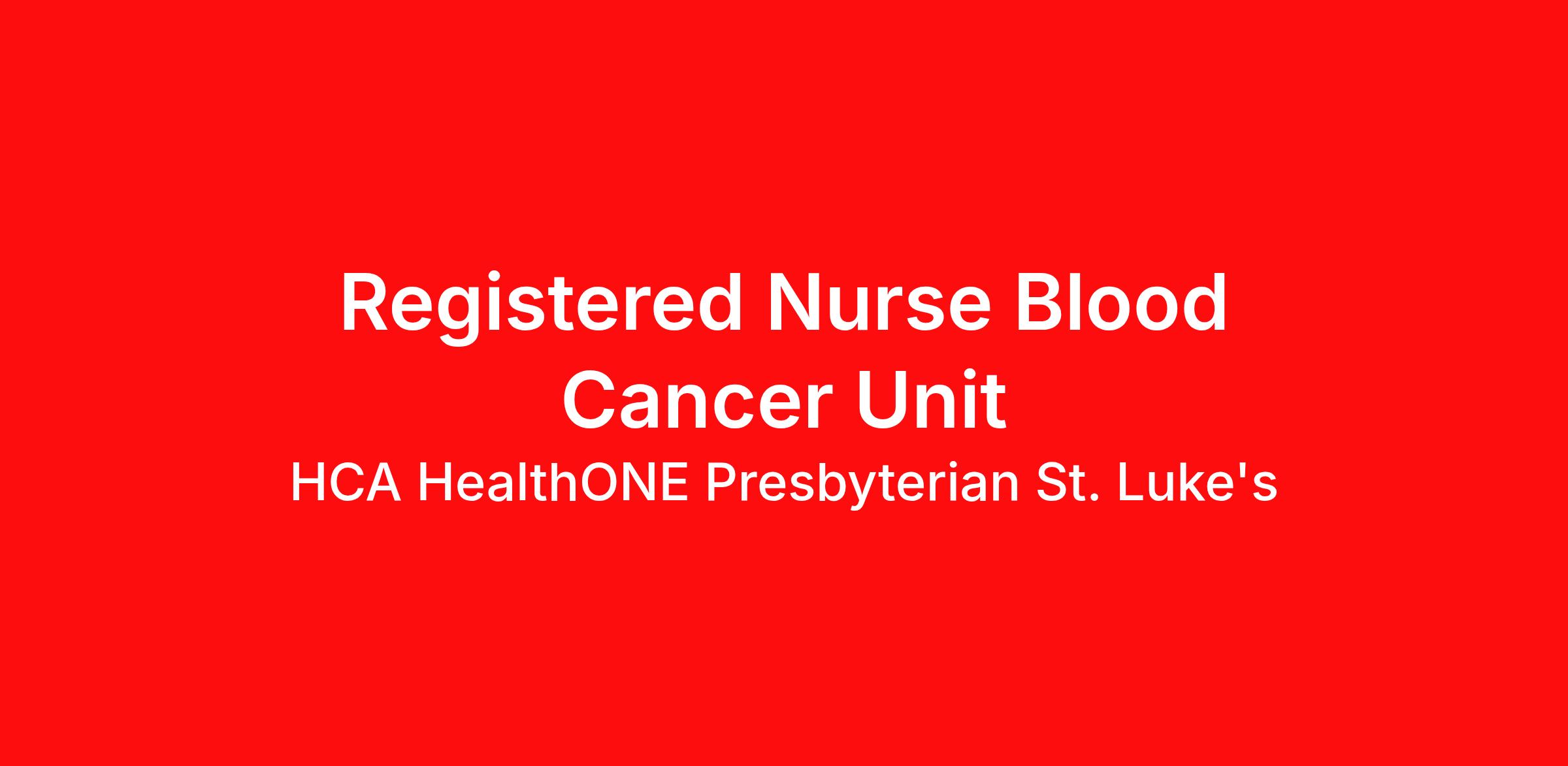 Hourly Wage Estimate: $36.50 - $55.25 / hour Learn more about the benefits offered for this job. The estimate displayed represents the typical wage range of candidates hired. Factors that may be used to determine your actual salary may include your specific skills, how many years of experience you have and comparison to other employees already in this role. The typical candidate is hired below midpoint of the range. *Now offering recently increased hourly rates for RNs Introduction Do you currently have an opportunity to make a real impact with your work? With over 2,000 sites of care and serving over 31.2 million patient interactions every year, nurses at HCA HealthONE Presbyterian St. Luke's have the opportunity to make a real impact. As a(an) Registered Nurse Blood Cancer Unit you can be a part of change. Benefits HCA HealthONE Presbyterian St. Luke's, offers a total rewards package that supports the health, life, career and retirement of our colleagues. The available plans and programs include: Comprehensive medical coverage that covers many common services at no cost or for a low copay. Plans include prescription drug and behavioral health coverage as well as free telemedicine services and free AirMed medical transportation. Additional options for dental and vision benefits, life and disability coverage, flexible spending accounts, supplemental health protection plans (accident, critical illness, hospital indemnity), auto and home insurance, identity theft protection, legal counseling, long-term care coverage, moving assistance, pet insurance and more. Free counseling services and resources for emotional, physical and financial wellbeing 401(k) Plan with a 100% match on 3% to 9% of pay (based on years of service) Employee Stock Purchase Plan with 10% off HCA Healthcare stock Family support through fertility and family building benefits with Progyny and adoption assistance. Referral services for child, elder and pet care, home and auto repair, event planning and more Consumer discounts through Abenity and Consumer Discounts Retirement readiness, rollover assistance services and preferred banking partnerships Education assistance (tuition, student loan, certification support, dependent scholarships) Colleague recognition program Time Away From Work Program (paid time off, paid family leave, long- and short-term disability coverage and leaves of absence) Employee Health Assistance Fund that offers free employee-only coverage to full-time and part-time colleagues based on income. Learn more about Employee Benefits Note: Eligibility for benefits may vary by location. It is an exciting time to be a nurse at HCA Healthcare! Come unlock your career potential and see how rewarding it can be to reach your personal and professional goals. Help to advance the practice of nursing and improve positive outcomes for your patients as a (an) Registered Nurse Blood Cancer Unit. We want your knowledge and expertise! Job Summary and Qualifications This position supports the mission of Presbyterian/St Luke’s Medical Center of optimizing quality of life of all those served by expanding beyond the traditional focus on medical needs to the needs of the whole person. The Oncology RN oversees and directs the care of the patient with hematologic/oncologic diagnosis. The Oncology RN is responsible for the care of medical and surgical patients. Serves as primary nurse leading the collaboration of all disciplines for well-coordinated patient care. Oversees and directs the care of assistive personnel, maintaining final accountability for the care given to assigned patients. Within the first year the RN will have gained basic clinical knowledge and skills of caring for hematology/oncology patients. When the need arises, will perform other duties as assigned by supervisor. What you will do in this role: You will be delivering patient care to Oncology patients based on the physical, psychosocial, cultural, safety and learning needs of the individual. You will be demonstrating your advanced knowledge, skills and understanding of all aspects of the population served in the care of your patients. You will be providing safe and appropriate care within our Values and Standards of Nursing Practice. What qualifications you will need for this role: Current licensure in the State of Colorado as a Registered Nurse, or current active multi-state Registered Nurse license Basic Life Support certification through the American Heart Association or American Red Cross Graduate from an accredited school of nursing 1-3 years of experience Acute care experience preferred HCA HealthONE, one of the largest and most comprehensive healthcare systems in the Rocky Mountain region, offers more than 170 care sites in the Denver metro area. Offering services across the continuum of care to meet patients’ total healthcare needs, HCA HealthONE includes seven acute care hospitals, a dedicated flagship pediatric hospital, a rehabilitation hospital, CareNow® urgent care clinics, mental health campuses, imaging and surgery centers, physician practices, home and hospice care, and AirLife Denver, which provides regional critical care air and ground transportation. Among HCA HealthONE’s acute care hospitals is Presbyterian/St. Luke’s (P/SL). P/SL has been meeting the healthcare needs of patients and their families from across the Rocky Mountain region for more than 140 years. Included on the P/SL campus is Rocky Mountain Children’s, a dedicated pediatric hospital, making the campus the only tertiary/quaternary combined pediatric and adult hospital in this region. P/SL is home to an award-winning cancer program including the Colorado Blood Cancer Institute, a solid organ transplant program, and complex orthopedics. Consistently among the Denver Business Journals’ list of top corporate philanthropists in the Denver-metro area, HCA HealthONE was named as one of the most community-minded organizations by The Civic 50 and contributed more than $1