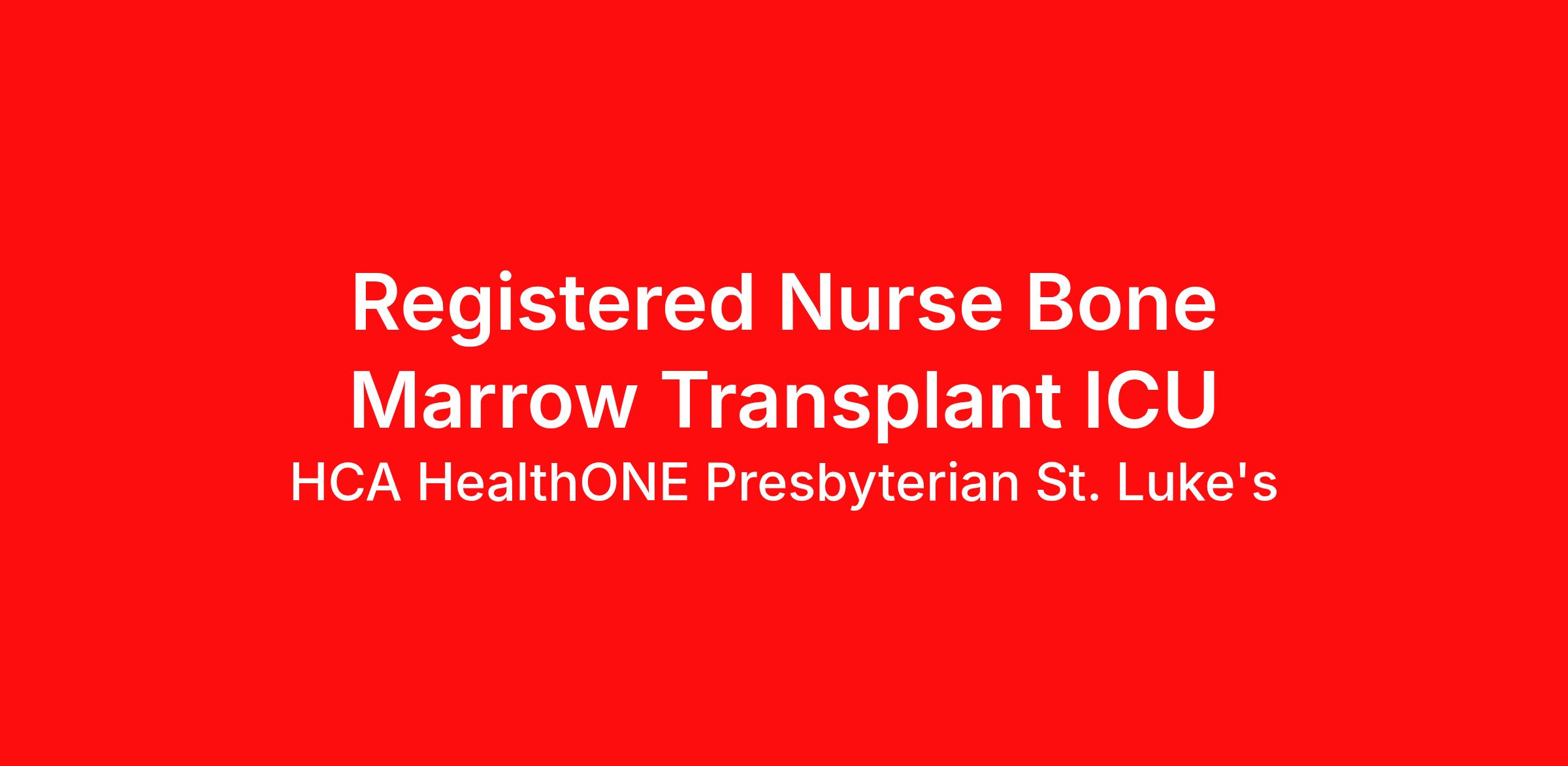 Hourly Wage Estimate: $39.00 - $57.00 / hour Learn more about the benefits offered for this job. The estimate displayed represents the typical wage range of candidates hired. Factors that may be used to determine your actual salary may include your specific skills, how many years of experience you have and comparison to other employees already in this role. The typical candidate is hired below midpoint of the range. Introduction Do you have the career opportunities as a Registered Nurse Bone Marrow Transplant ICU you want in your current role? We invest in what matters most to nurses like you – at home, at work, and at every stage in your career. We have an exciting opportunity for you to join HCA HealthONE Presbyterian St. Luke's which is a part of the nation’s leading provider of healthcare services, HCA Healthcare. Do you want to work where you have a voice? Nurses are at the forefront of our commitment to the care and improvement of human life. At HCA Healthcare, there are many ways for nurses to have a voice through professional practice councils, advisory councils, vital voices surveys, and units of distinction. We learn from our multi-generational nursing family. We partner with our Nurses at HCA HealthONE Presbyterian St. Luke's! Job Summary and Qualifications As a Registered Nurse onthe Bone Marrow Transplant Unit, you will be joining a team of professionals who are dedicated todeliverexcellent care to our patients. You will enable patients to reach their goals through care specifically designed to cater to individual patientneeds, andalso administered by some of the most highly skilled and trained providers in the Rocky Mountain region. What you will do in this role: You will be delivering patient care to BMT and immunocompromised patients based on the physical, psychosocial, cultural, safety and learning needs of the individual. You will perform and oversee care of patients with critical illness or injury utilizing the nursing process. You will be demonstrating your advanced knowledge, skills and understanding of all aspects of the population served in the care of your patients. You will be providing safe and appropriate care within our Values and Standards of Nursing Practice. What qualifications you will need: Current licensure in the State of Colorado as a Registered Nurse, or current active multistate Registered Nurse license. BLS – Healthcare provider and ACLS required. NIHSS certification within 90 days. ONS Chemotherapy Provider Card required within 90 days. Graduate of an accredited school of nursing. BSN Preferred. EKG interpretation competency or course within the first 6 months of hire. One or more years of experience in critical care (ICU) strongly preferred. Benefits HCA HealthONE Presbyterian St. Luke's, offers a total rewards package that supports the health, life, career and retirement of our colleagues. The available plans and programs include: Comprehensive benefits for medical, prescription drug, dental, vision, behavioral health and telemedicine services Wellbeing support, including free counseling and referral services Time away from work programs for paid time off, paid family leave, long- and short-term disability coverage and leaves of absence Savings and retirement resources , including a 401(k) Plan with a 100% match on 3% to 9% of pay (based on years of service), Employee Stock Purchase Plan, flexible spending accounts, preferred banking partnerships, retirement readiness tools, rollover support and financial wellbeing counseling Education support through tuition assistance, student loan assistance, certification support, dependent scholarships and a partnership with Galen College of Nursing Additional benefits for fertility and family building, adoption assistance, life insurance, supplemental health protection plans, auto and home insurance, legal counseling, identity theft protection and consumer discounts Learn more about Employee Benefits Note: Eligibility for benefits may vary by location. "Nurses play a pivotal role and are the backbone of healthcare delivery. At HCA Healthcare, we are dedicated to ensuring nurses have necessary tools and resources to provide world-class patient care, advocating for the profession and helping to shape the future of nursing." Sammie Mosier, DHA, MA, BSN, NE-BC Senior Vice President and Chief Nursing Executive, HCA Healthcare HCA HealthONE, one of the largest and most comprehensive healthcare systems in the Rocky Mountain region, offers more than 170 care sites in the Denver metro area. Offering services across the continuum of care to meet patients’ total healthcare needs, HCA HealthONE includes seven acute care hospitals, a dedicated flagship pediatric hospital, a rehabilitation hospital, CareNow® urgent care clinics, mental health campuses, imaging and surgery centers, physician practices, home and hospice care, and AirLife Denver, which provides regional critical care air and ground transportation. Among HCA HealthONE’s acute care hospitals is Presbyterian/St. Luke’s (P/SL). P/SL has been meeting the healthcare needs of patients and their families from across the Rocky Mountain region for more than 140 years. Included on the P/SL campus is Rocky Mountain Children’s, a dedicated pediatric hospital, making the campus the only tertiary/quaternary combined pediatric and adult hospital in this region. P/SL is home to an award-winning cancer program including the Colorado Blood Cancer Institute, a solid organ transplant program, and complex orthopedics. Consistently among the Denver Business Journals’ list of top corporate philanthropists in the Denver-metro area, HCA HealthONE was named as one of the most community-minded organizations by The Civic 50 and contributed more than $1 million through cash and in-kind donations last year alone, along with more than $400M in federal, state and local taxes. HCA Healthcare has been recognized as one of the World’s Most Ethical Companies® by the Ethisph