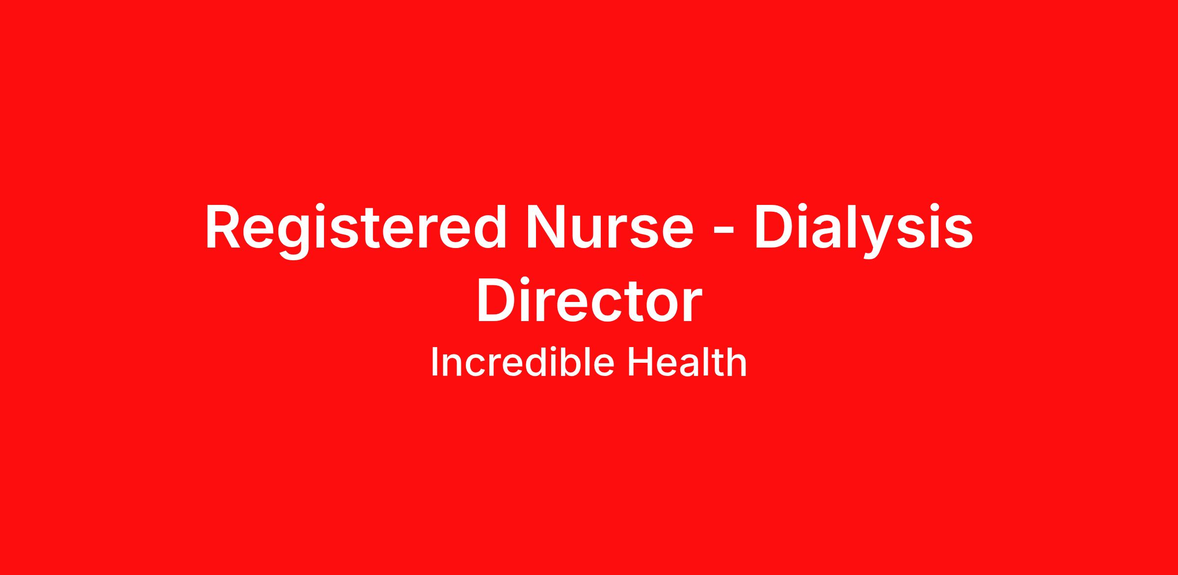 Hospitals on Incredible Health are actively hiring and accepting applications in the Cincinnati, OH area for the following position: Registered Nurse - Dialysis Director. Nurses with experience in any of the following areas are strongly encouraged to apply: Acute dialysis, Assistant Nurse Manager, CNO, Catheter, graph and fistula care, Charge, Clinical Nurse Coordinator, Collect blood vials, Director, Hemodialysis, Manager, Peritoneal dialysis, Supervisor, or VP. Shift(s) available: day shift Job types available: full time, part time, and per diem Employer features: 401(K) & Matching, Adoption Assistance, Career Advance Program, Child Care Benefits, Family Care Benefits, Paid Parental Leave, Tuition Assistance Qualifications: RN Diploma degree or higher from an accredited school of nursing Active and unencumbered Registered Nurse license in the state of Ohio Benefits: Healthcare coverage: Medical, Dental, Vision 401K Paid Time Off Tuition Assistance